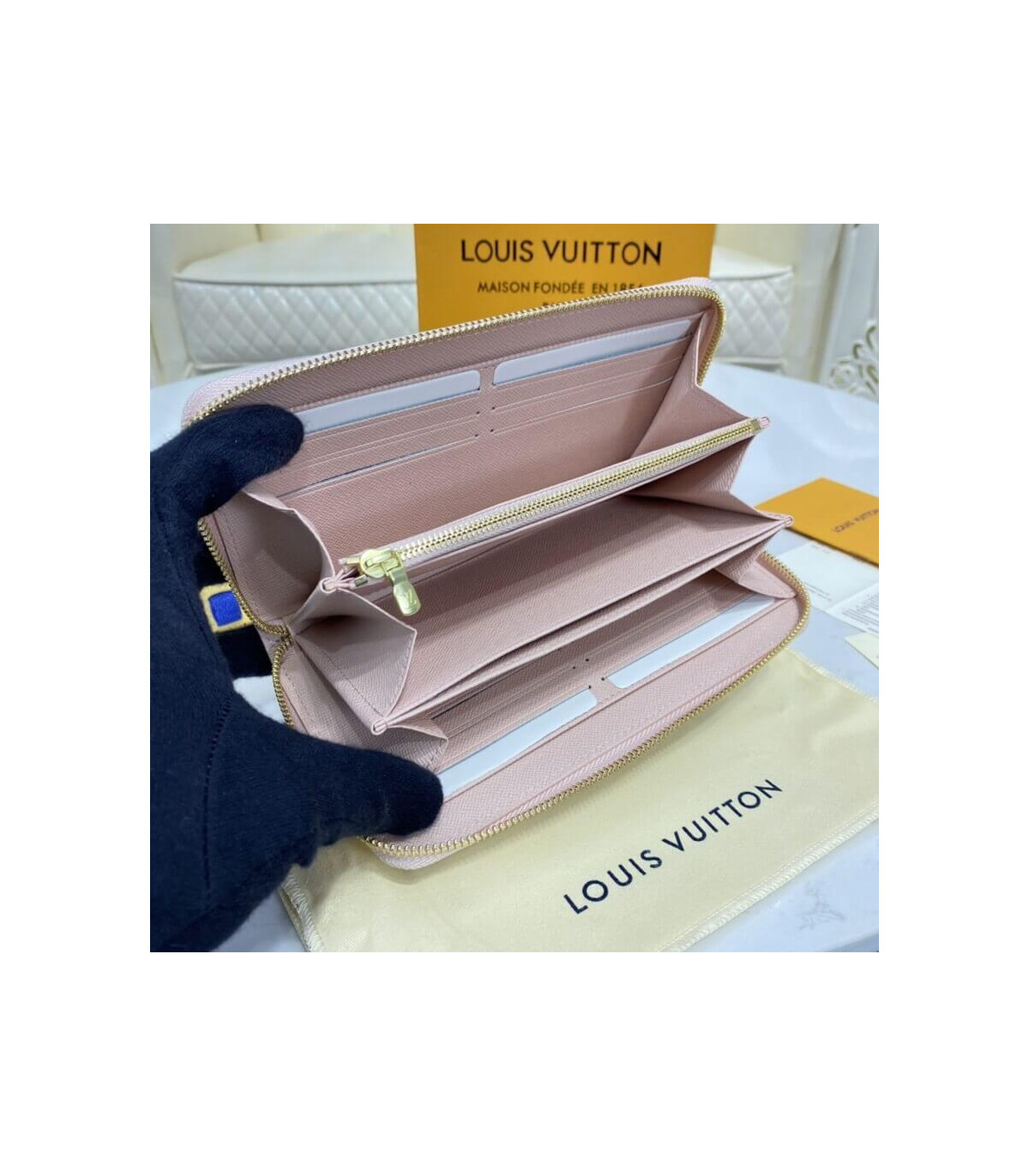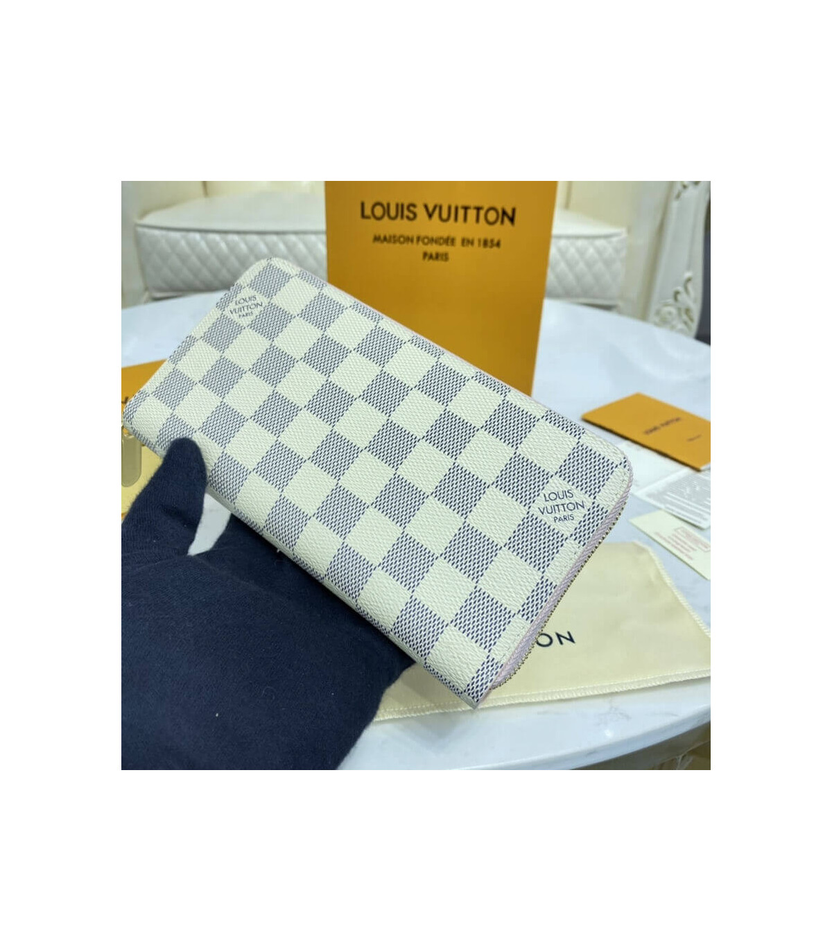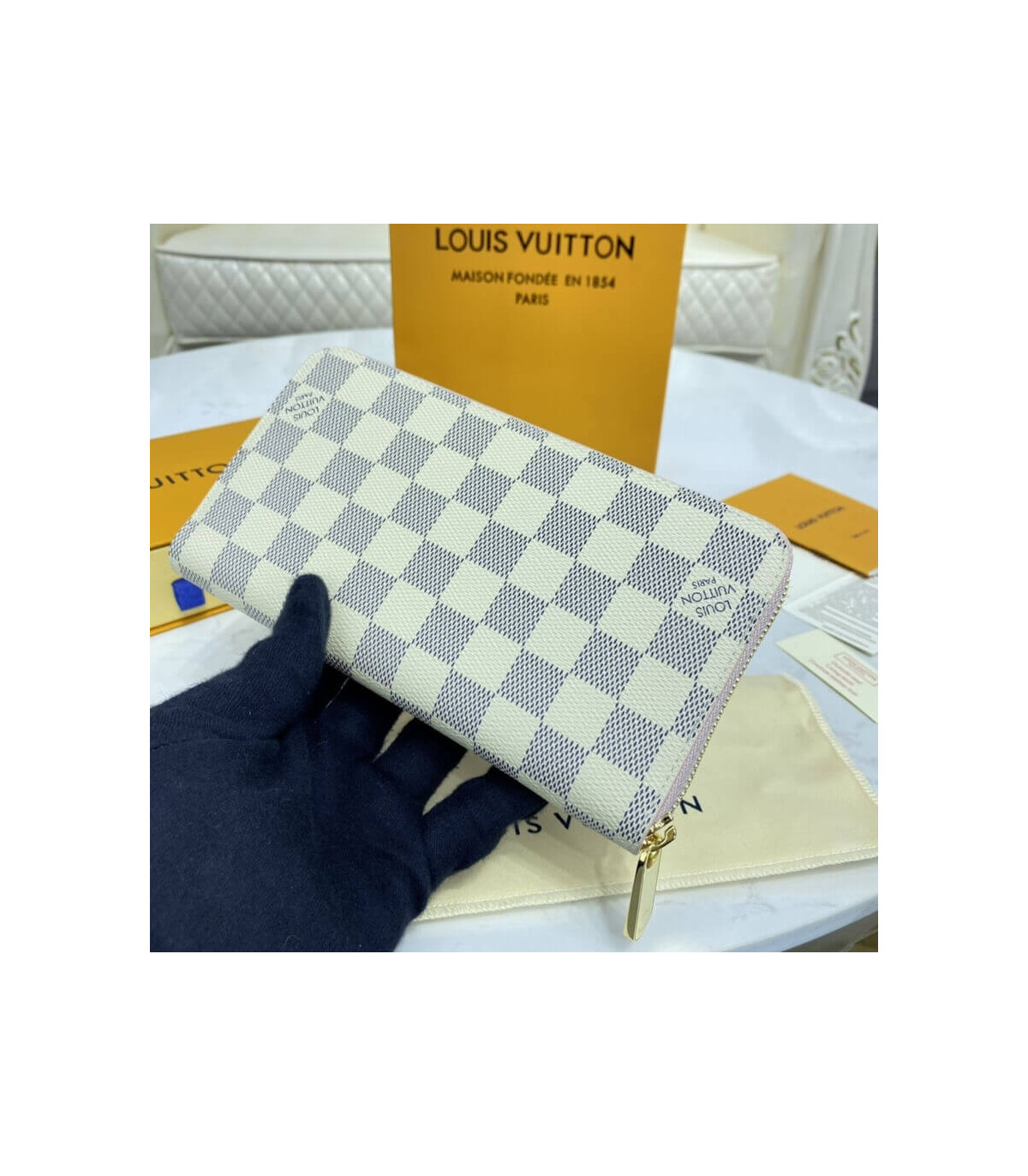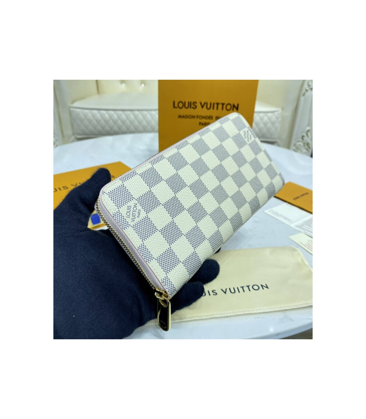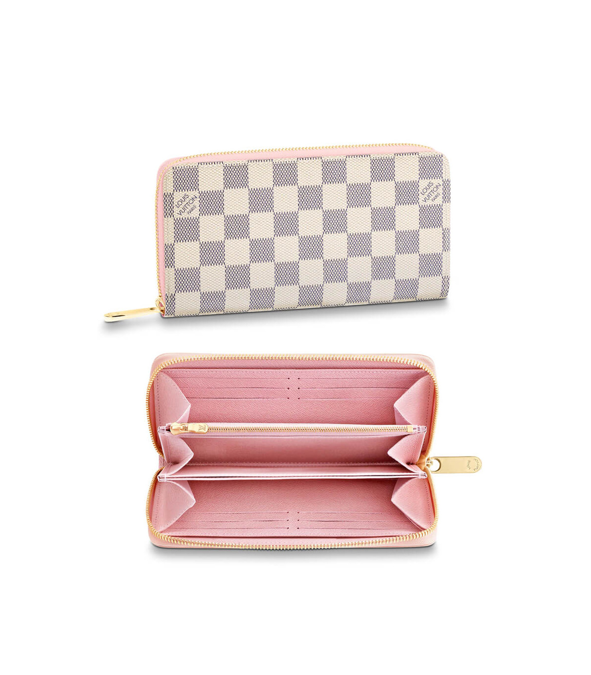 Damier Azur canvas gives a fresh look to Louis Vuitton’s iconic Zippy Wallet, which is famous for its secure, zip-around format. The wallet unzips to reveal a well-organised interior in grained cowhide leather with a variety of pockets, compartments and card slots. This smart design can also be carried as a clutch.