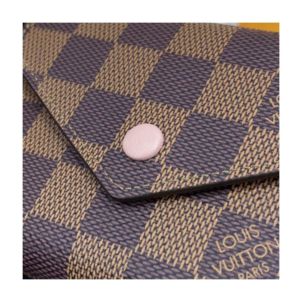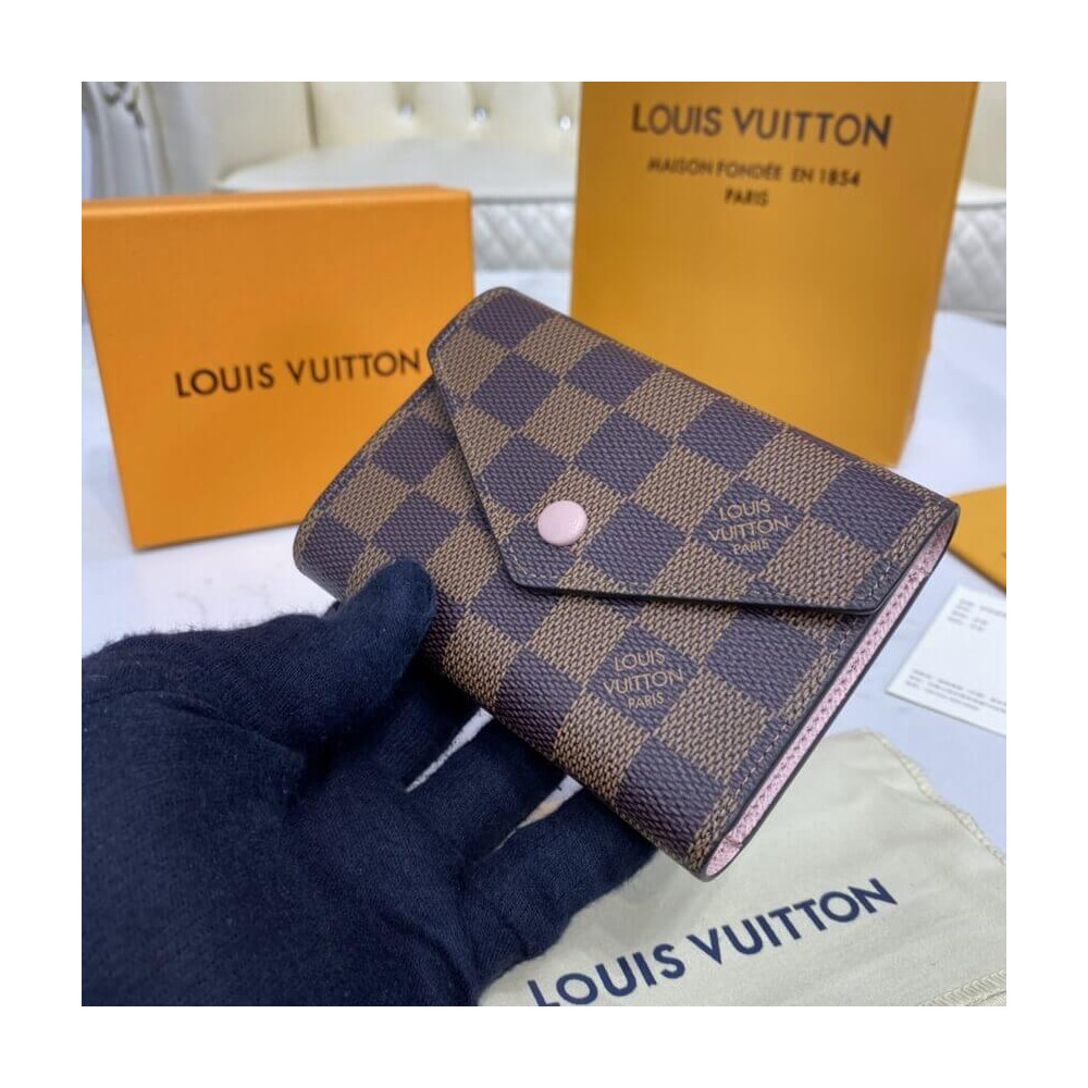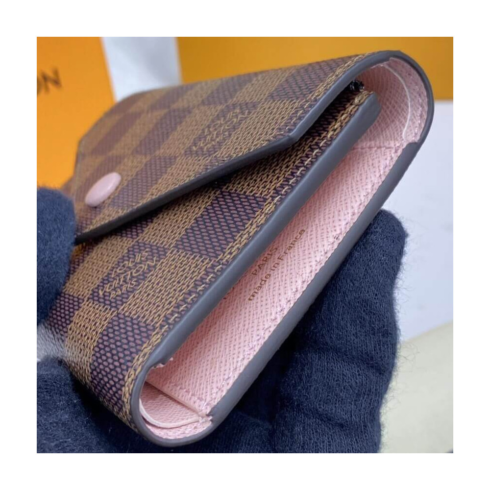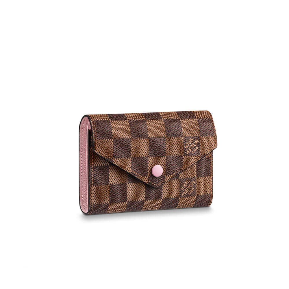 The Victorine wallet in Damier Ebene canvas is a compact, envelope-style design which opens out to reveal a range of practical features, including space for bills and cards, and a zipped coin pocket on the side. Its colorful press-stud and grained-leather lining add a touch of femininity.