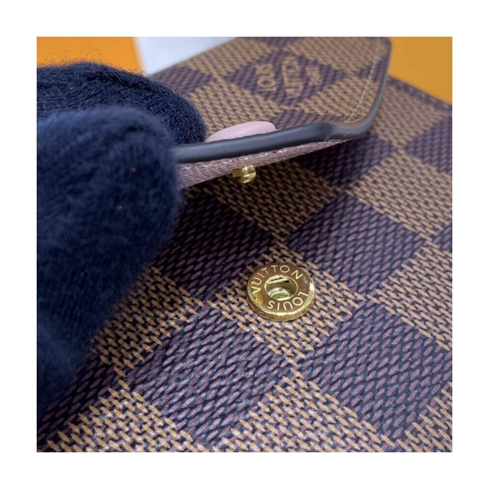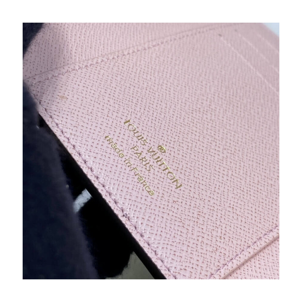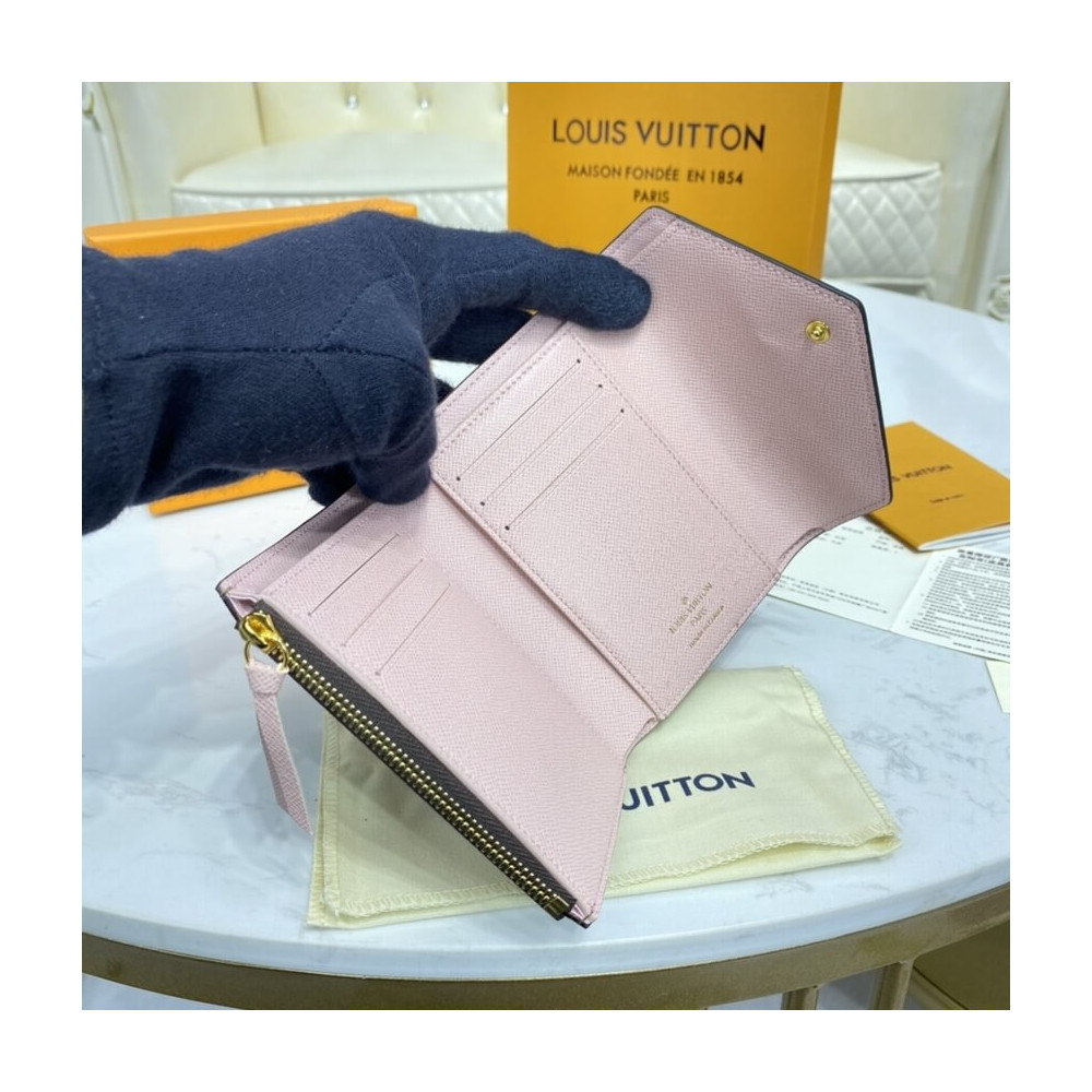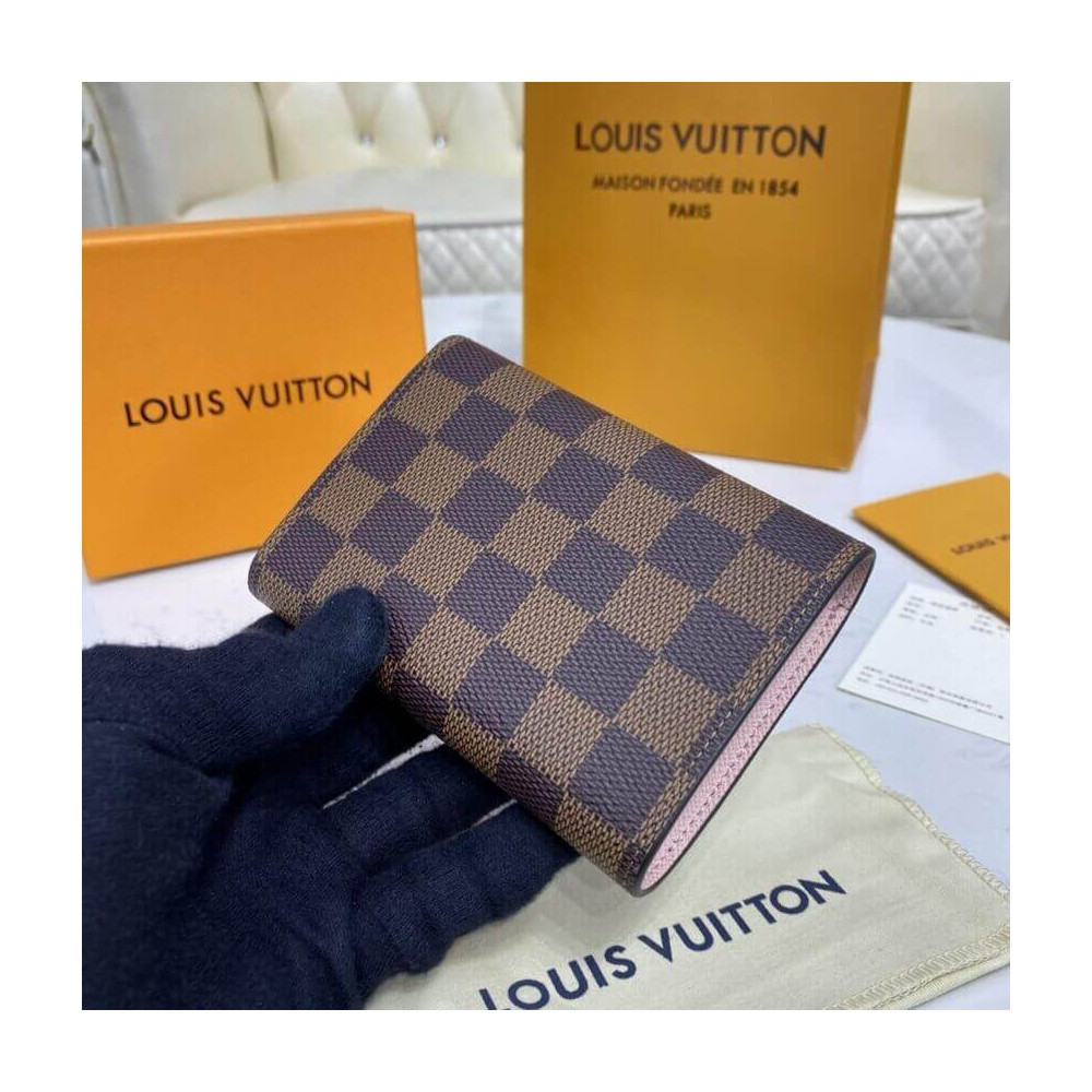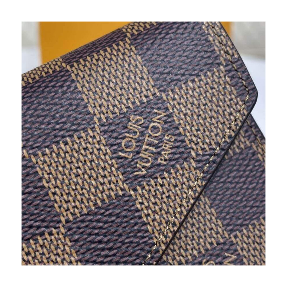 The Victorine wallet in Damier Ebene canvas is a compact, envelope-style design which opens out to reveal a range of practical features, including space for bills and cards, and a zipped coin pocket on the side. Its colorful press-stud and grained-leather lining add a touch of femininity.