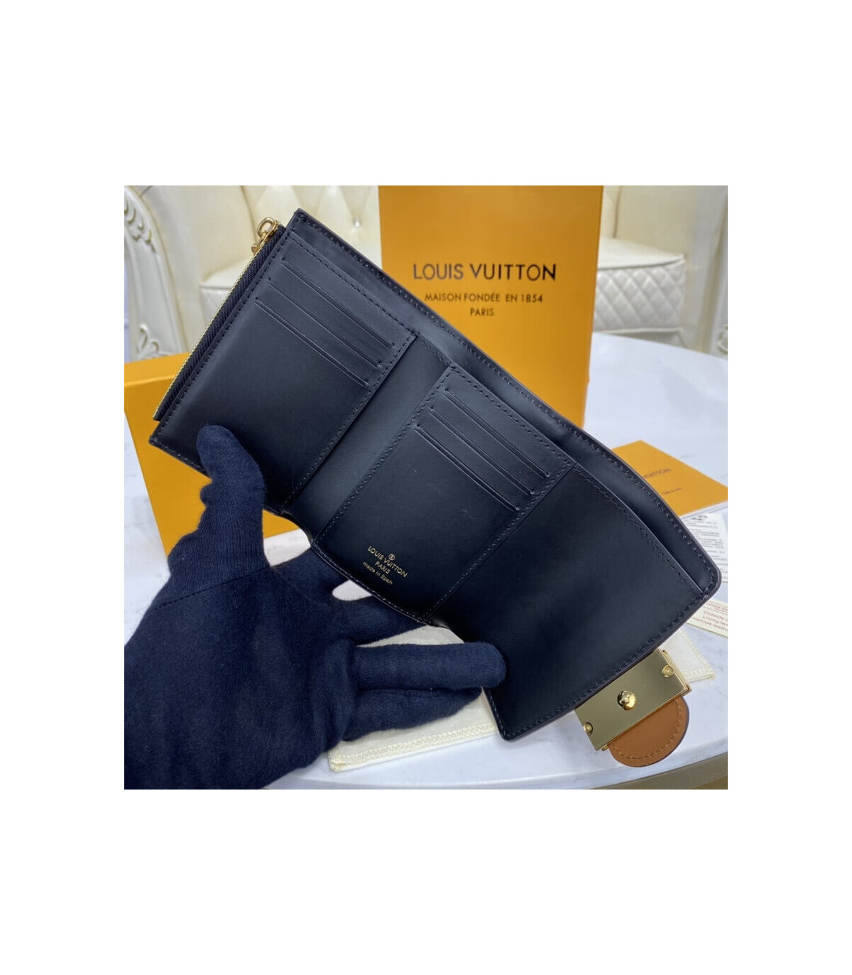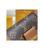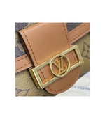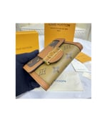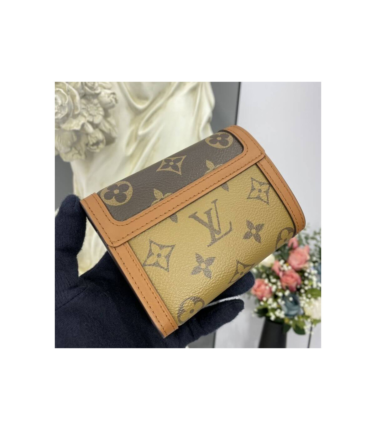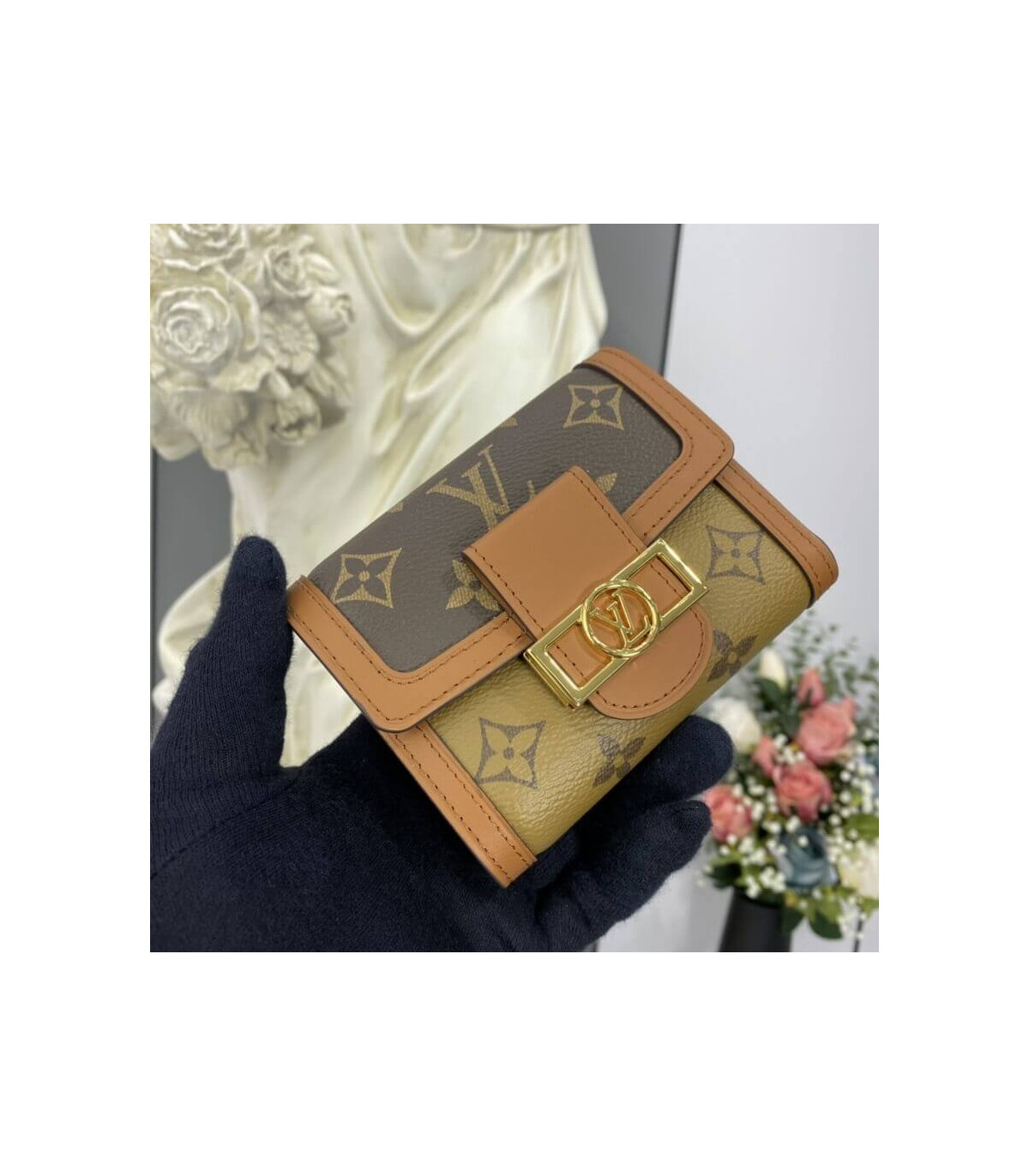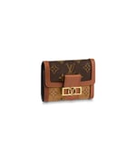 The Dauphine compact wallet takes its style cues from the emblematic Dauphine handbag. Its finely crafted design combines Monogram and Monogram Reverse canvas with calfskin trim, while it is secured by a magnetic Dauphine-signature clasp. This space-efficient wallet features a long pocket for bills and a zipped coin pocket on the side.