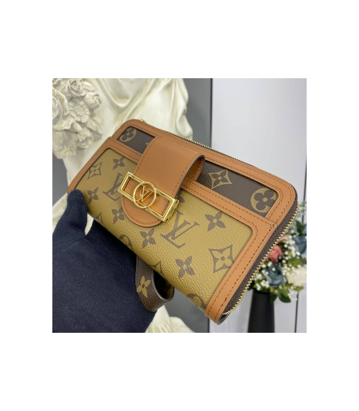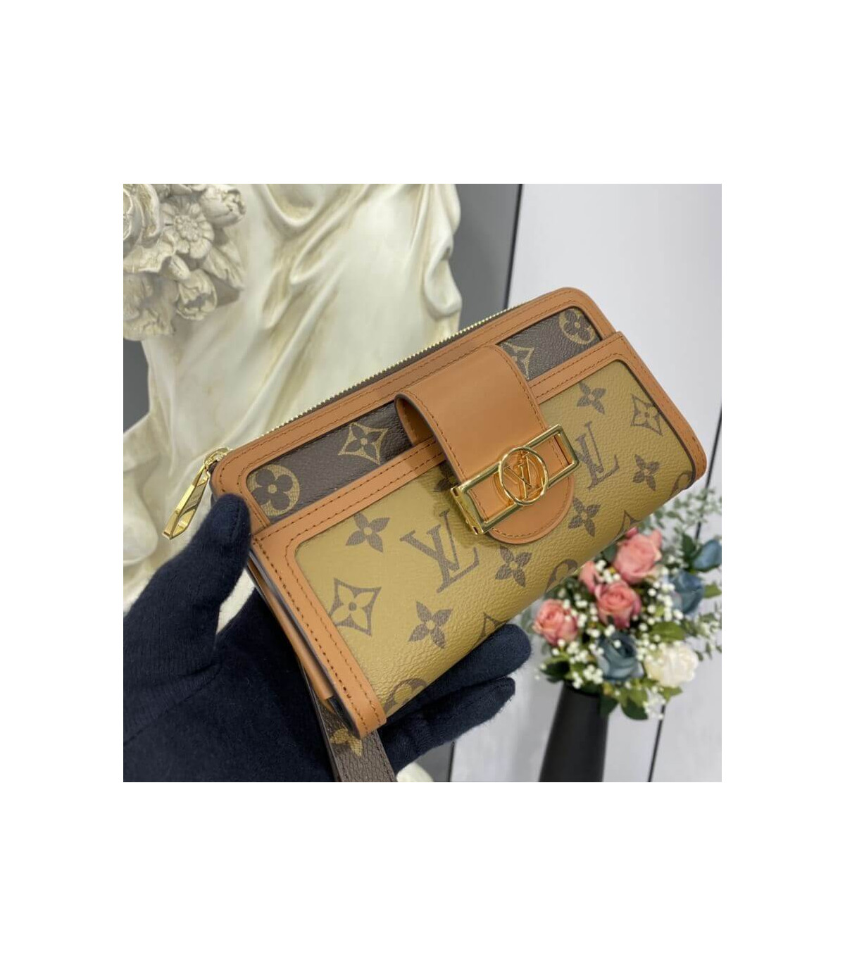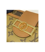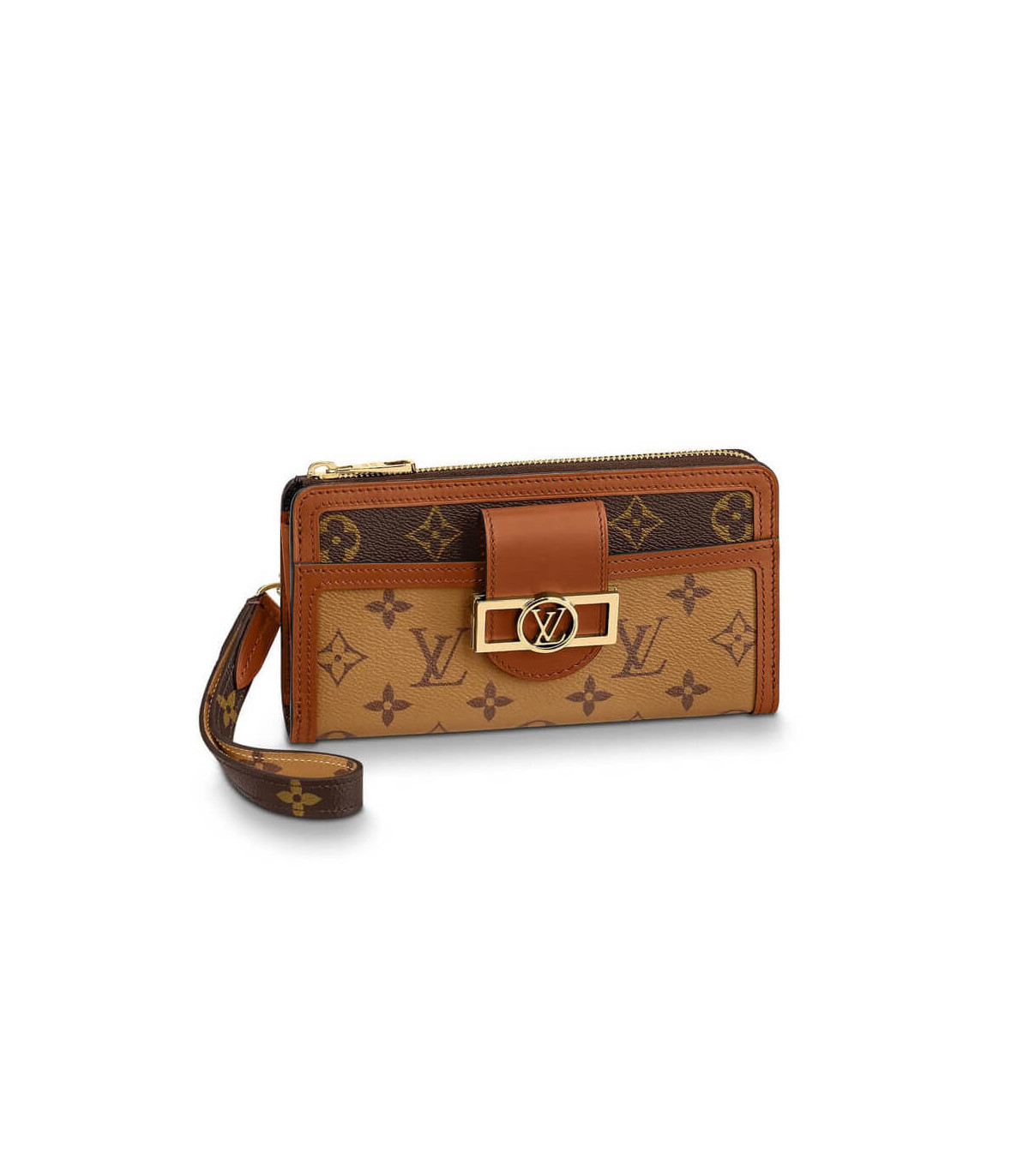 “Zippie Dauphin” is a reinterpretation of the iconic “Zippie Wallet” with the code of the “Dauphin” line. A monogram & monogram reverse canvas combination wallet is finished with a vintage clasp and smooth leather trimming. With a removable wrist strap, it can also be used as a clutch bag. The interior, which can store two smartphones, has a wealth of practical functions.