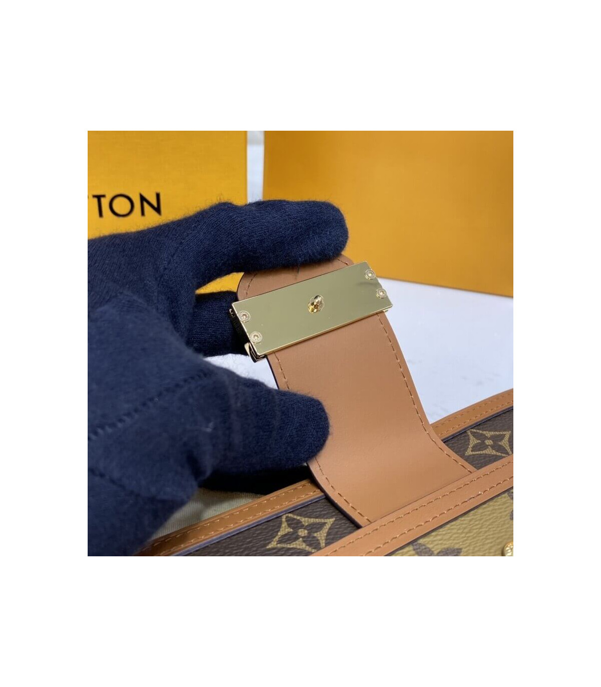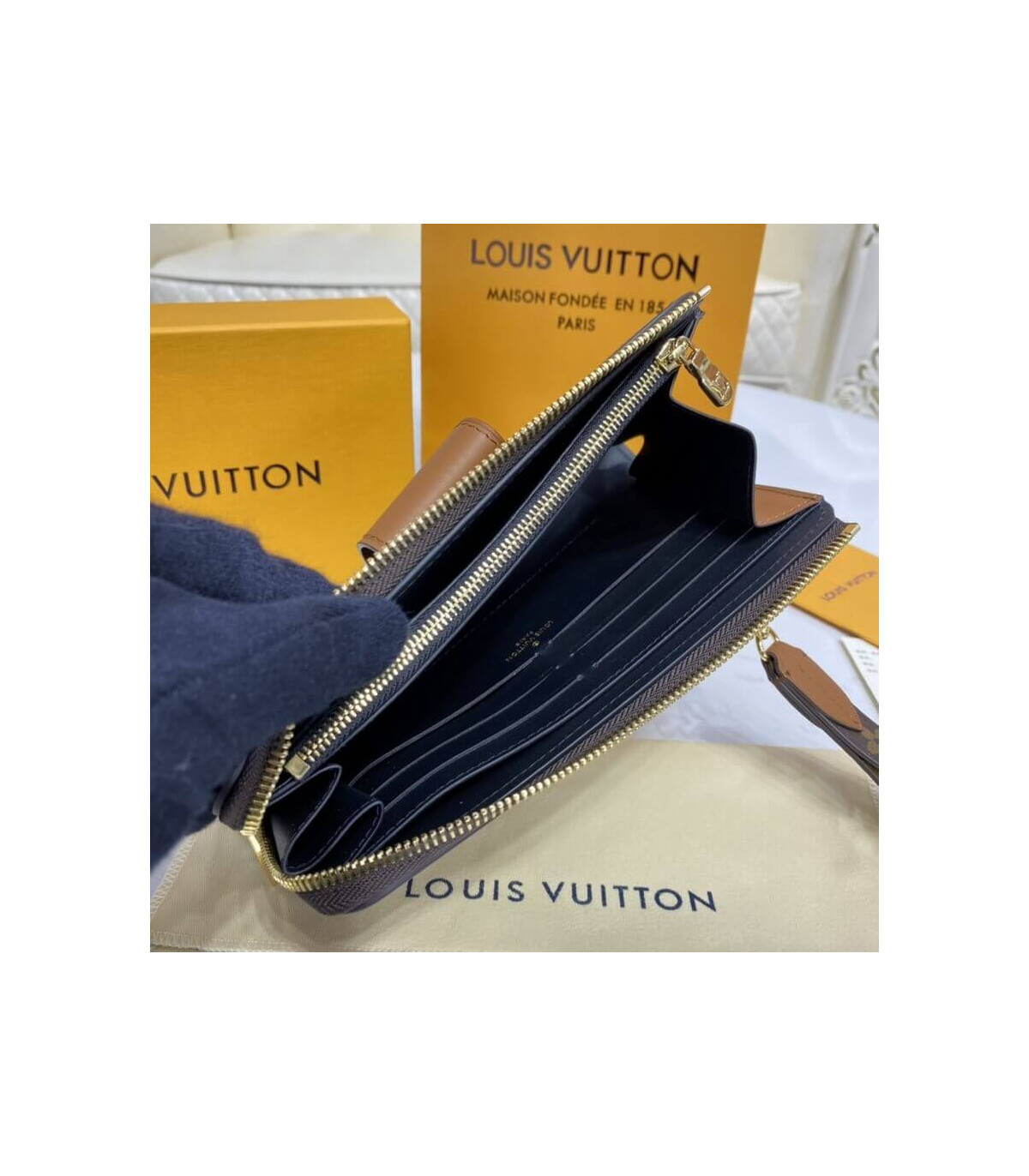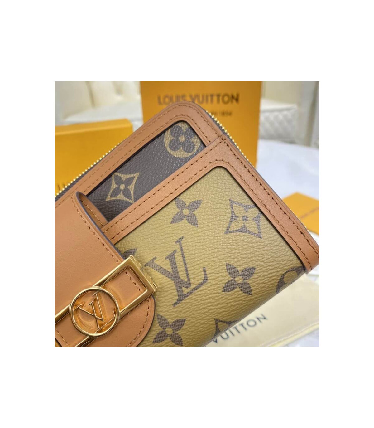 “Zippie Dauphin” is a reinterpretation of the iconic “Zippie Wallet” with the code of the “Dauphin” line. A monogram & monogram reverse canvas combination wallet is finished with a vintage clasp and smooth leather trimming. With a removable wrist strap, it can also be used as a clutch bag. The interior, which can store two smartphones, has a wealth of practical functions.
