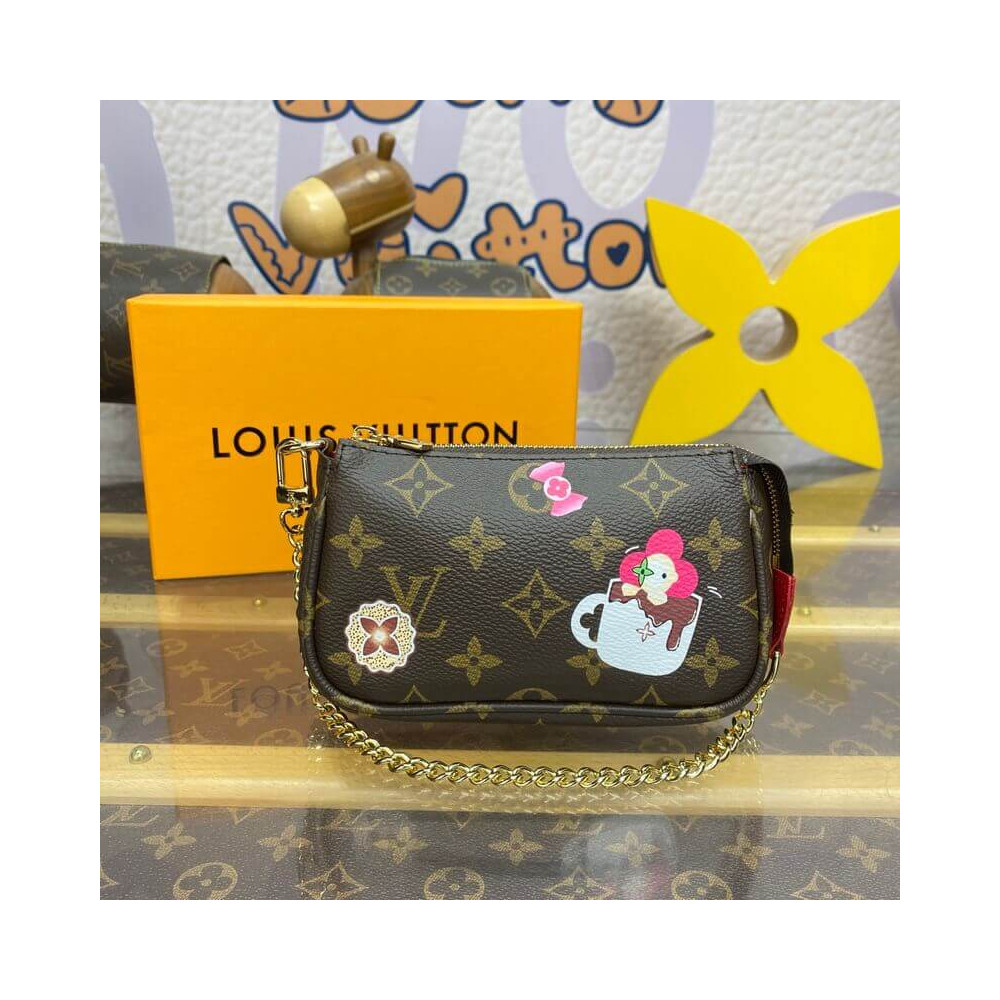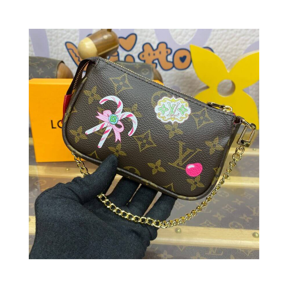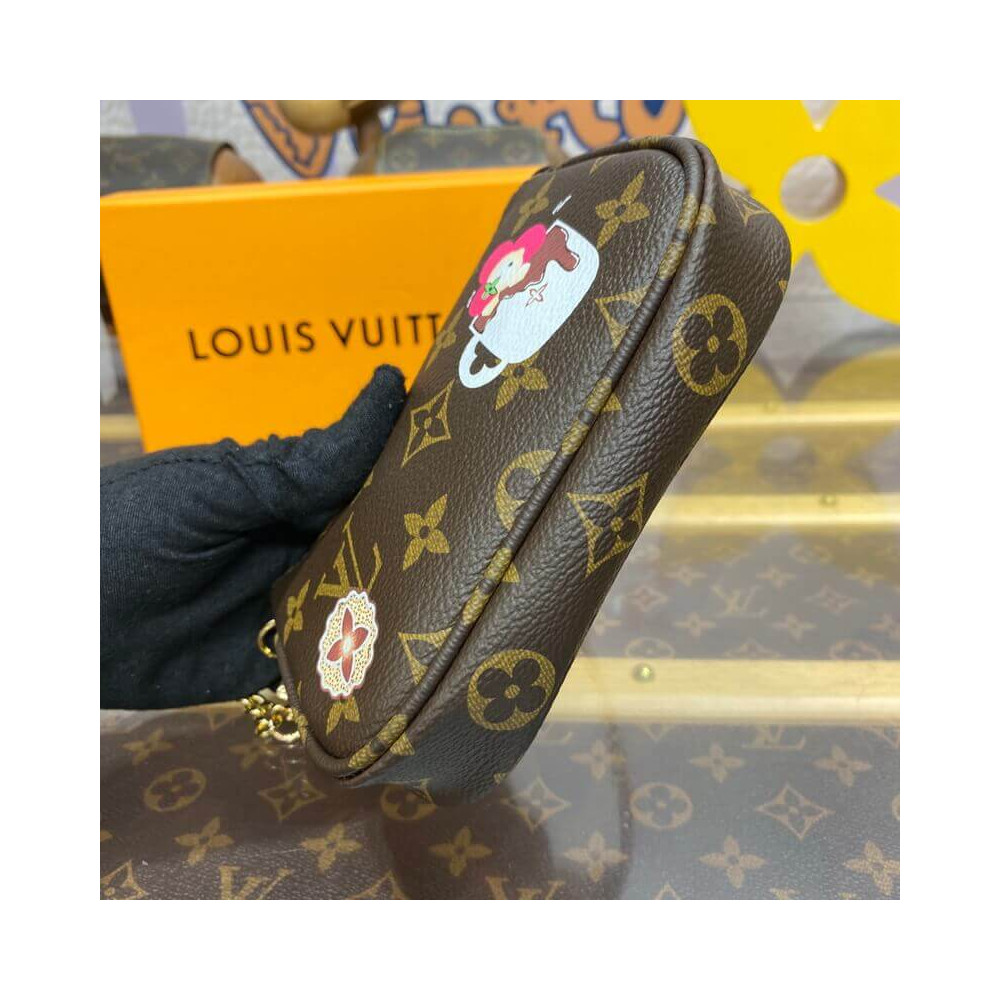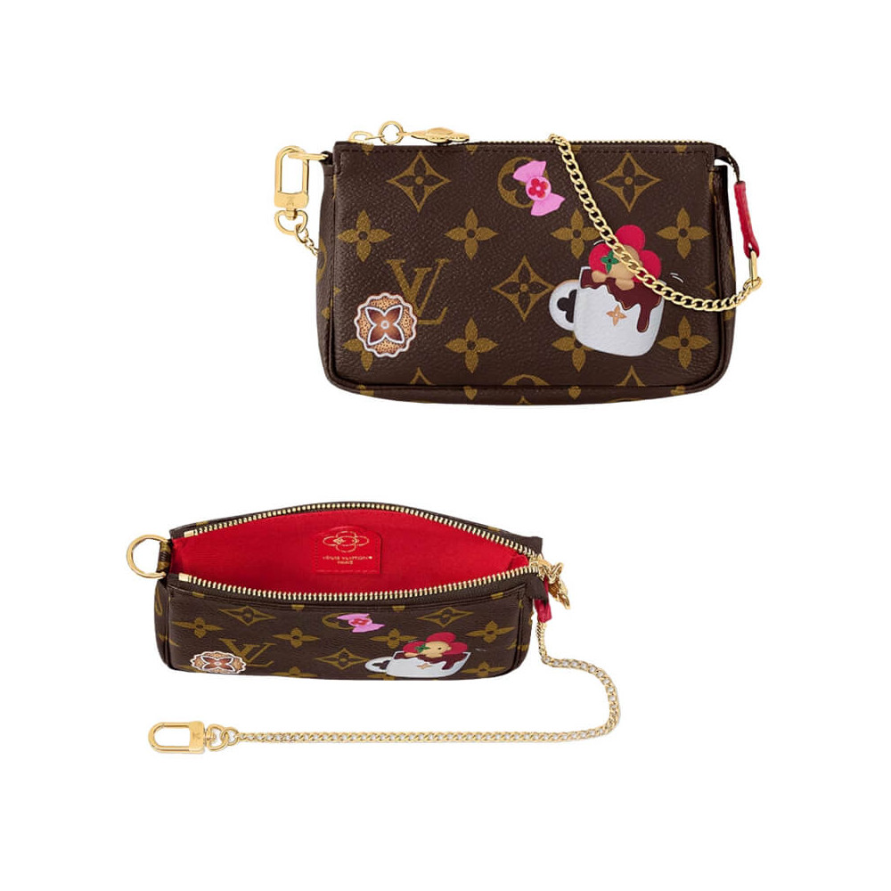 The glamorous Mini Pochette Accessoires, part of the Candy Factory collection, is adorned with adorable illustrations, including the iconic mascot Vivienne peeking out of a cup of hot cocoa. The bag is made from the signature Monogram canvas and lined in a bold candy red color. It also features a gold-colored hook chain and a zipper puller with Vivienne’s face.