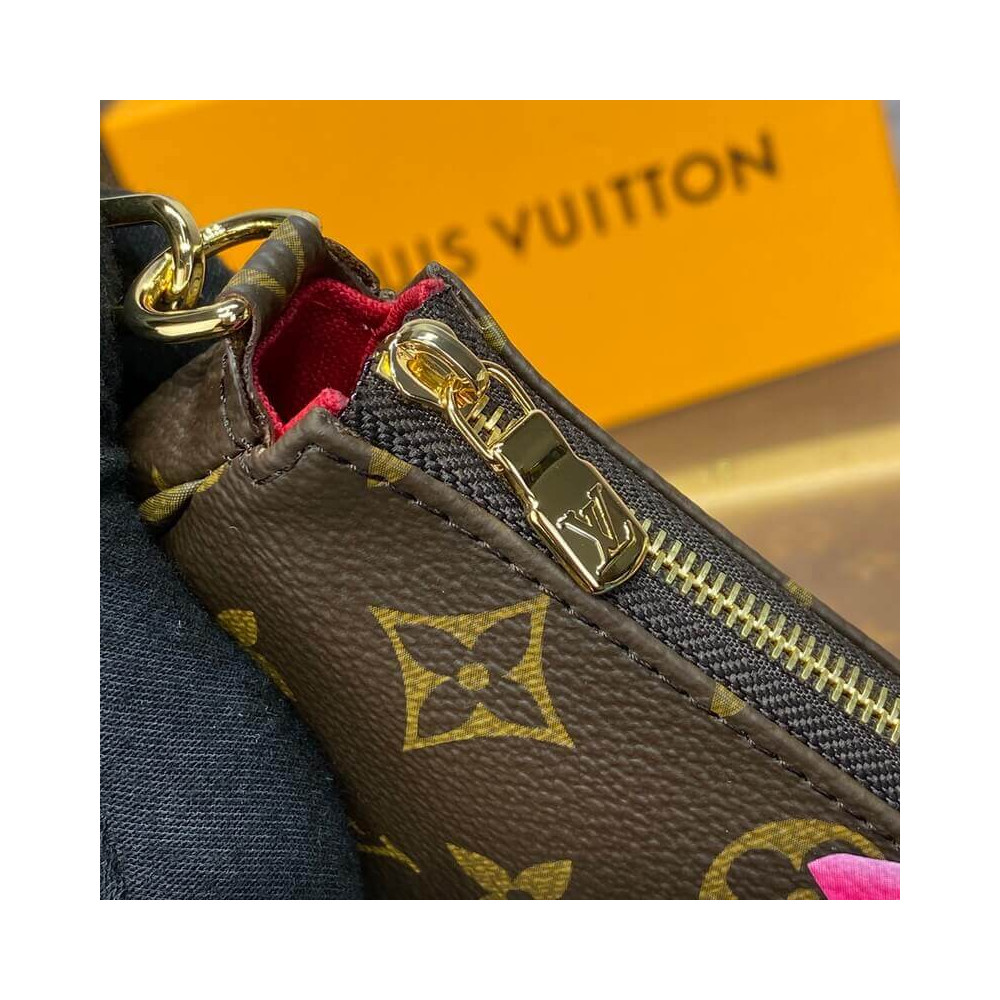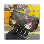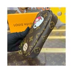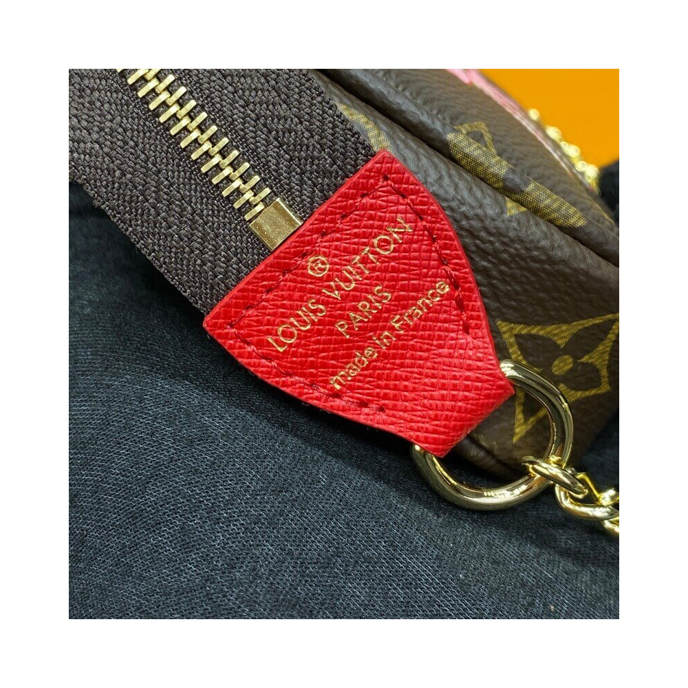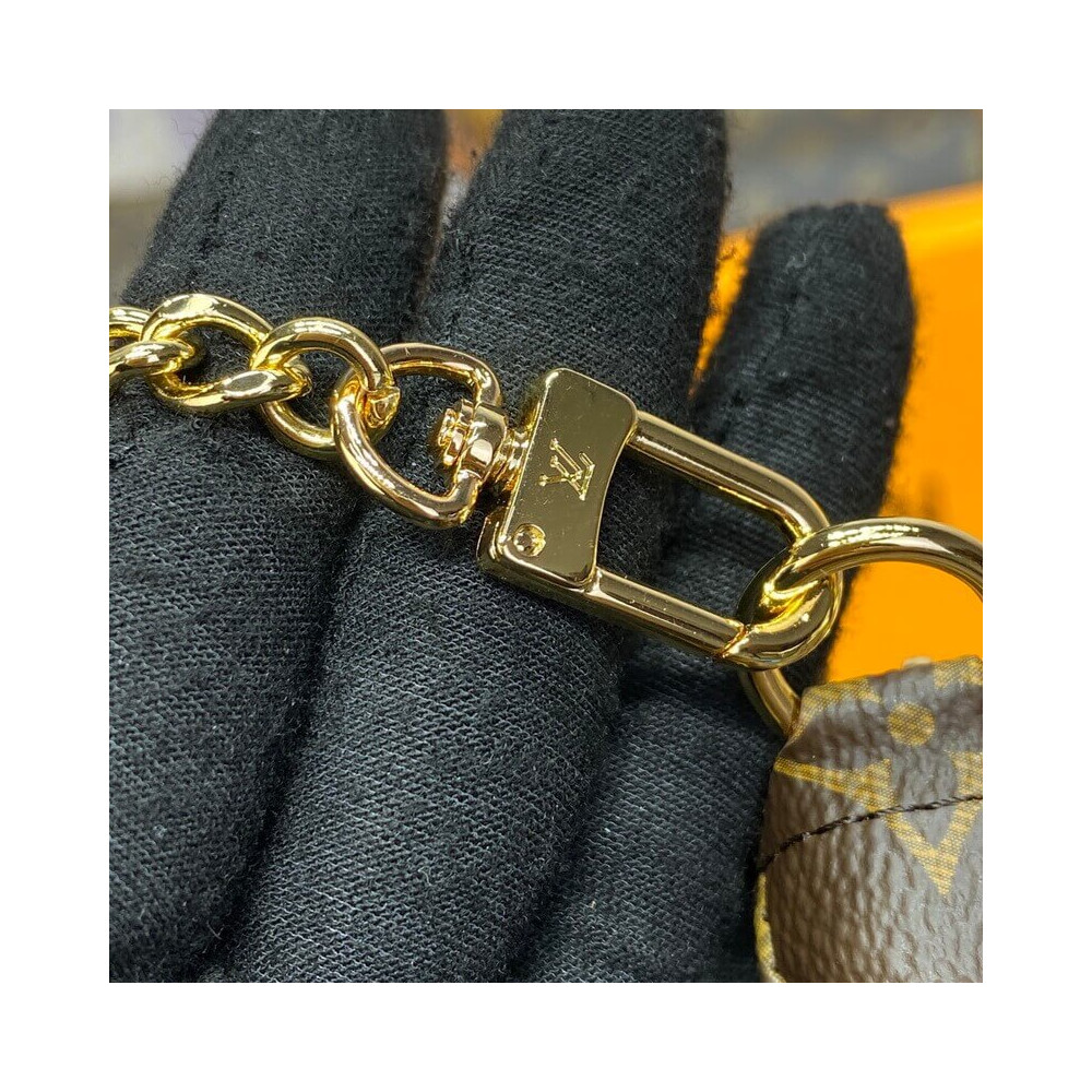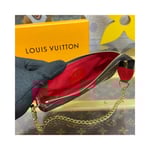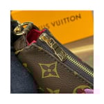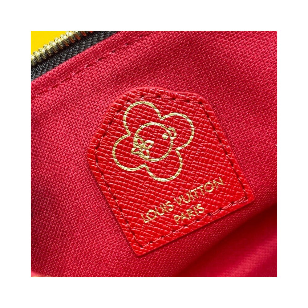The glamorous Mini Pochette Accessoires, part of the Candy Factory collection, is adorned with adorable illustrations, including the iconic mascot Vivienne peeking out of a cup of hot cocoa. The bag is made from the signature Monogram canvas and lined in a bold candy red color. It also features a gold-colored hook chain and a zipper puller with Vivienne’s face.