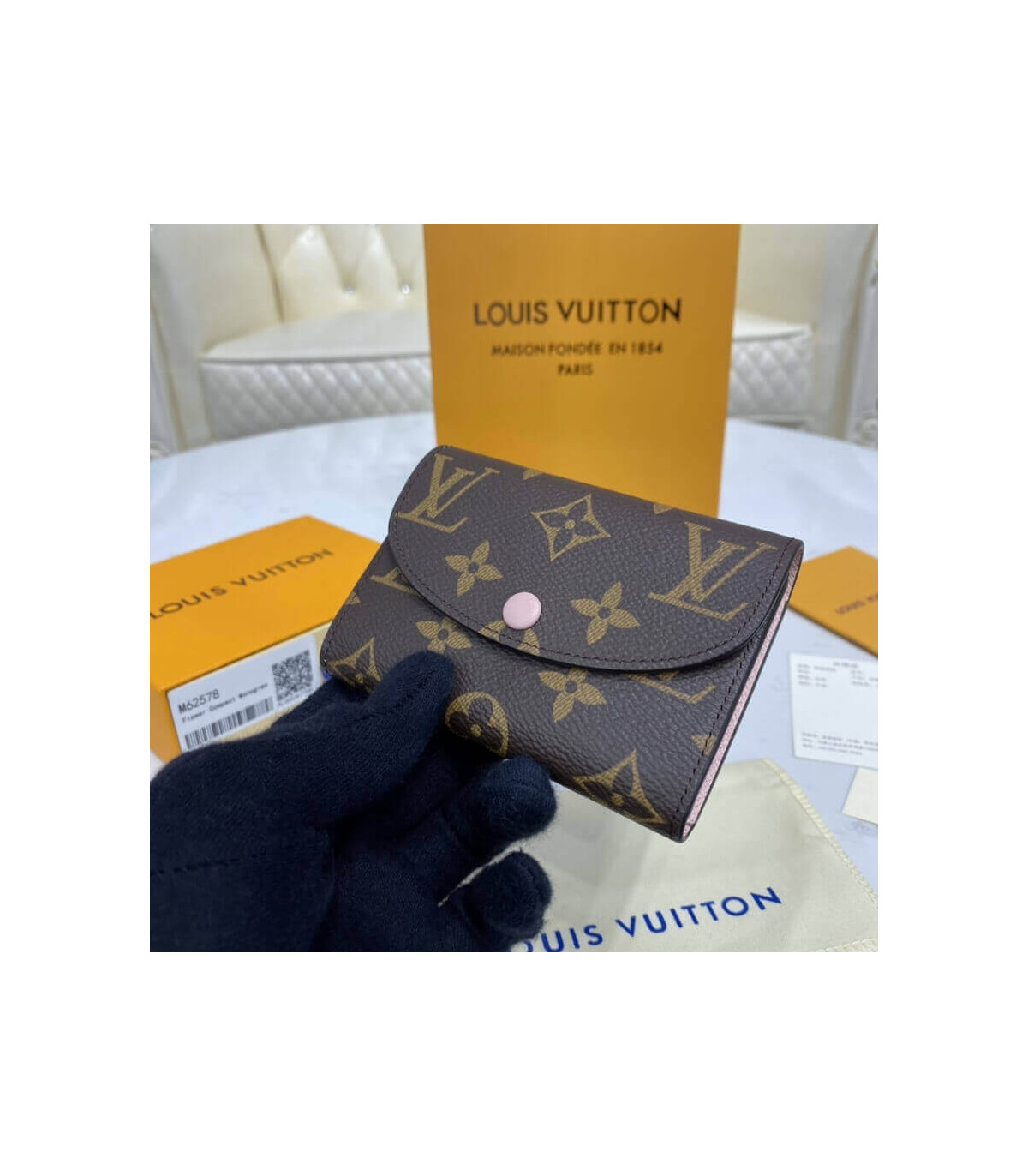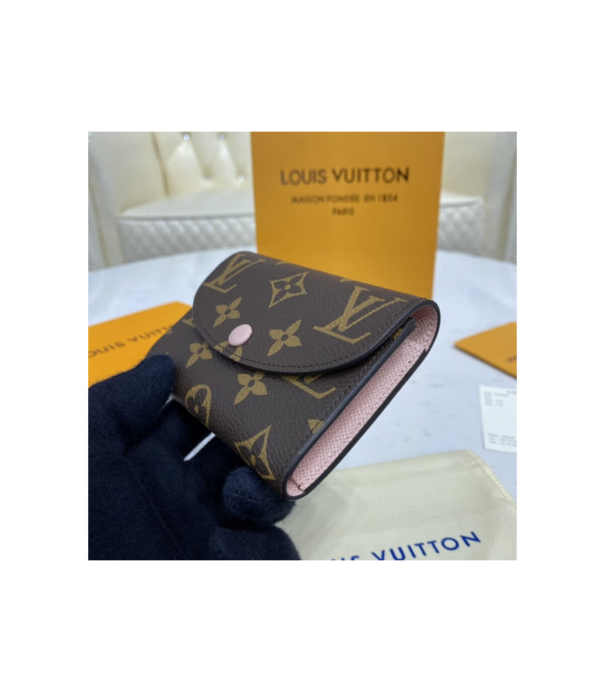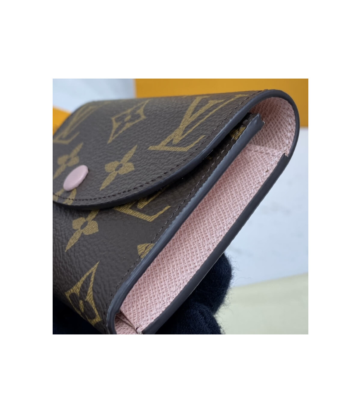 The tiny Rosalie coin purse in Monogram canvas is given a feminine feel by its colorful press-stud and grained-leather lining. For such a compact design, it is surprisingly spacious, containing a gusseted compartment, two card slots and a zipped coin pocket with a leather pull.
