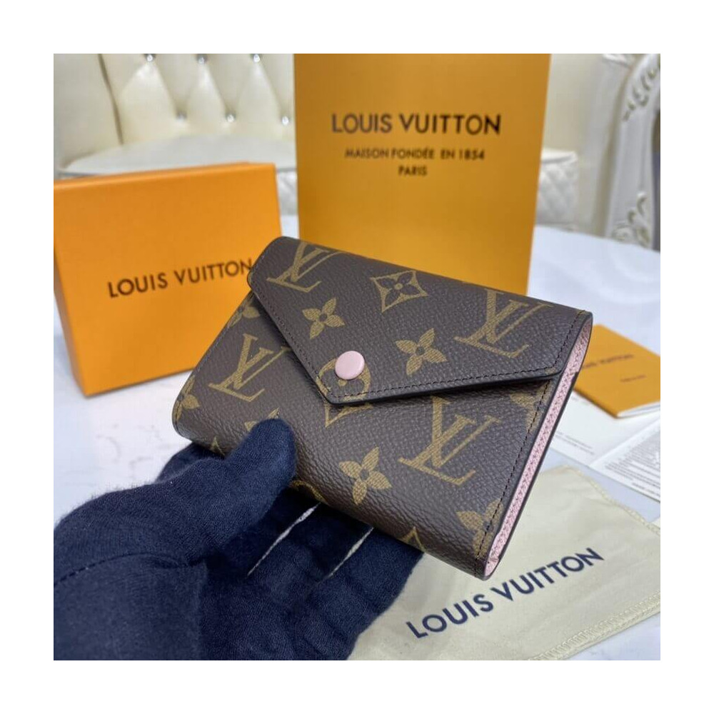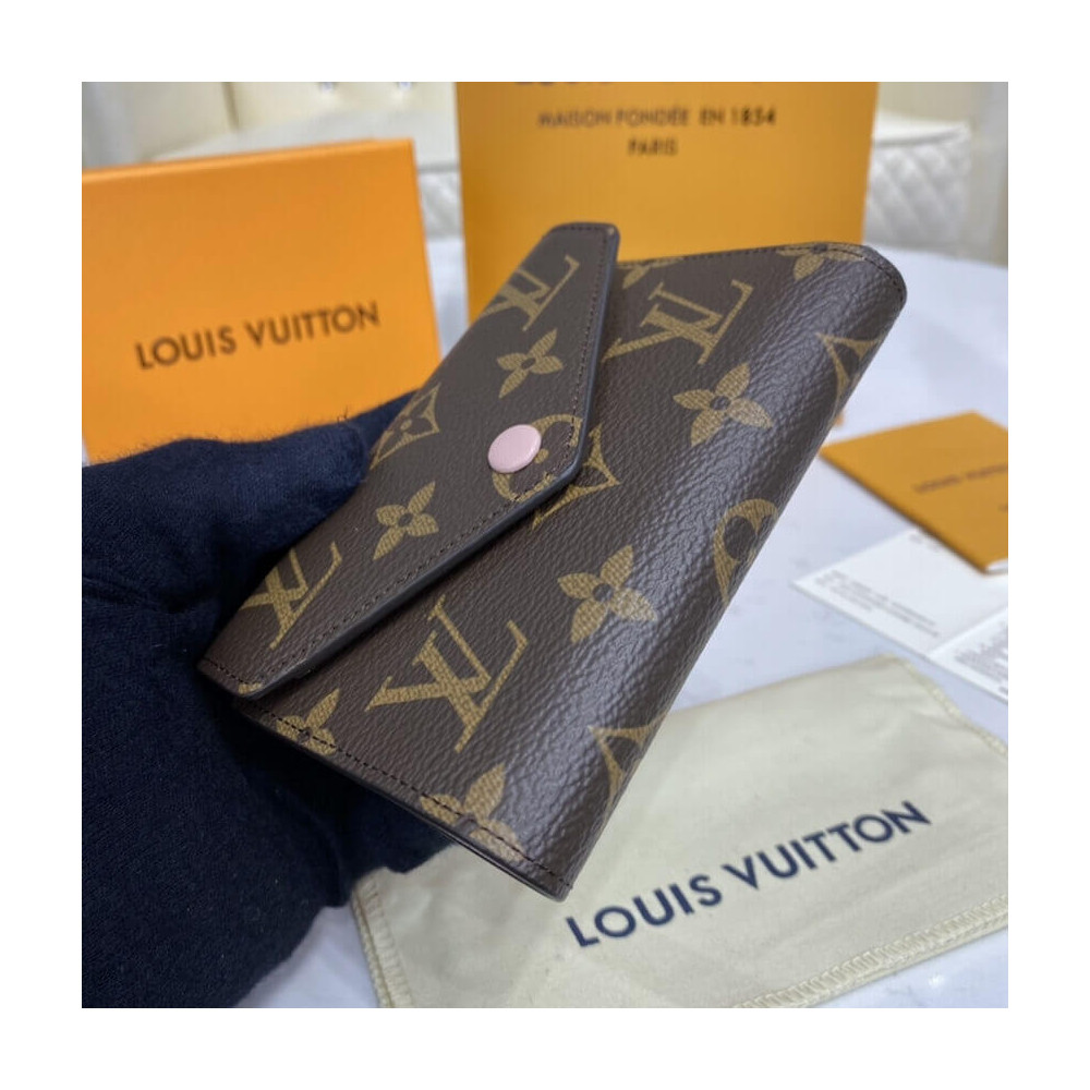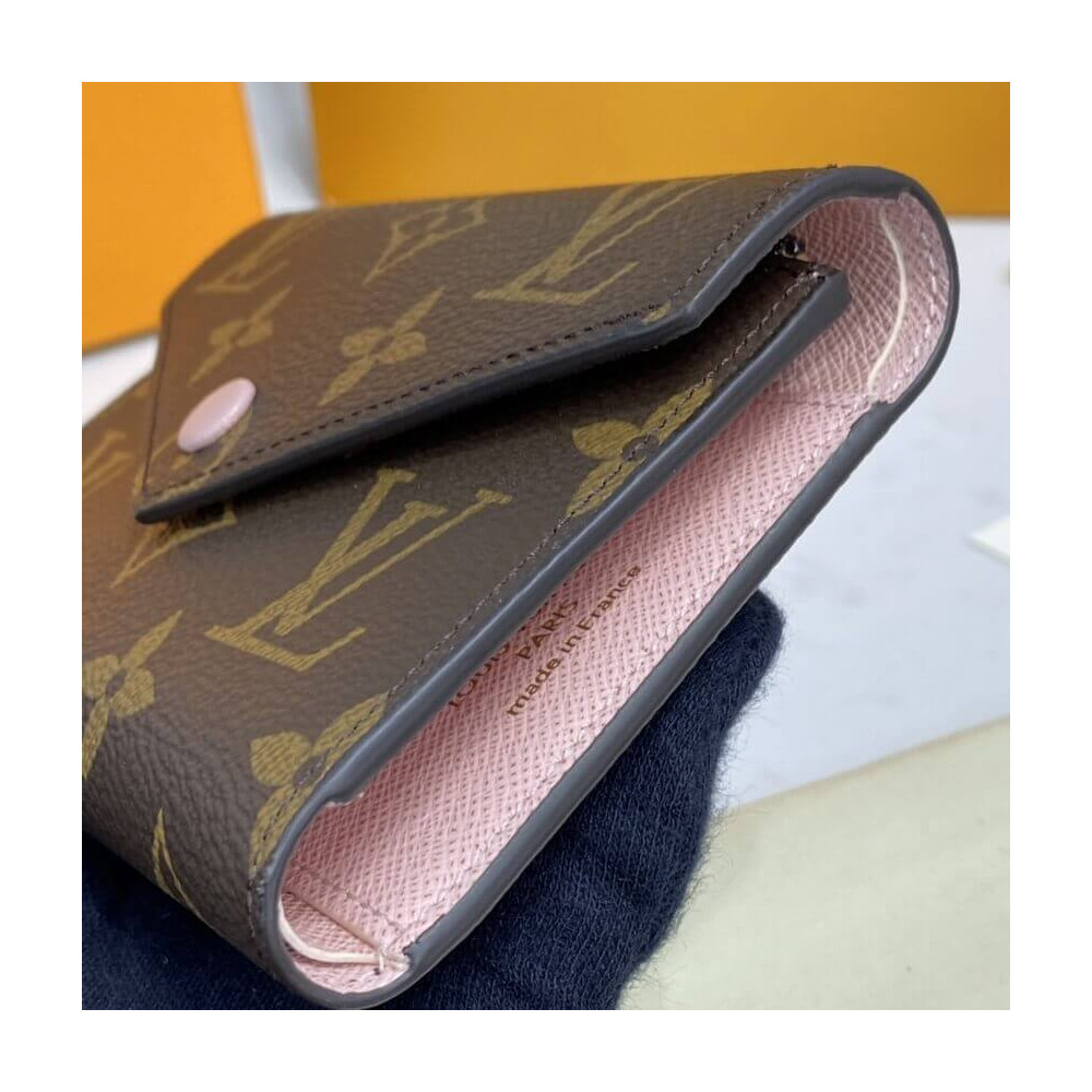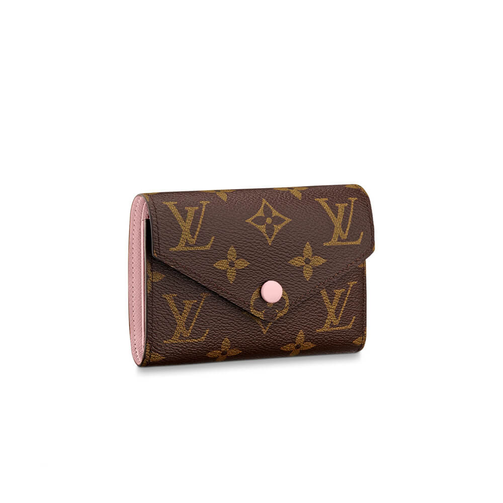 The compact Victorine wallet in Monogram canvas combines femininity and functionality. It opens out to reveal many practical features, including card slots and pockets for bills and coins. Its envelope-style flap is sealed with a press-stud, which is color-matched with the grained-leather lining.