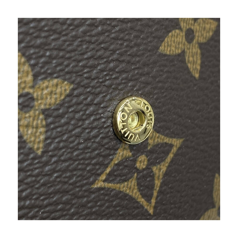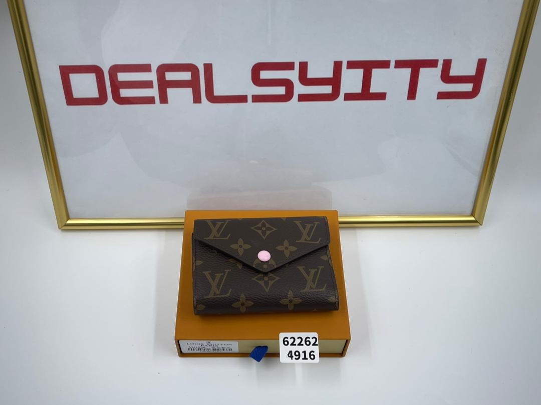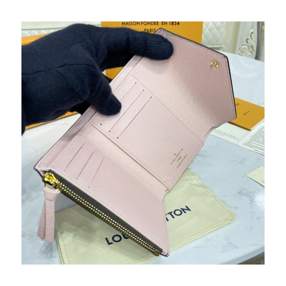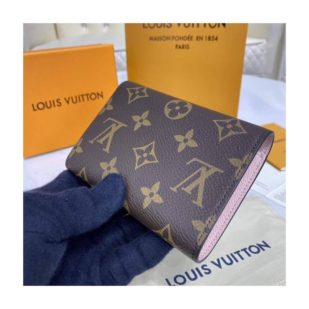 The compact Victorine wallet in Monogram canvas combines femininity and functionality. It opens out to reveal many practical features, including card slots and pockets for bills and coins. Its envelope-style flap is sealed with a press-stud, which is color-matched with the grained-leather lining.