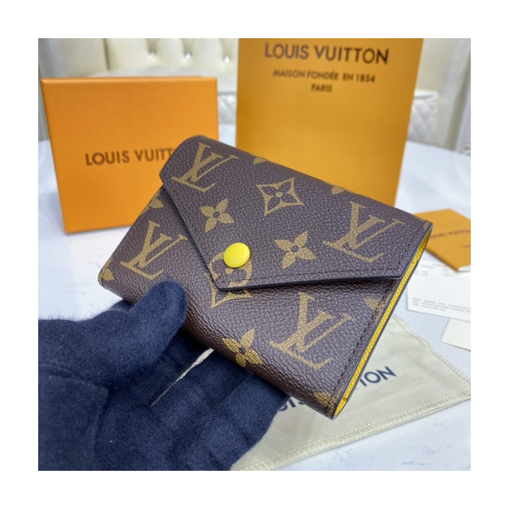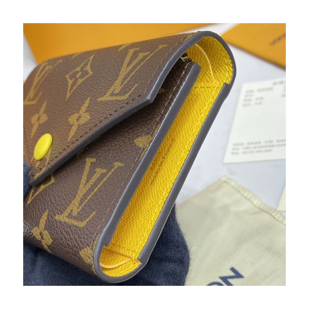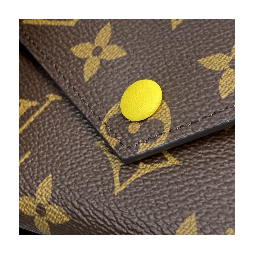 The compact Victorine wallet in Monogram canvas combines femininity and functionality. It opens out to reveal many practical features, including card slots and pockets for bills and coins. Its envelope-style flap is sealed with a press-stud, which is color-matched with the grained-leather lining.