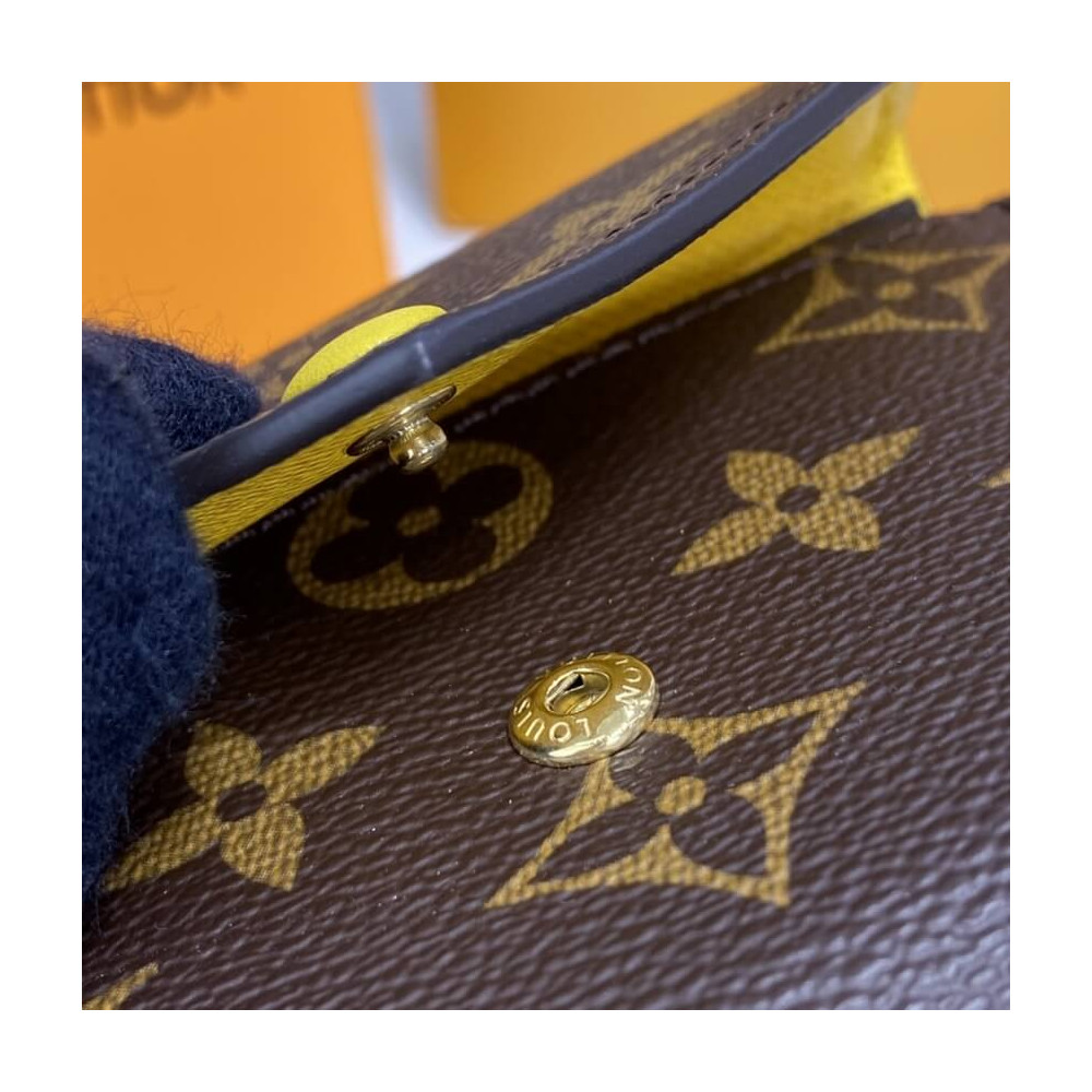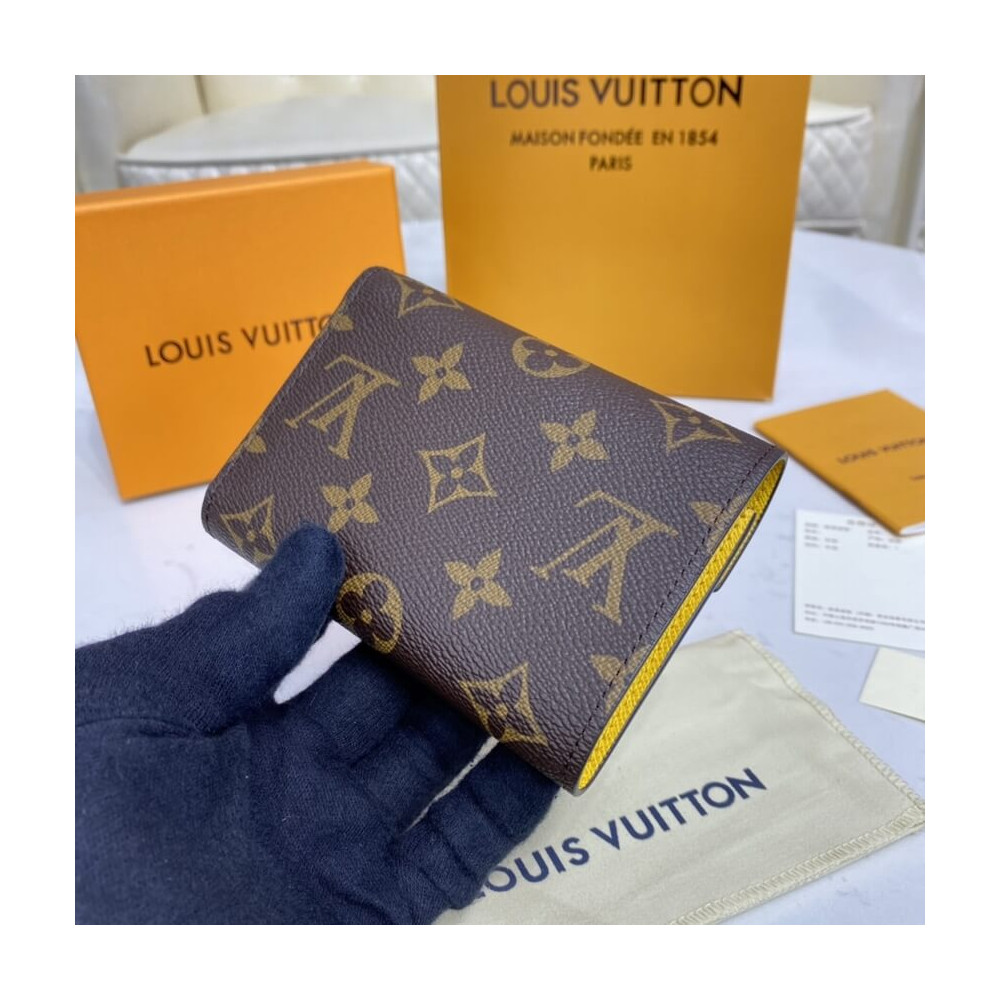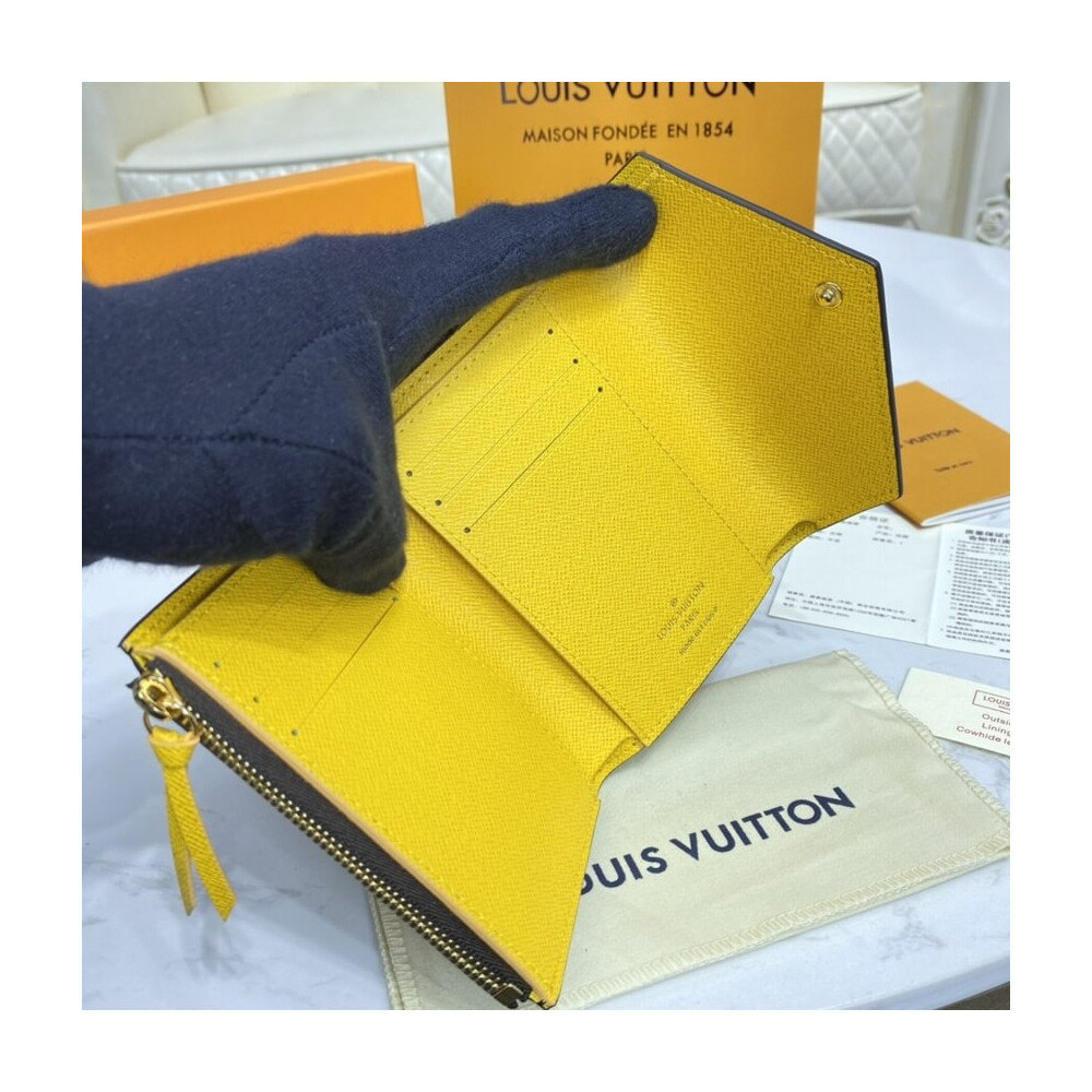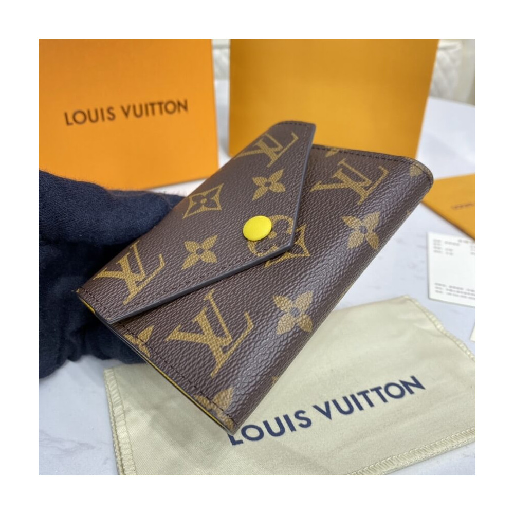 The compact Victorine wallet in Monogram canvas combines femininity and functionality. It opens out to reveal many practical features, including card slots and pockets for bills and coins. Its envelope-style flap is sealed with a press-stud, which is color-matched with the grained-leather lining.