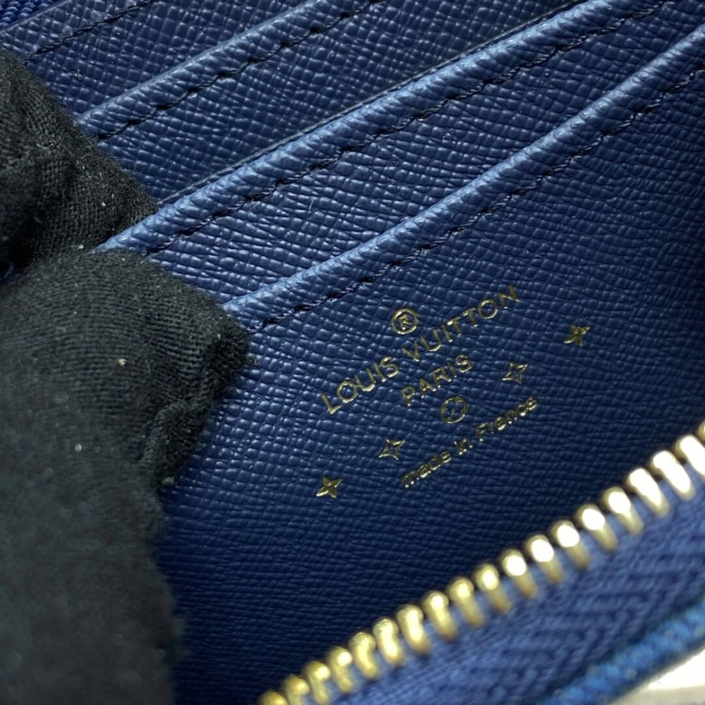 The Lou Wallet is made from Monogram Denim with the Monogram pattern woven into the organic cotton and features a gold-color zipper with a golden LV Circle zip pull. This compact wallet has six card slots and a compartment for banknotes, as well as a zipped pocket on the side for coins.