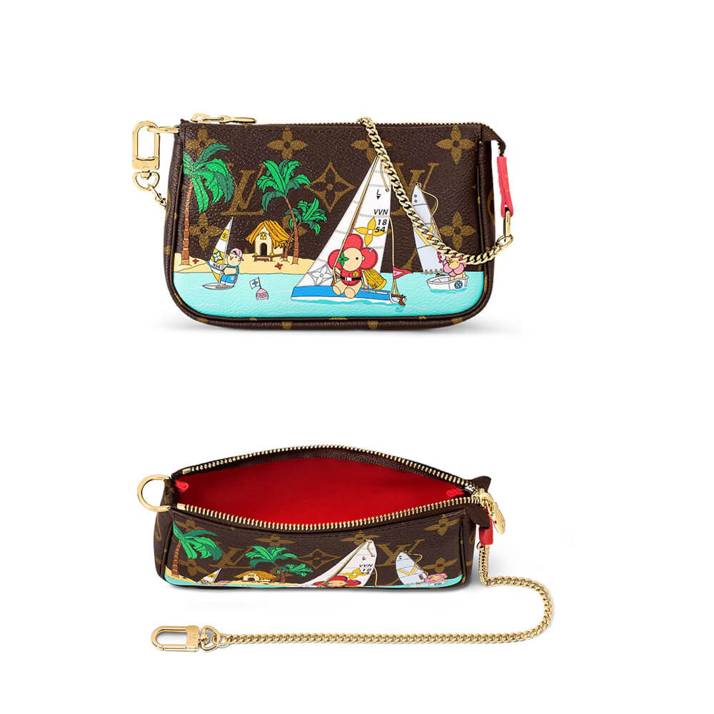 For winter 2023, the Mini Pochette Accessoires in Monogram canvas features an exclusive print celebrating the joy of sport. The print shows Louis Vuitton mascot Vivienne sailing with her friends in front of a tropical beach. This collectible mini pouch, with a vivid dragon-fruit pink lining, makes a great gift.