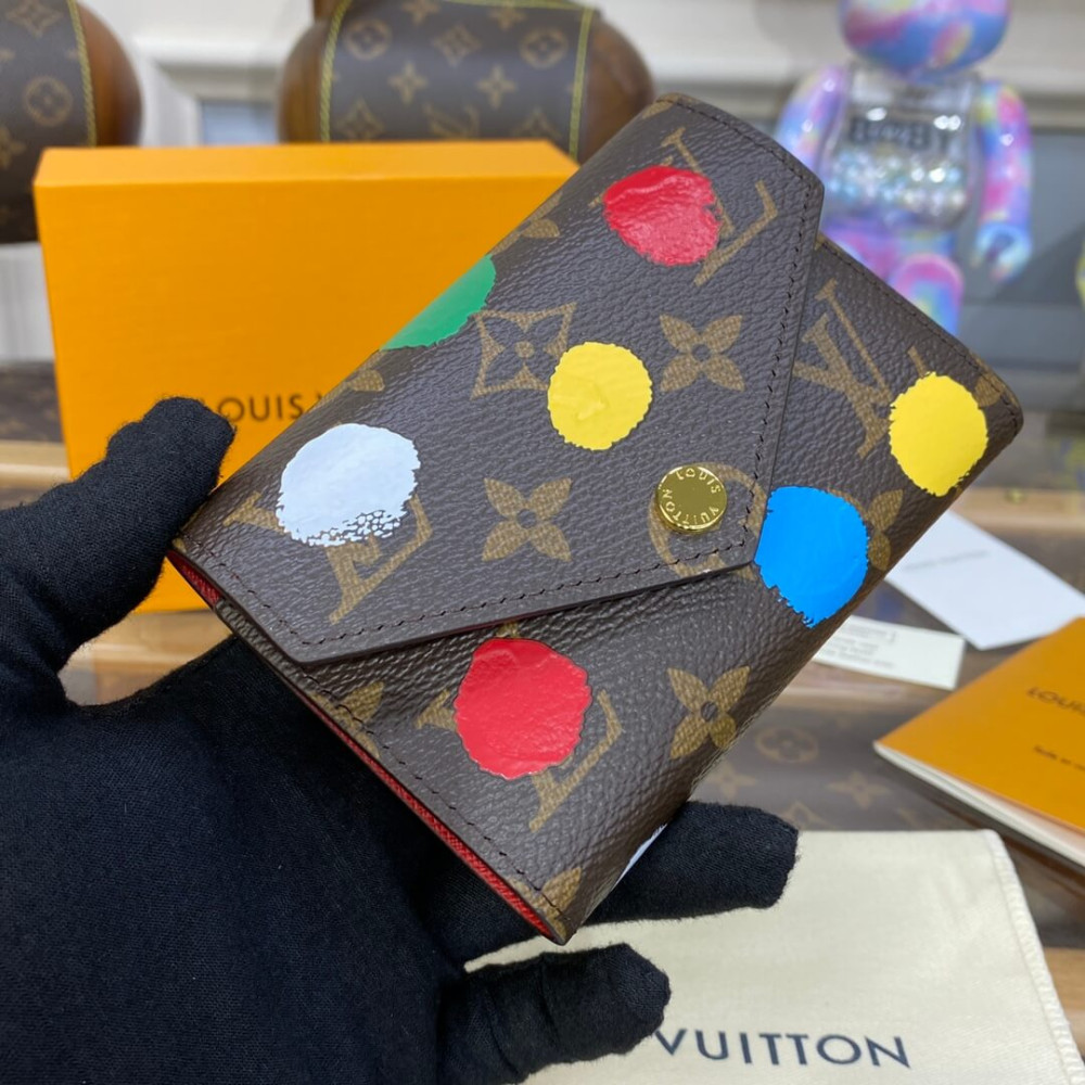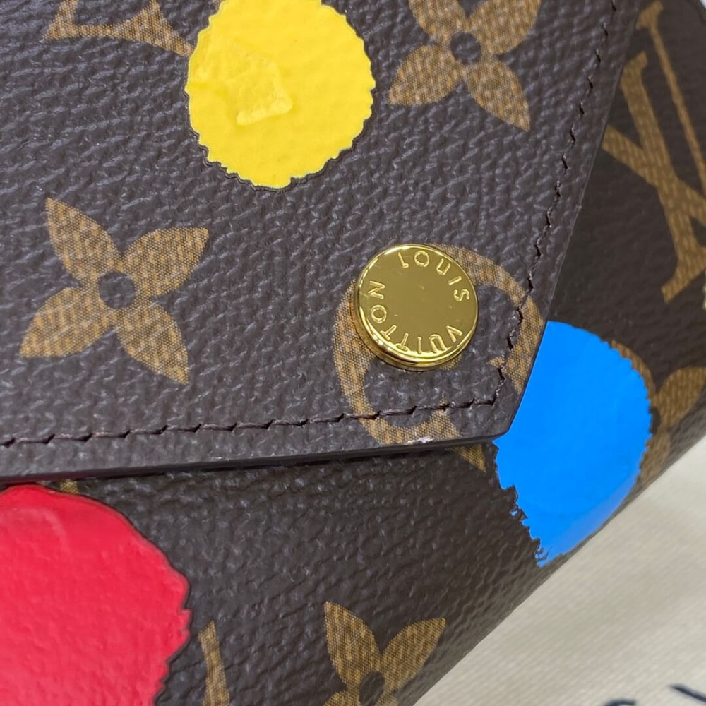 Colorful dots enliven the LVxYK Victorine wallet as part of the new Louis Vuitton x Yayoi Kusama collaboration. The venerated Japanese artist has made dotted patterns an integral part of her work throughout her career. For this version of the Victorine, her joyful dots are screen-printed on Monogram canvas with a 3D hand-painted look. An arty update of a practical accessory.