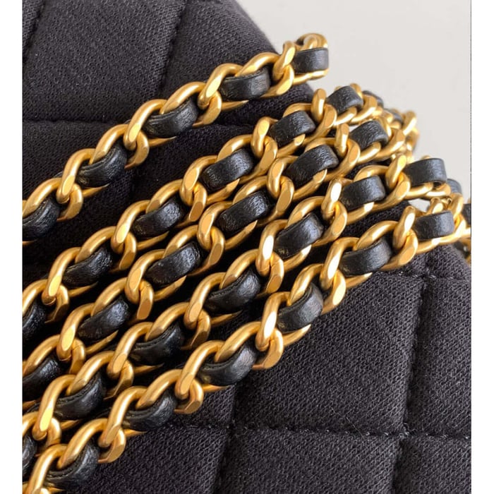 Introducing the Chanel Mini Kelly in Black Jersey fabric, adorned with Brushed Gold Hardware.