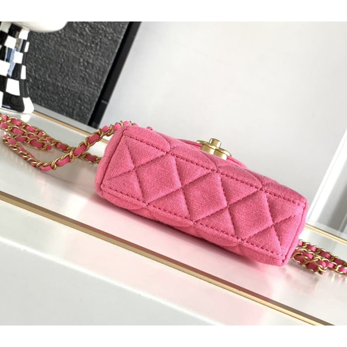This Nano Kelly is in Chanel Nano Kelly Hot Pink Jersey with Brushed Gold Hardware, tonal stitching, two flat back top handles and an interwoven aged gold with hot pink jersey shoulder strap, and CC turnlock closure.