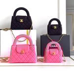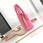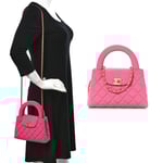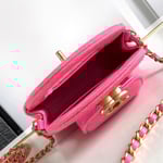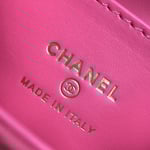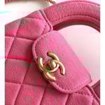 This Nano Kelly is in Chanel Nano Kelly Hot Pink Jersey with Brushed Gold Hardware, tonal stitching, two flat back top handles and an interwoven aged gold with hot pink jersey shoulder strap, and CC turnlock closure.