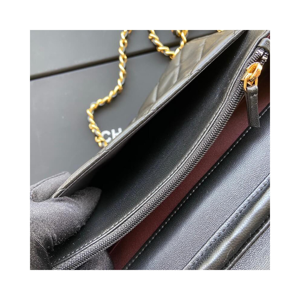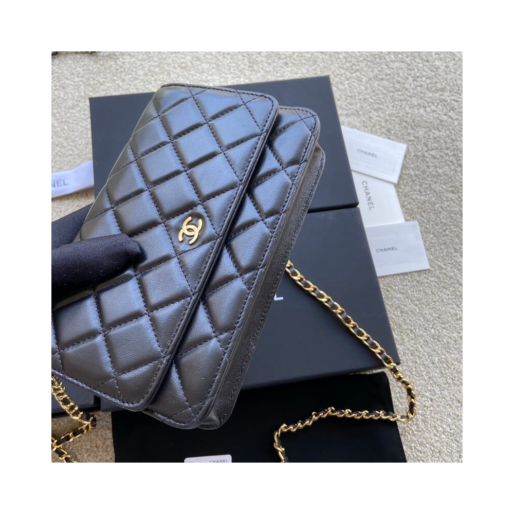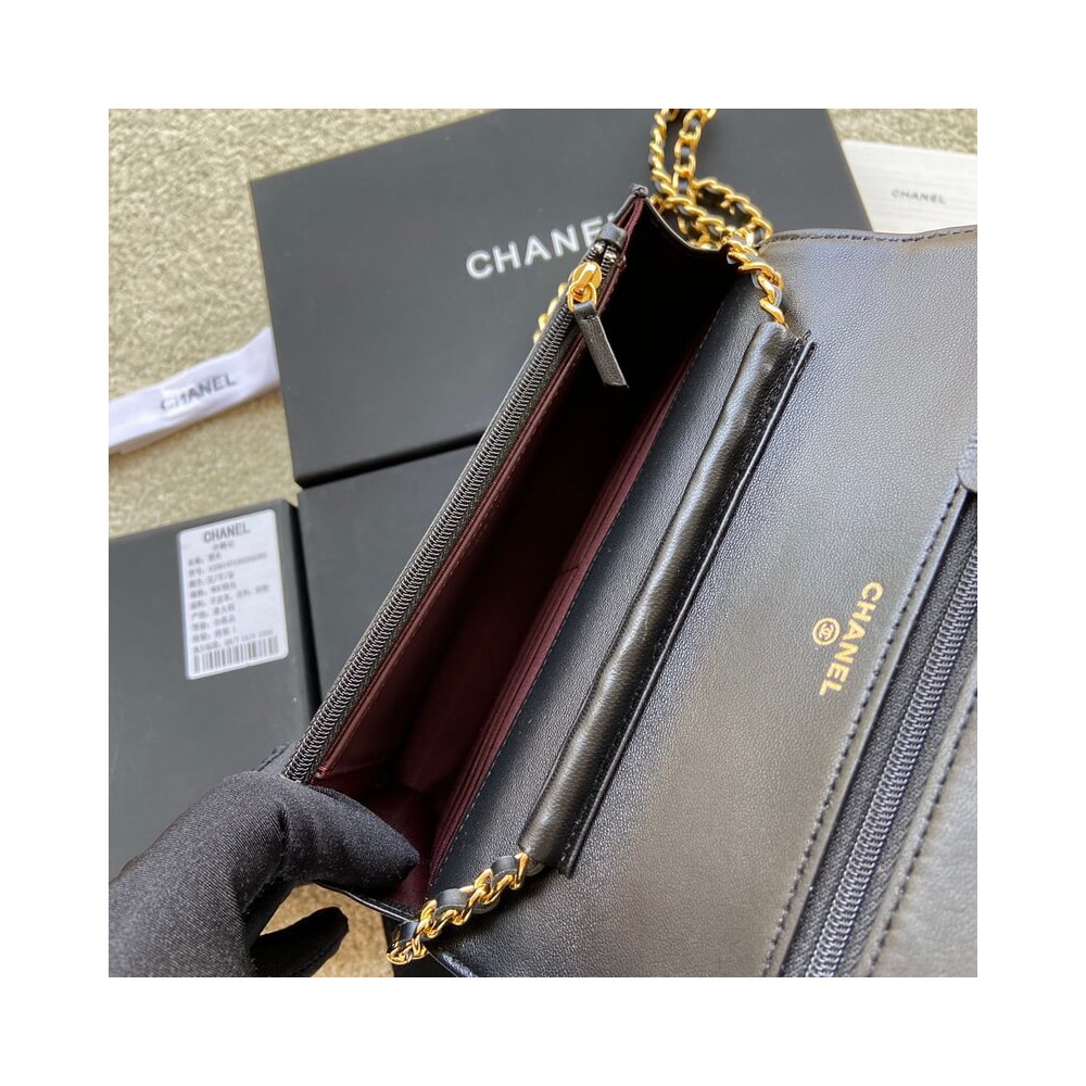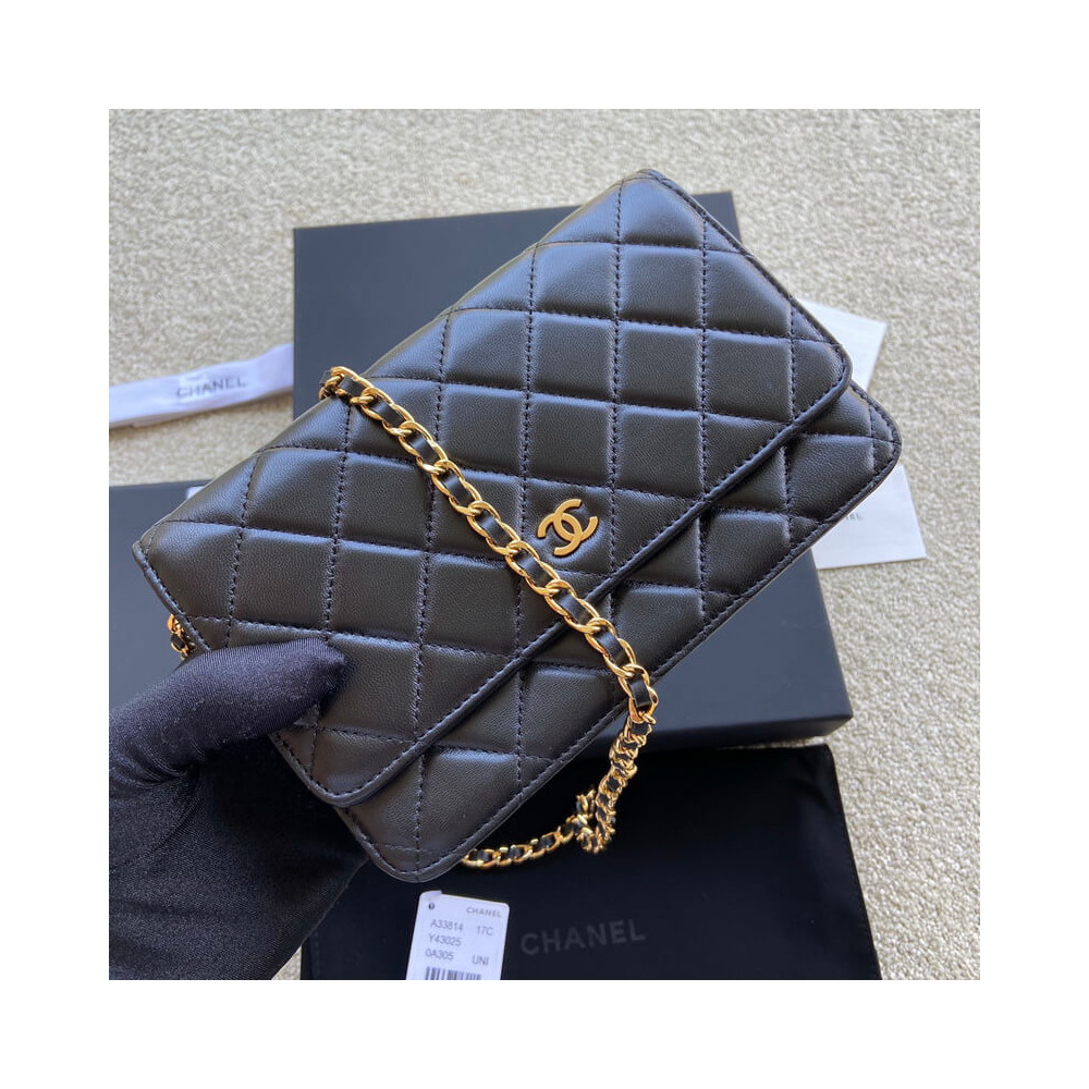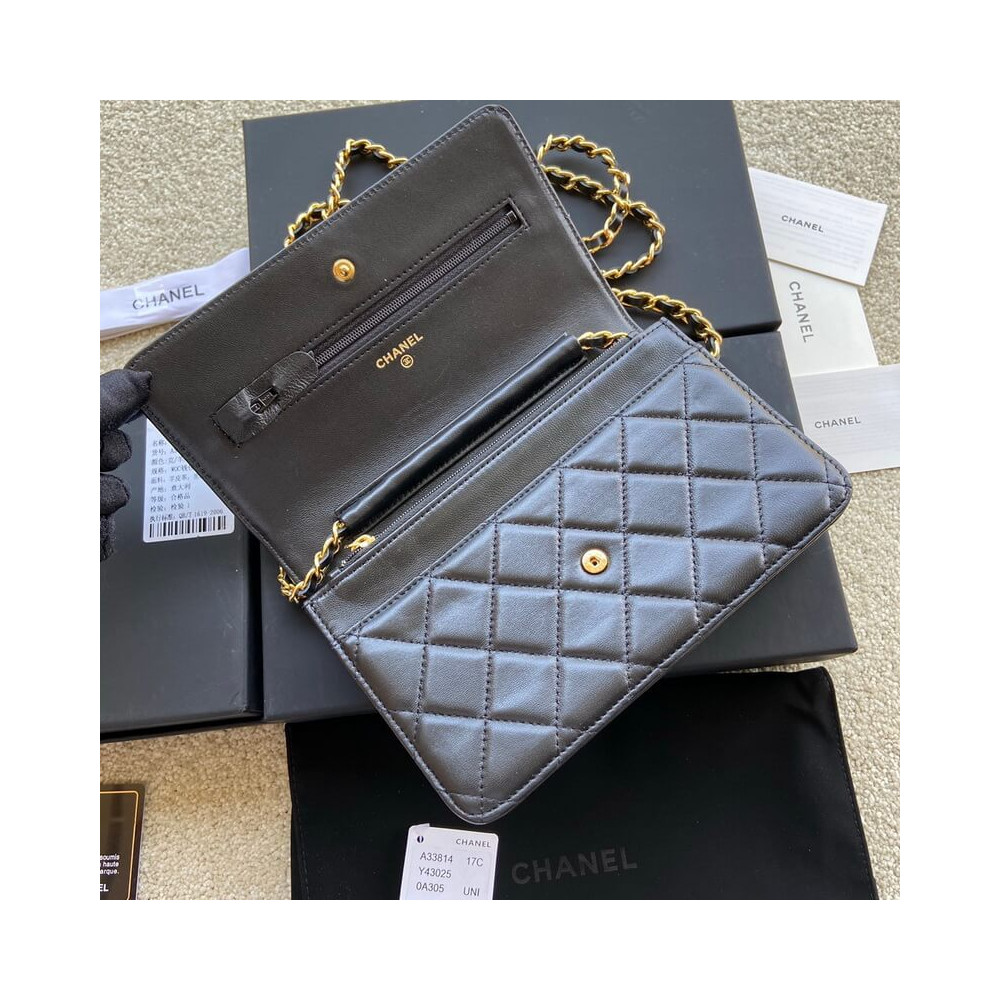 This stylish wallet is crafted of luxuriously textured diamond quilted caviar leather in black. This shoulder bag features a polished gold chain-link crossbody strap and a Chanel CC logo on the facing flap. The bag opens to a burgundy fabric interior with a zipper compartment, card slots, and a leather patch pocket.