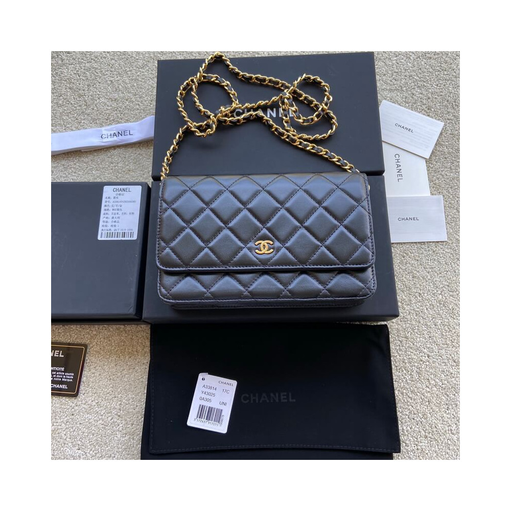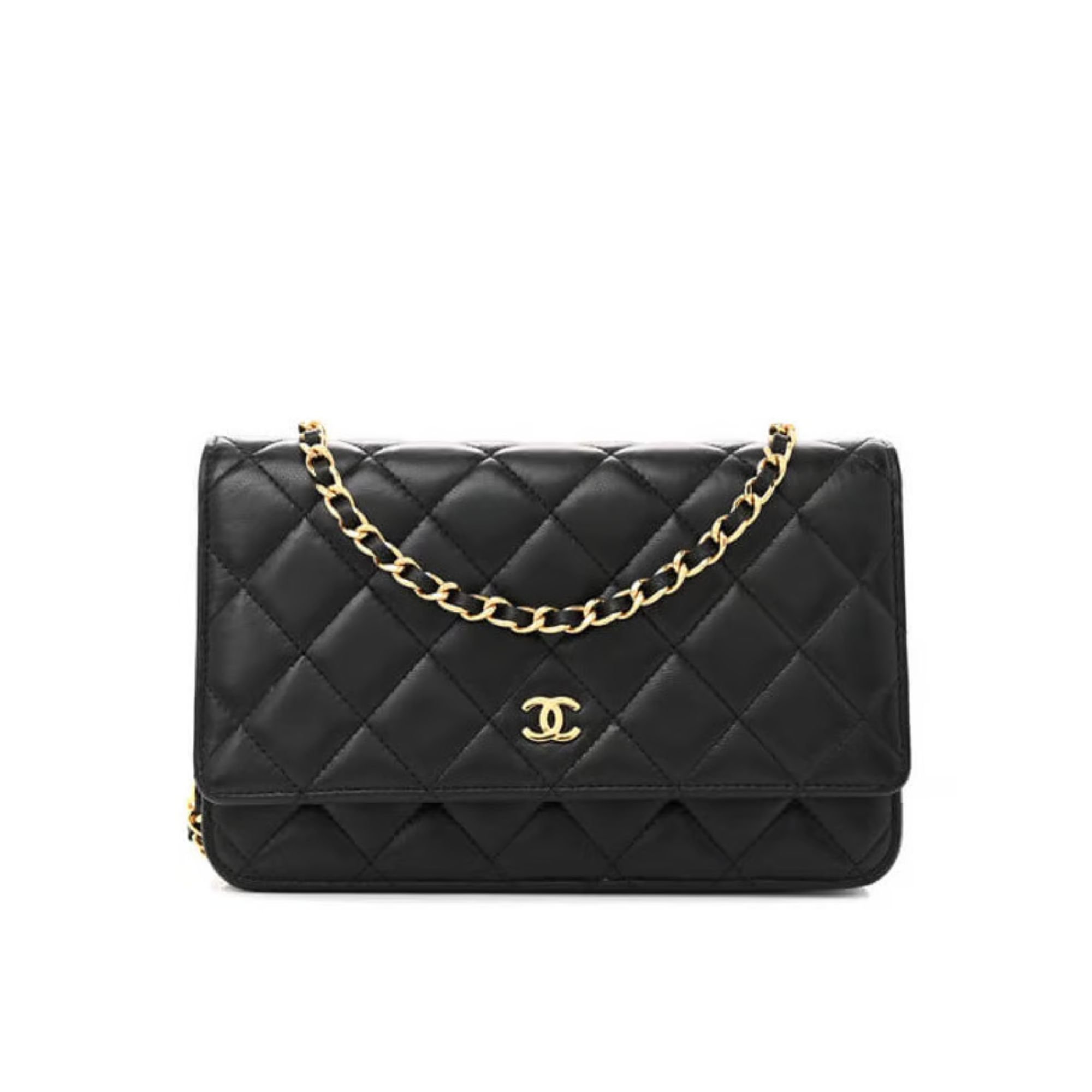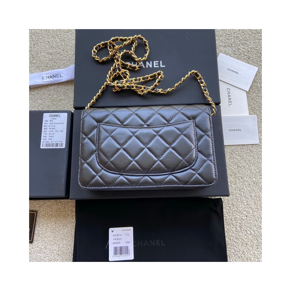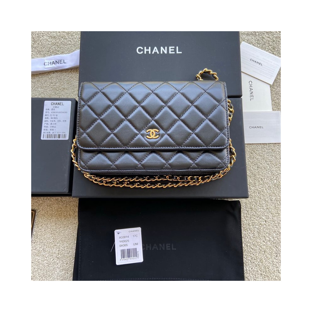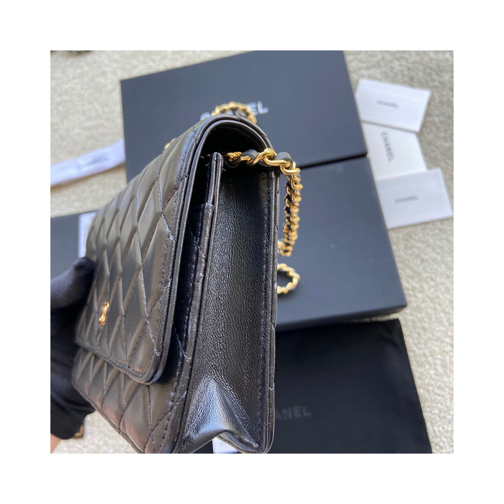 This stylish wallet is crafted of luxuriously textured diamond quilted caviar leather in black. This shoulder bag features a polished gold chain-link crossbody strap and a Chanel CC logo on the facing flap. The bag opens to a burgundy fabric interior with a zipper compartment, card slots, and a leather patch pocket.