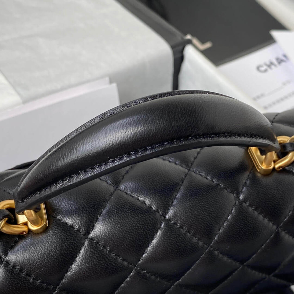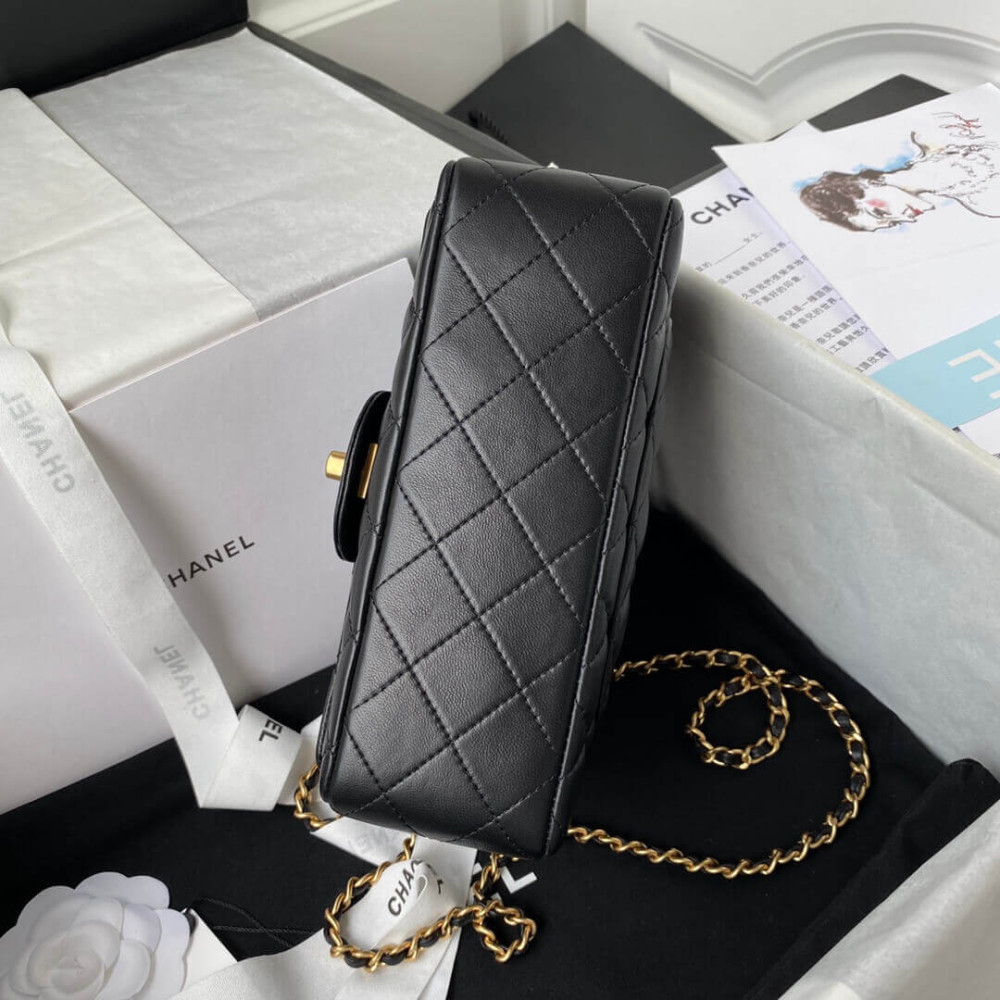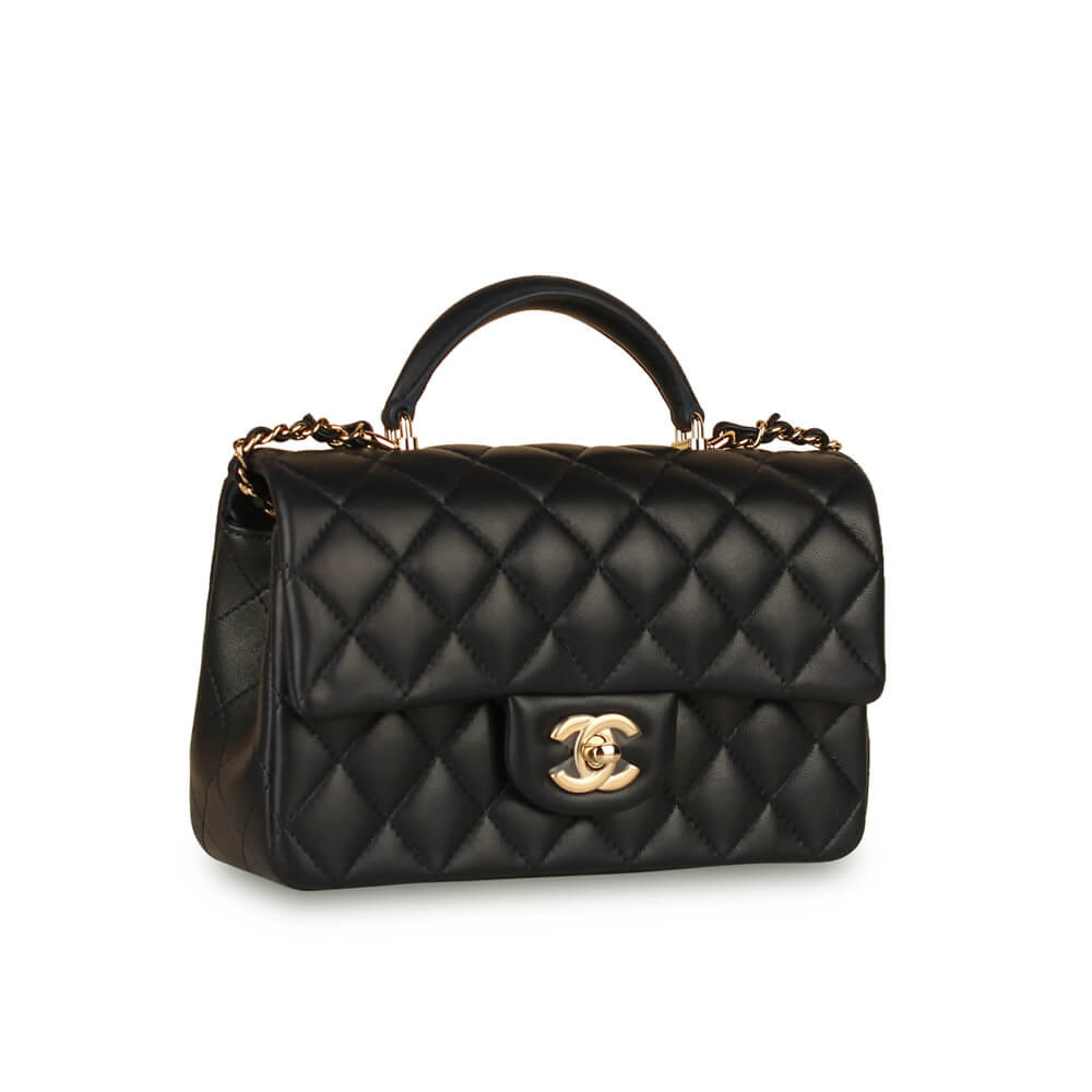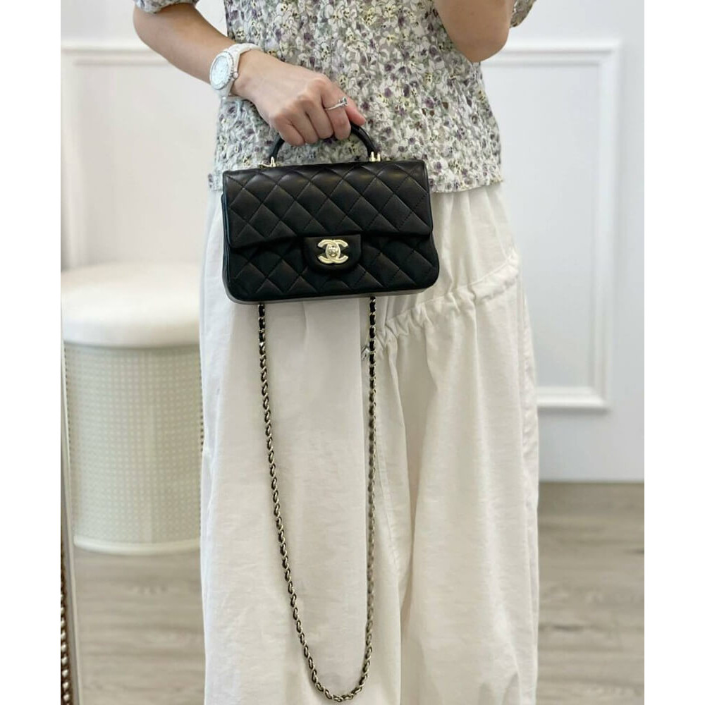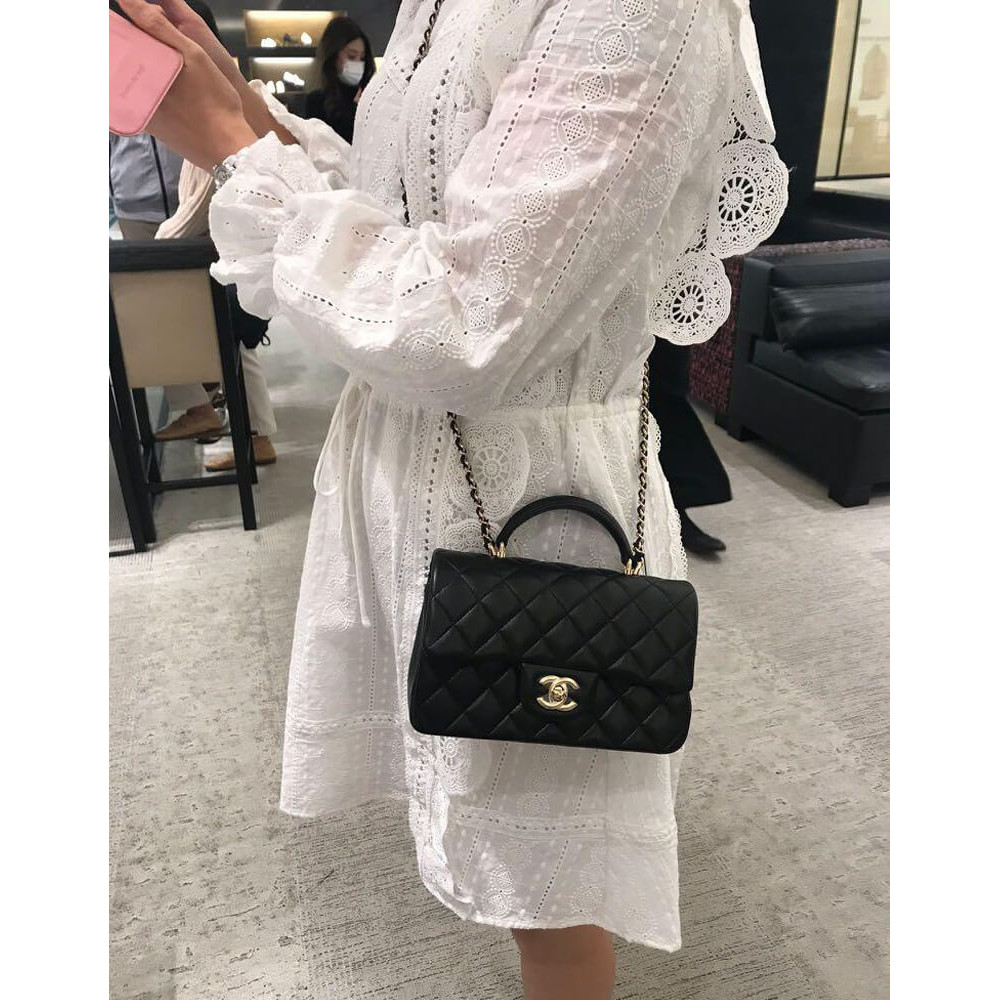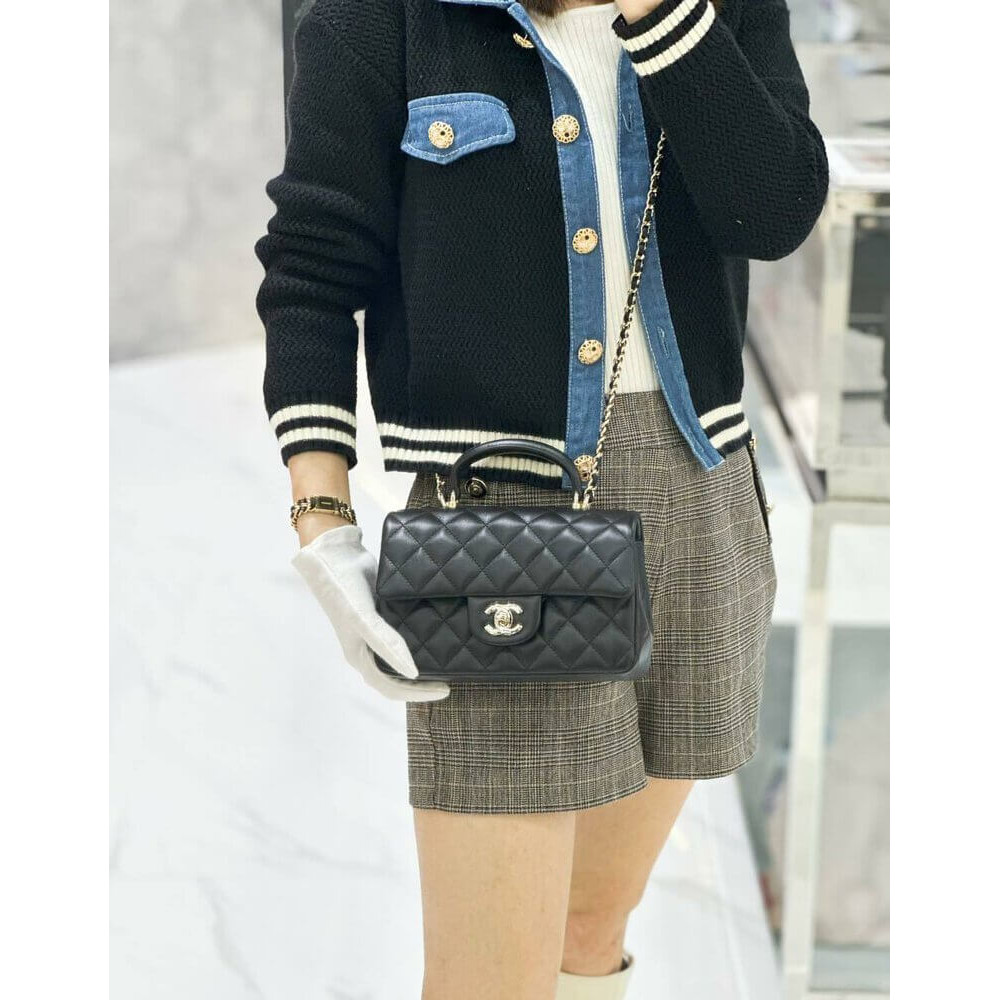 It feels like the Louis Vuitton Pochette Metis Bag, but redesigned with Chanel iconic elements. My favorite mixes are there – the diamond quilting, the woven chain strap and the shining gold CC logo on the center. The flap and the shape are both stunning. It’s like the Chanel Classic Flap Bag, but with something extra – and that is the handle on the top. Now you can carry this bag in multiple ways – on the shoulder, cross body and by hand thanks to the leather handle. All the pieces are just perfect. And I also adore the vintage gold CC logo. Because if you’re going to buy an extra Classic Bag for your wardrobe, you rather have one that is not similar to the Classic Flap Bag. The Classic Flap Bag has the smooth CC logo.