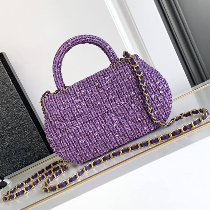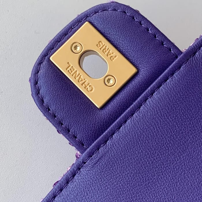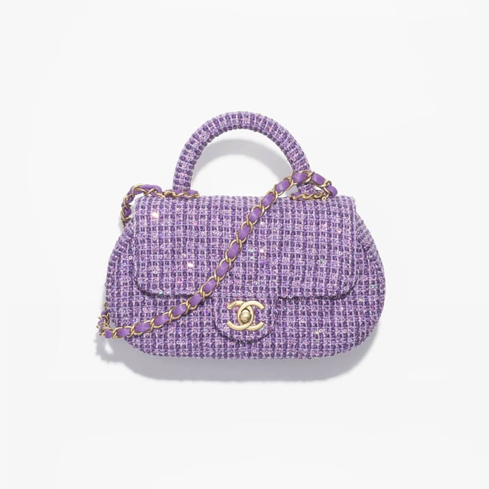 This Mini flap bag is in purple tweed with antique gold tone hardware and has a front flap with signature CC turnlock closure, a round shape structure, CC turnlock closure, one single rolled tweed handle and interwoven purple leather and antique gold tone chainlink crossbody/shoulder strap.