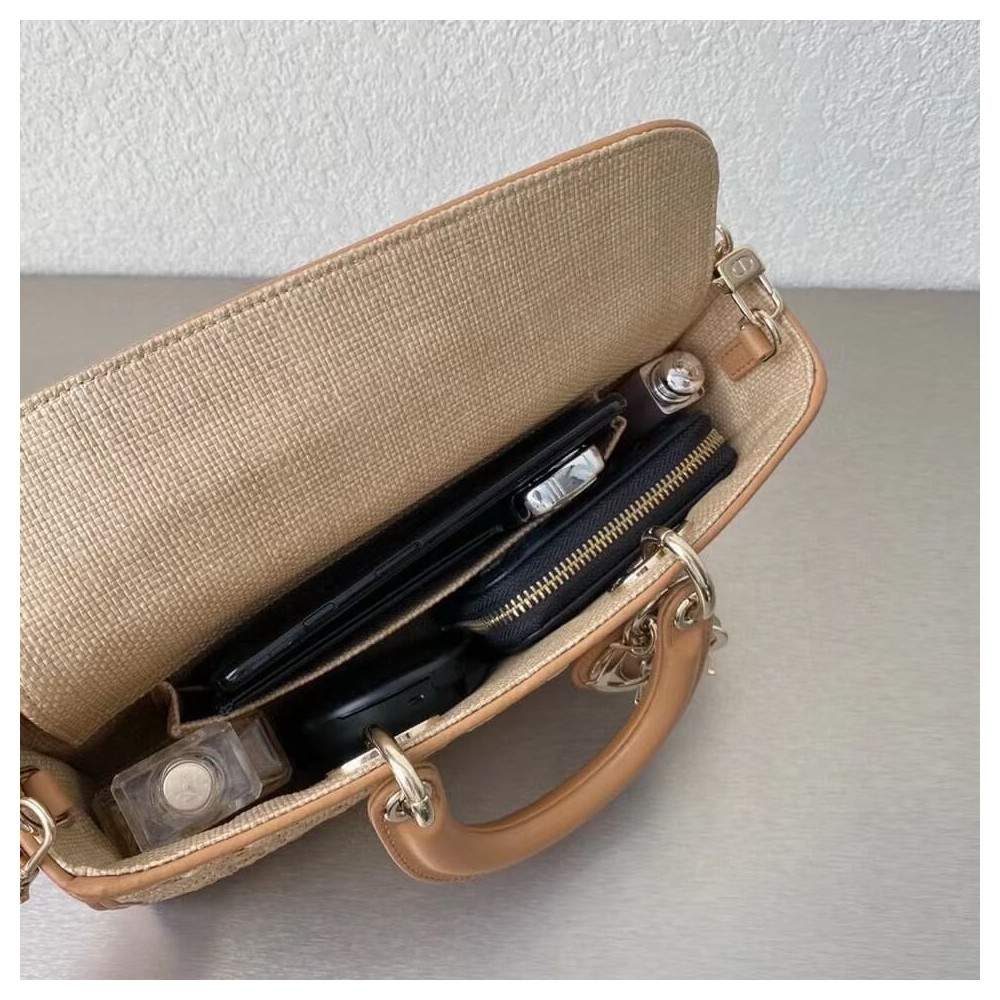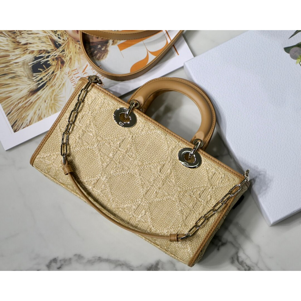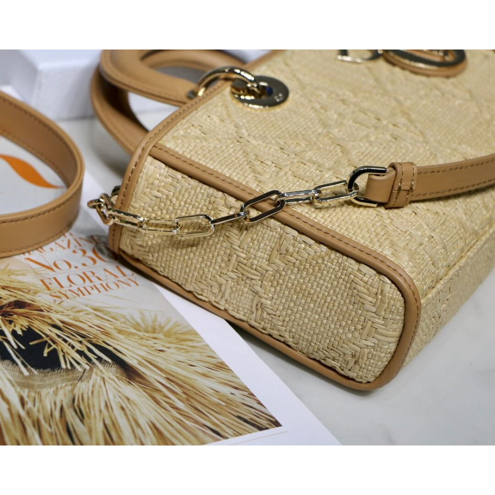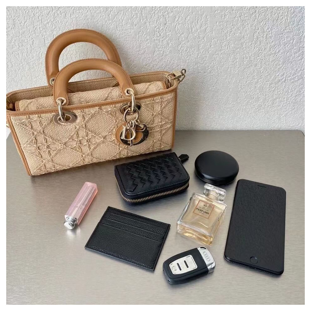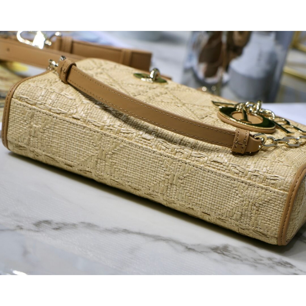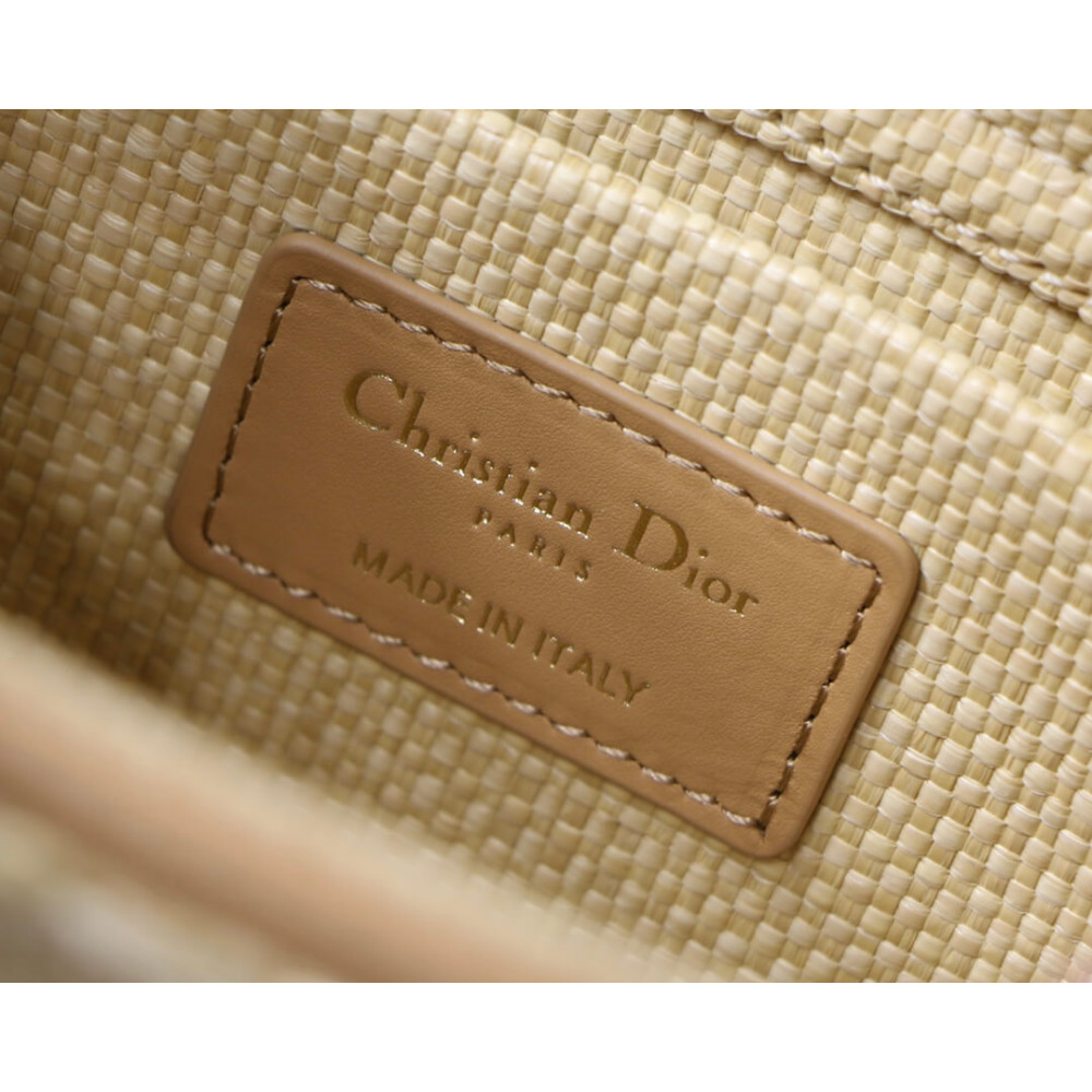 The Lady D-Joy bag captures the House’s vision of elegance and beauty by showcasing the iconic streamlined aesthetic of the Lady Dior line. Crafted in raffia with Cannage stitching, the refined and timeless style is enhanced by pale gold-finish metal ‘D.I.O.R.’ charms offering an elegant allure. Featuring one removable chain shoulder strap and another adjustable and removable leather shoulder strap, the Lady D-Joy bag can be carried by hand or worn crossbody as a daily companion.