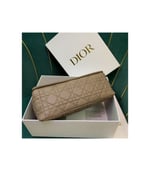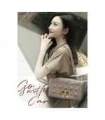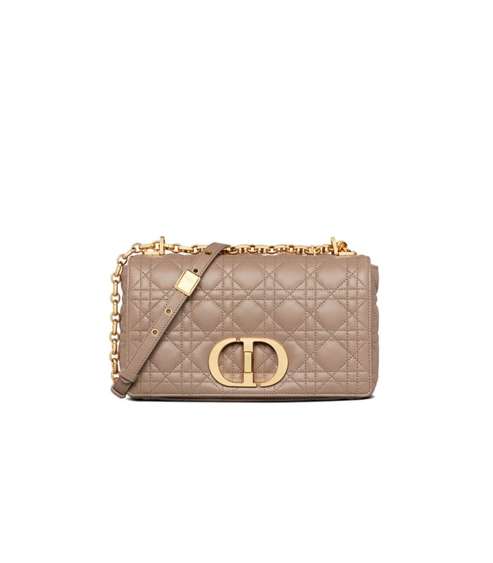 The Dior Caro bag combines modernity with timeless elegance. The design is crafted in warm taupe calfskin with Cannage stitching. The supple bag features a flap adorned with an antique gold-finish metal ‘CD’ twist clasp, inspired by the seal of a Christian Dior perfume bottle. The detachable chain shoulder strap with ‘CD’ signature links allows it to be carried by hand, over the shoulder or crossbody, or may be replaced by one of the House’s wide embroidered straps, allowing the medium bag to pair with day or evening attire.