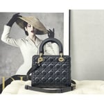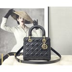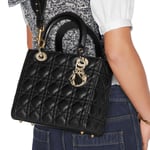 The Lady Dior bag embodies Dior’s vision of elegance and beauty. Sleek and refined, the timeless yet relevant style is crafted in black lambskin with Cannage stitching, creating the instantly recognizable quilted texture. The silver-finish metal D.I.O.R. charms offer an elegant allure. Featuring a thin, removable leather shoulder strap, the medium Lady Dior bag can be carried by hand, worn over the shoulder or crossbody.
