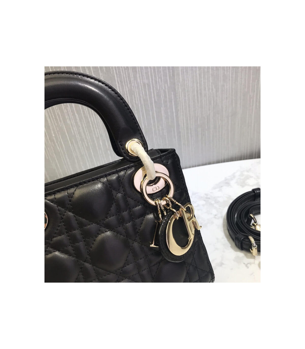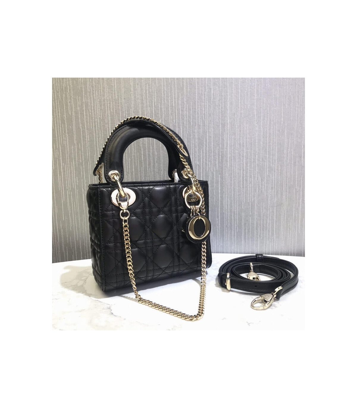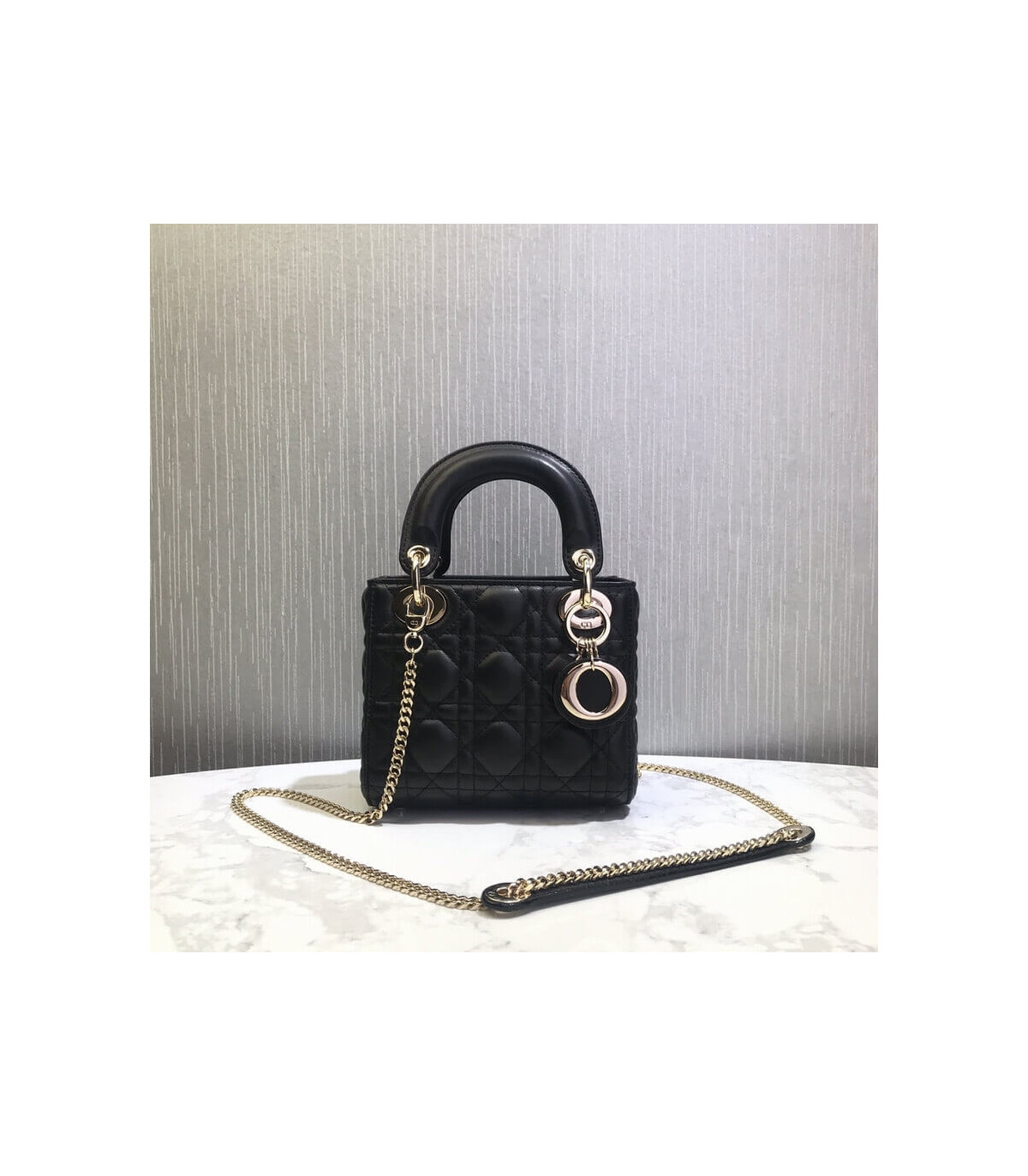 The Lady Dior bag epitomizes Dior’s vision of elegance and beauty. Sleek and refined, the timeless yet relevant style is crafted in peach blossom pink lambskin with Cannage stitching, creating the instantly recognizable quilted texture. The tonal enamel ‘D.I.O.R.’ charms lend a polished touch to the style. Featuring a removable chain shoulder strap, the miniature style can be carried by hand and is the ideal evening companion.
