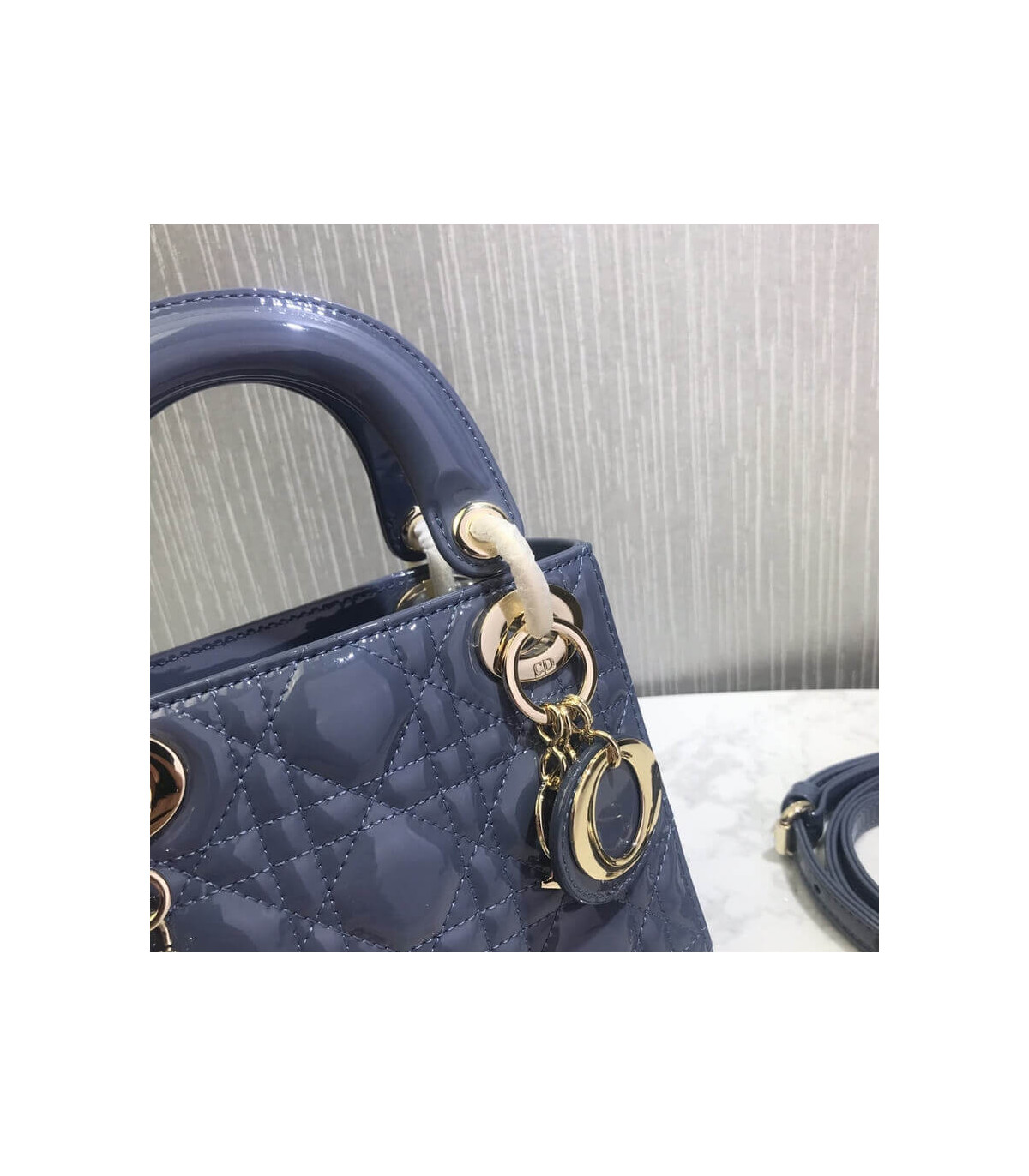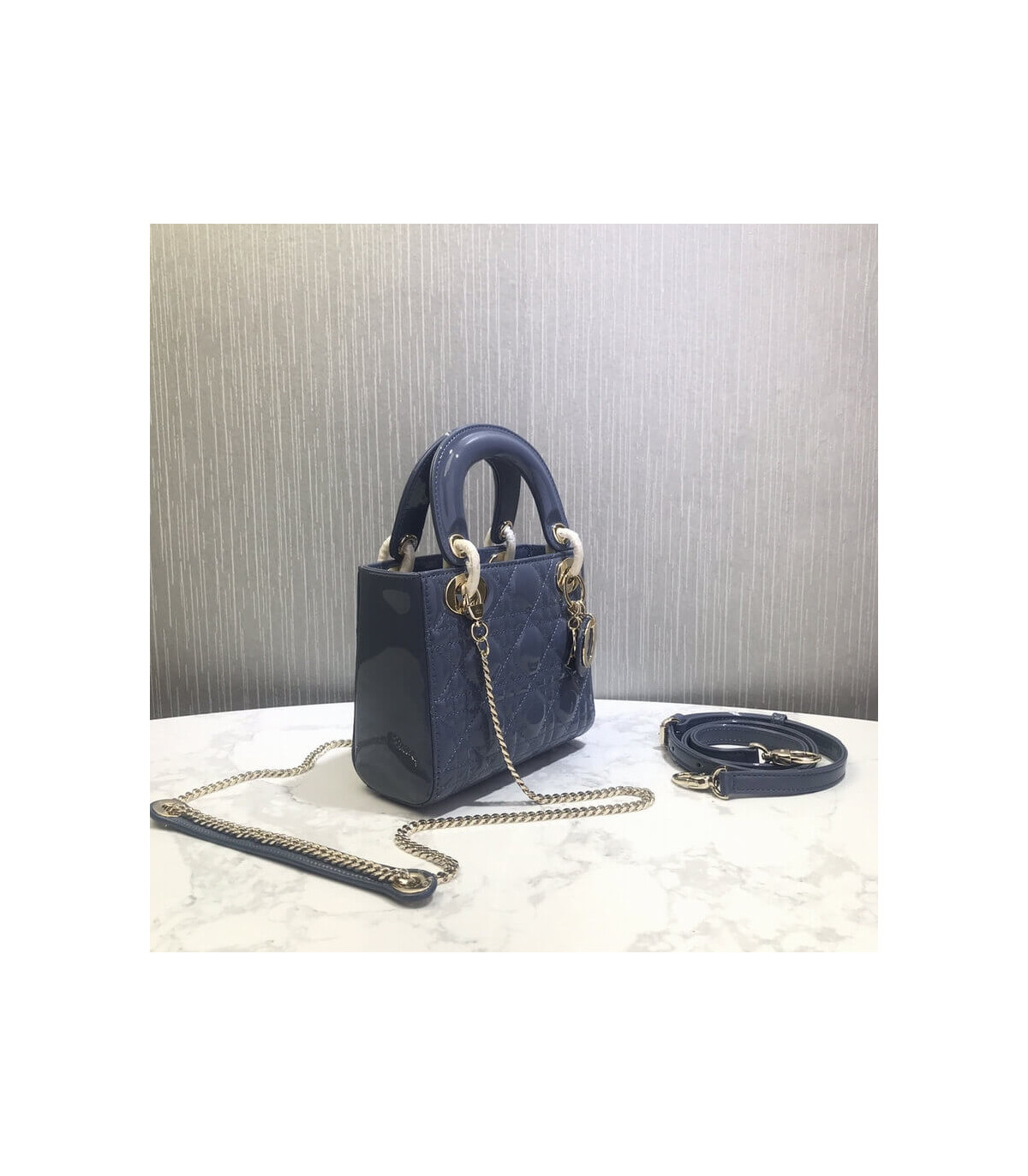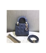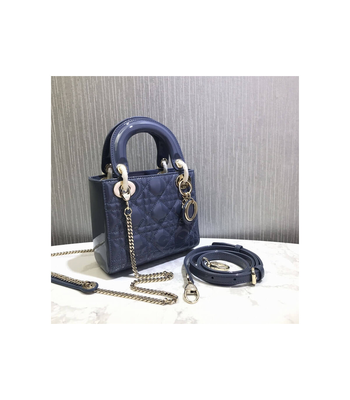 The Lady Dior handbag epitomizes the House’s vision of elegance and beauty. Sleek and refined the timeless yet relevant style is crafted in black patent calfskin with Cannage stitching, creating the instantly recognizable quilted texture. The pale gold-finish metal signature ‘D.I.O.R.’ charms embellish and illuminate its silhouette. Featuring a removable chain shoulder strap, the miniature Lady Dior bag can be carried by hand, worn over the shoulder or crossbody as an ideal evening companion.