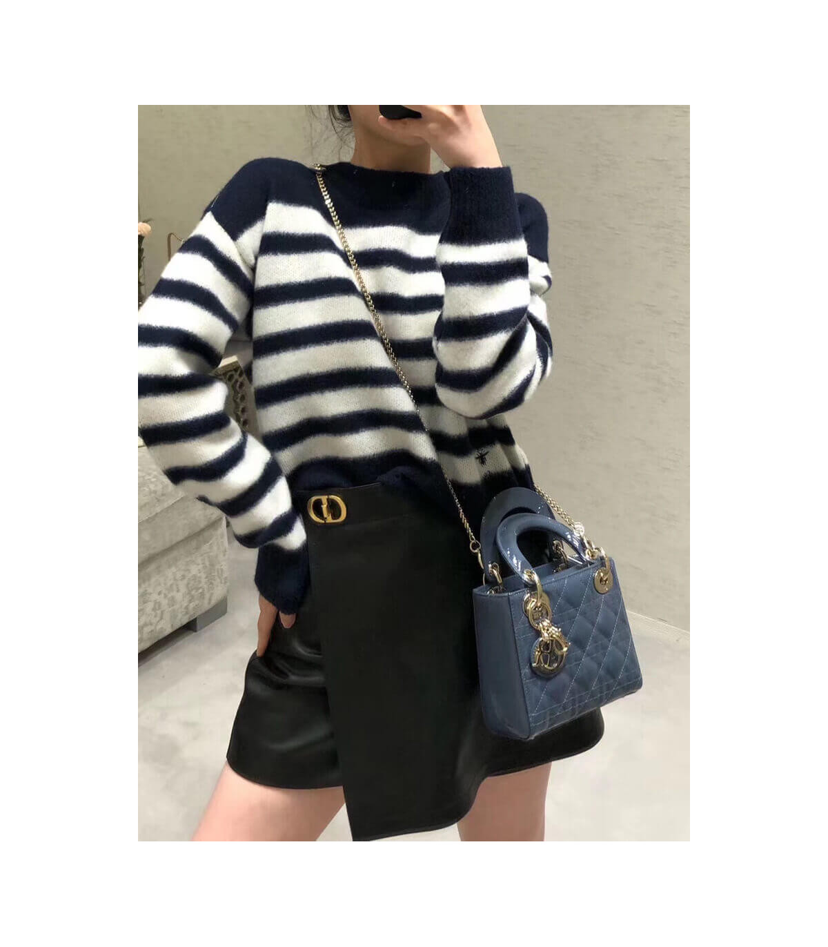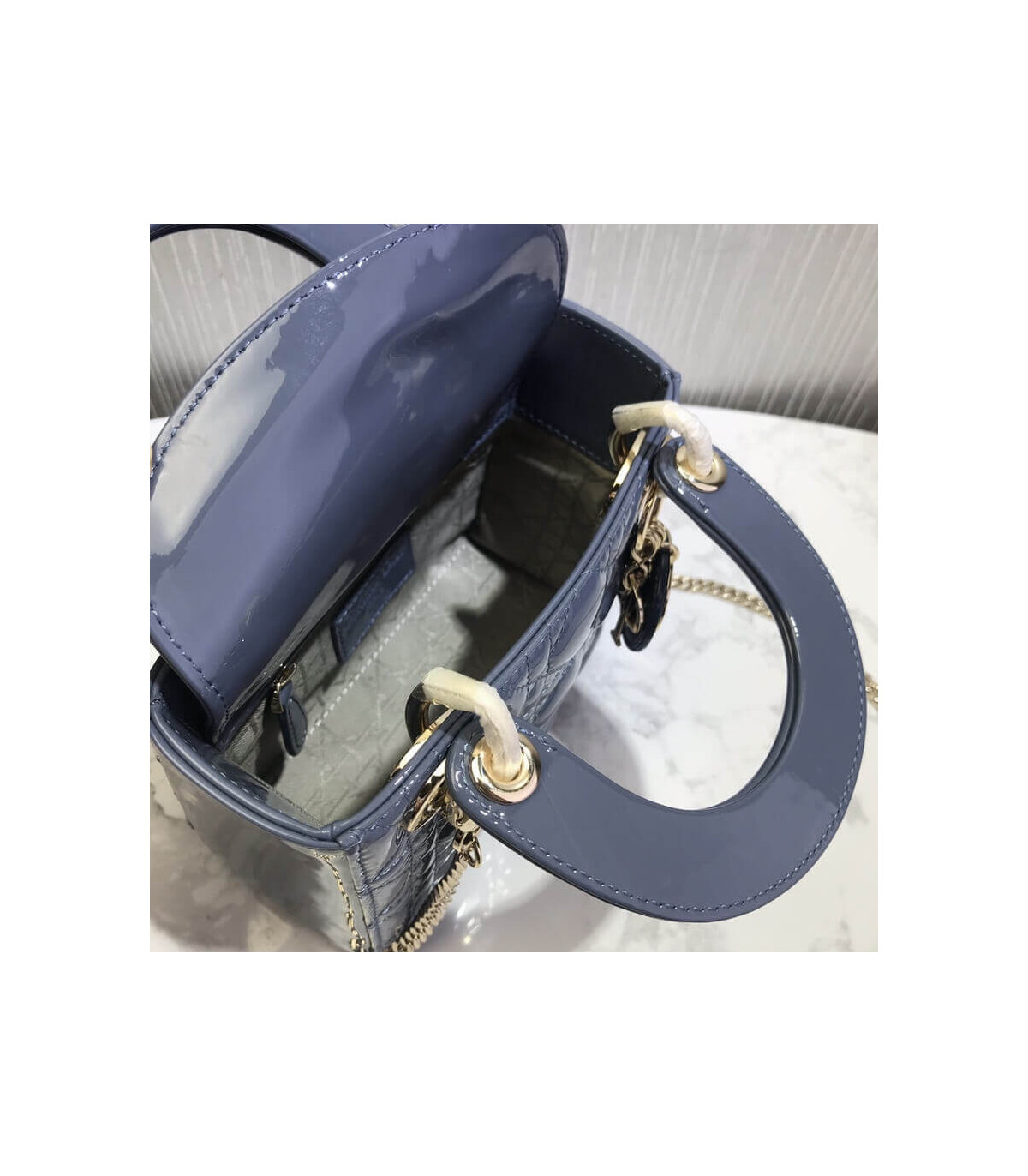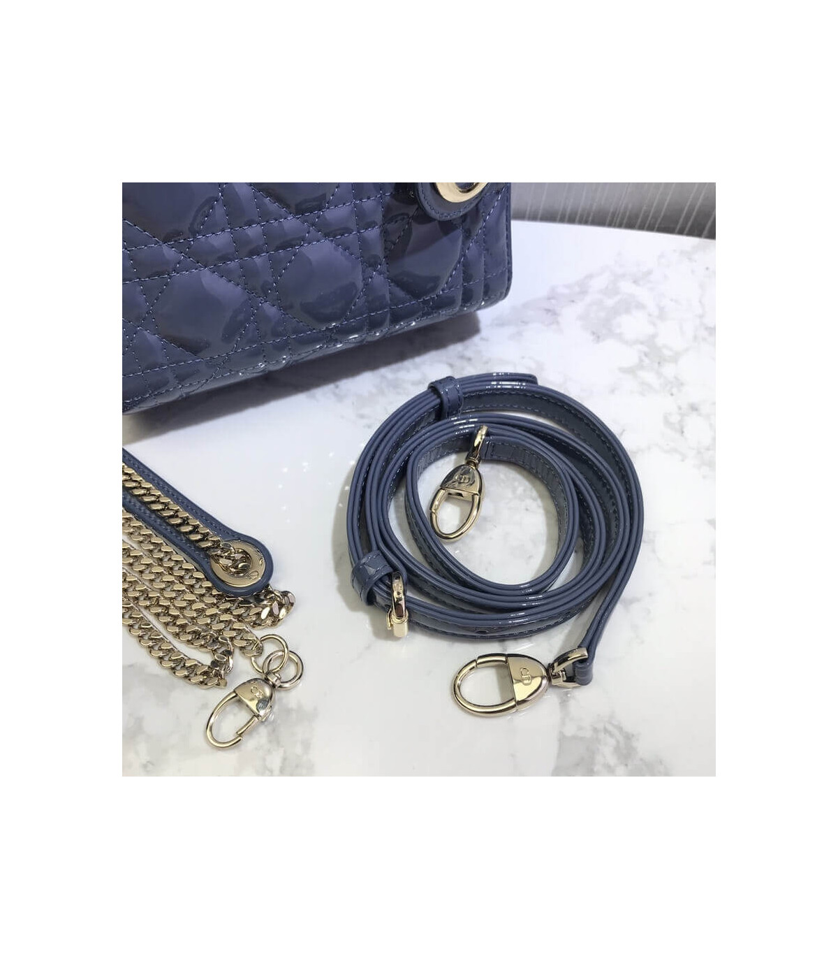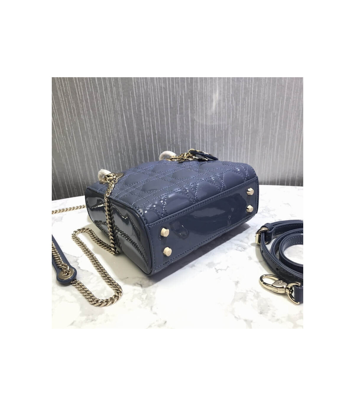 The Lady Dior handbag epitomizes the House’s vision of elegance and beauty. Sleek and refined the timeless yet relevant style is crafted in black patent calfskin with Cannage stitching, creating the instantly recognizable quilted texture. The pale gold-finish metal signature ‘D.I.O.R.’ charms embellish and illuminate its silhouette. Featuring a removable chain shoulder strap, the miniature Lady Dior bag can be carried by hand, worn over the shoulder or crossbody as an ideal evening companion.