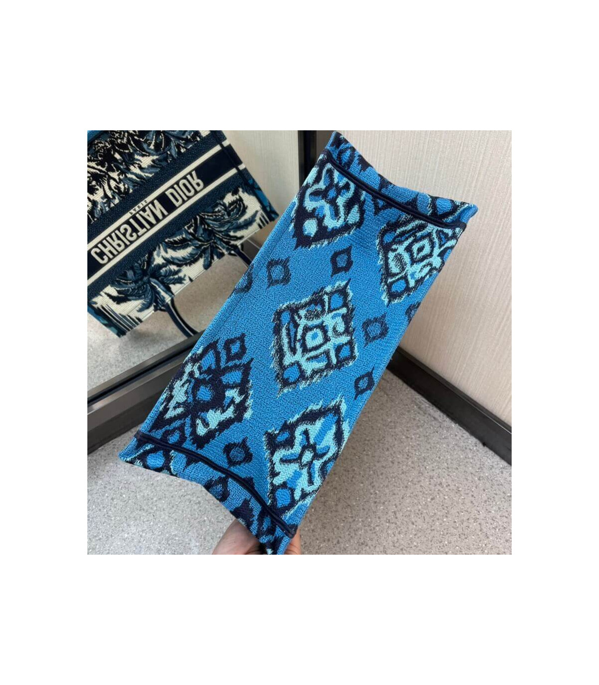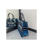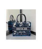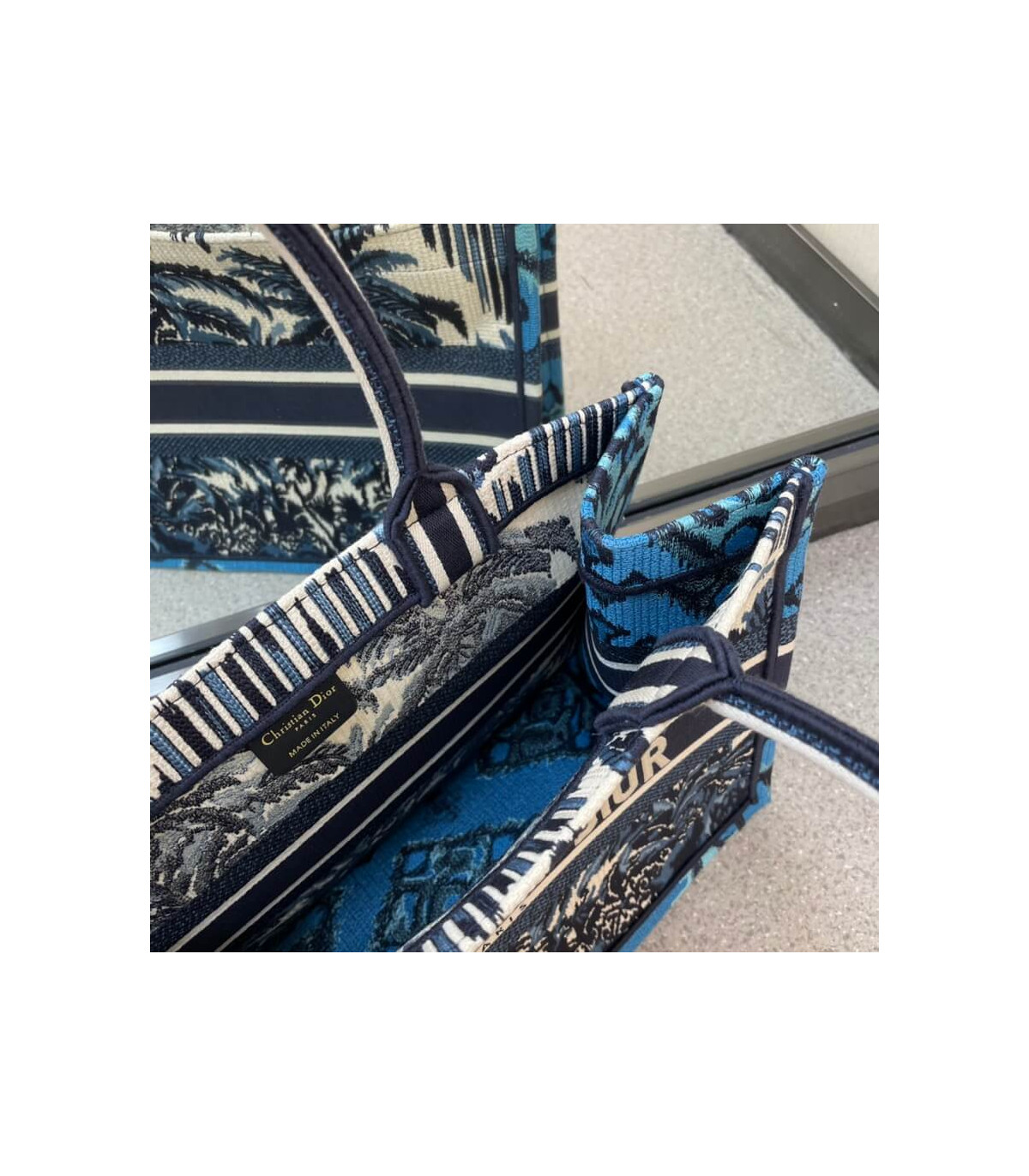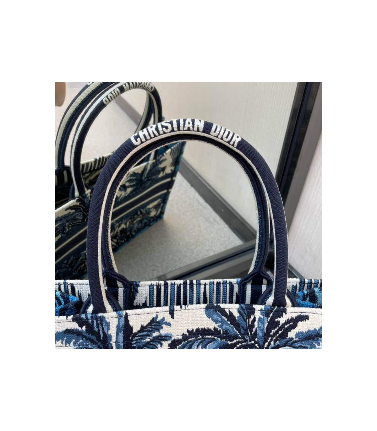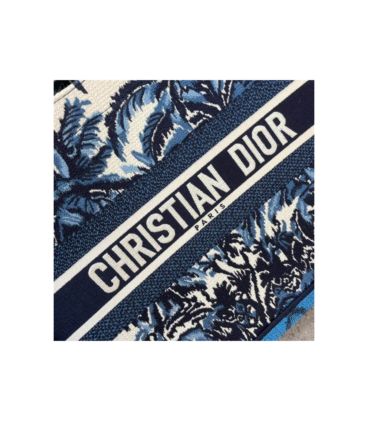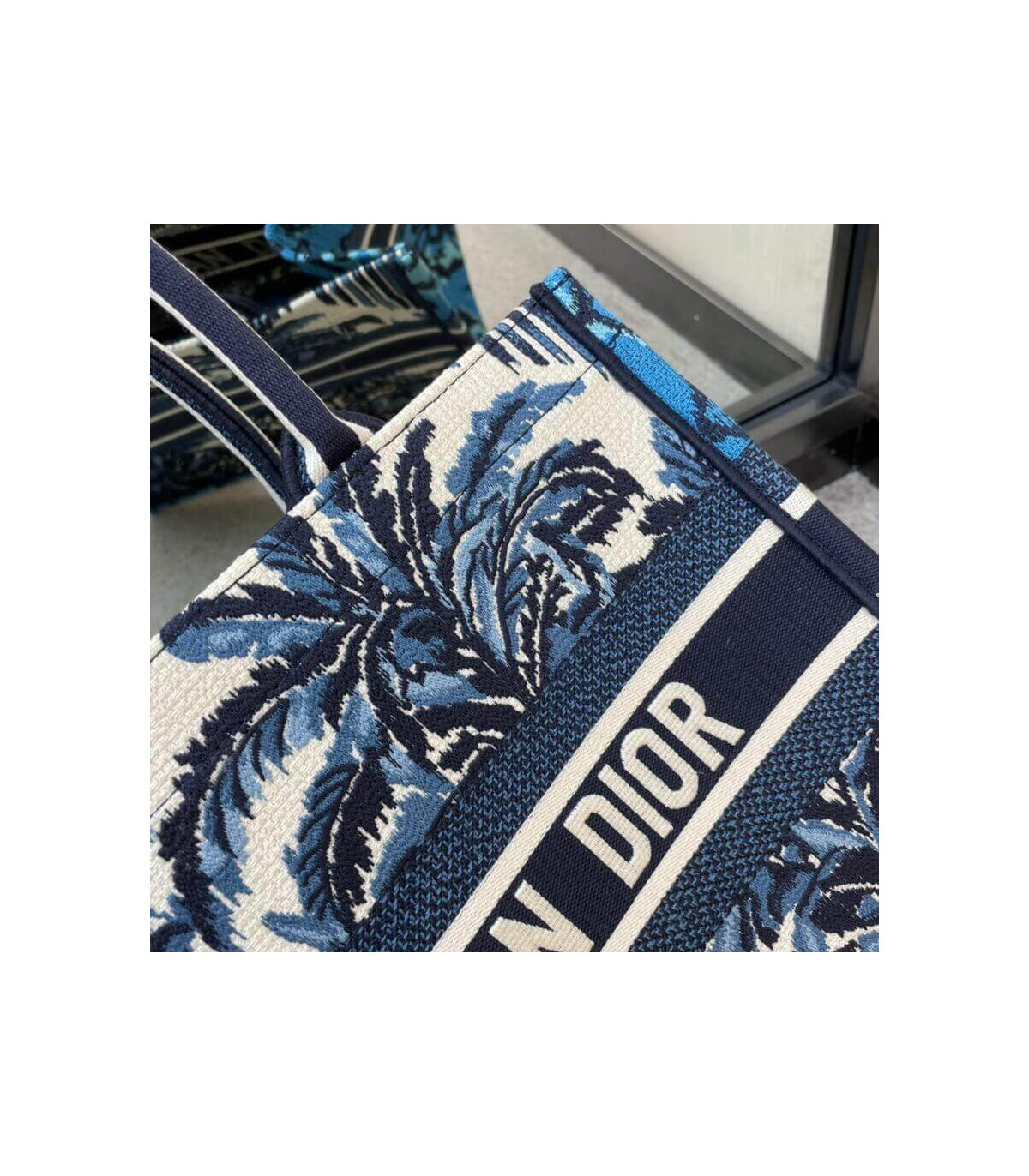 The Dior Book Tote, an original style introduced by Creative Director Maria Grazia Chiuri, has become a staple of the Dior aesthetic. Designed to carry all the daily essentials, the silhouette offers a new take on the hallmark Toile de Jouy with a fully embroidered variation with the blue Dior Palms motif. The front boasts a ‘Christian Dior’ signature while a graphic motif adorns the sides for a contrasting modern touch. The carryall is a prime example of Dior savoir-faire.