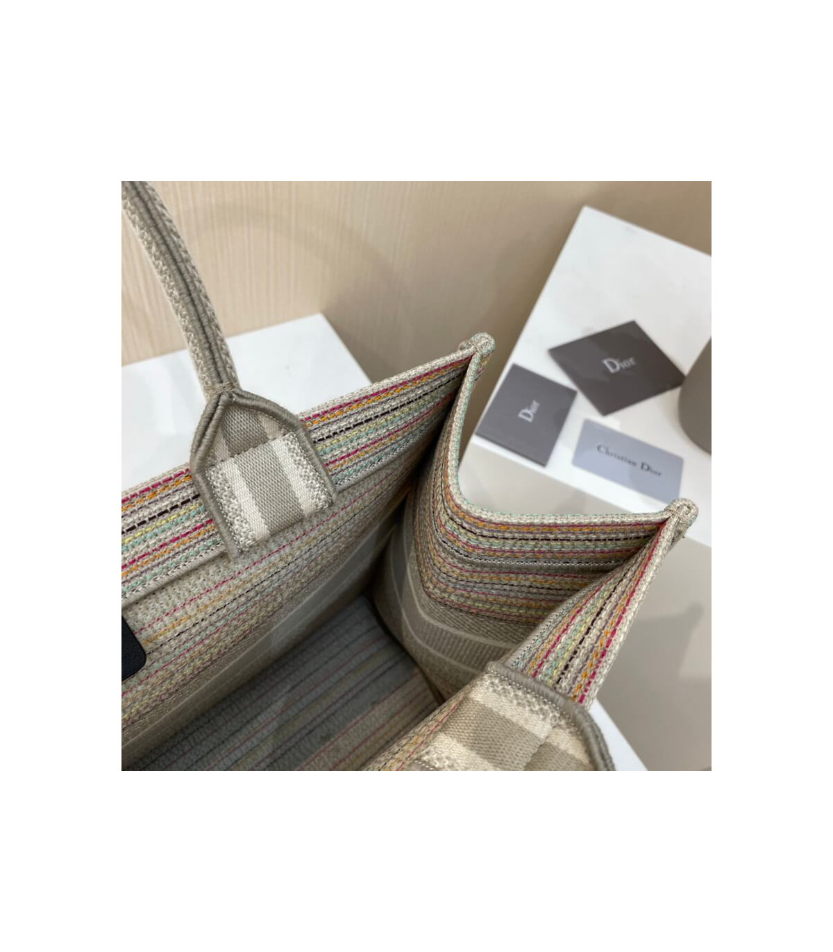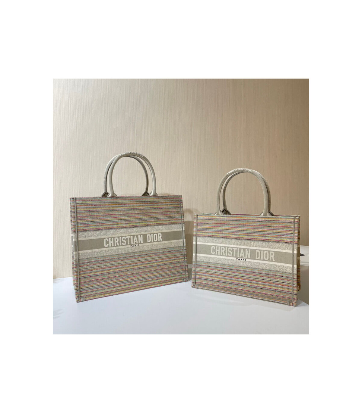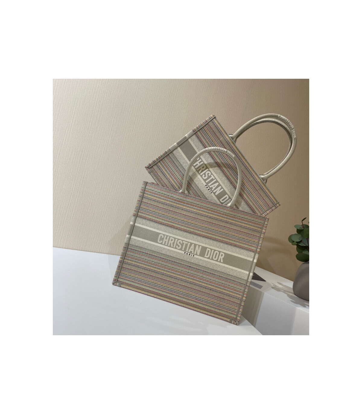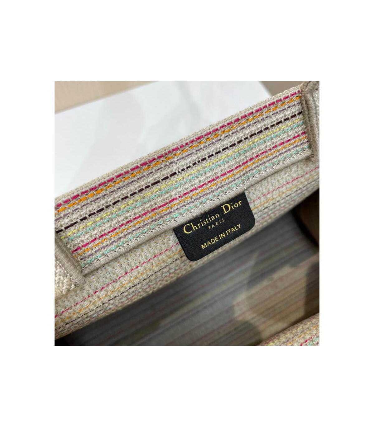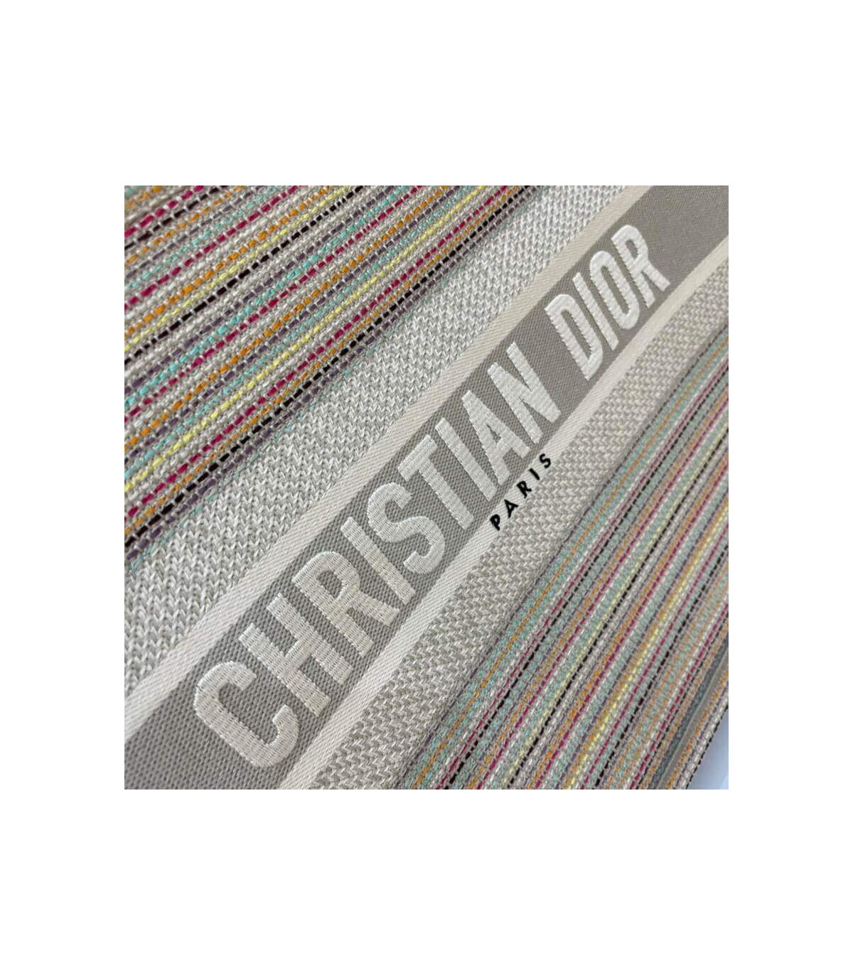 The Dior Book Tote, an original style introduced by Creative Director Maria Grazia Chiuri, has become a staple of the Dior aesthetic. This small style is part of the Dior Gold capsule collection and can hold all the daily essentials. It is fully embroidered with thin multicolor pastel stripes and enhanced with metallic thread. Adorned with the ‘Christian Dior’ signature on the front, the Dior Book Tote exemplifies the House’s signature savoir-faire and can be paired with other Dior Gold creations from the collection.