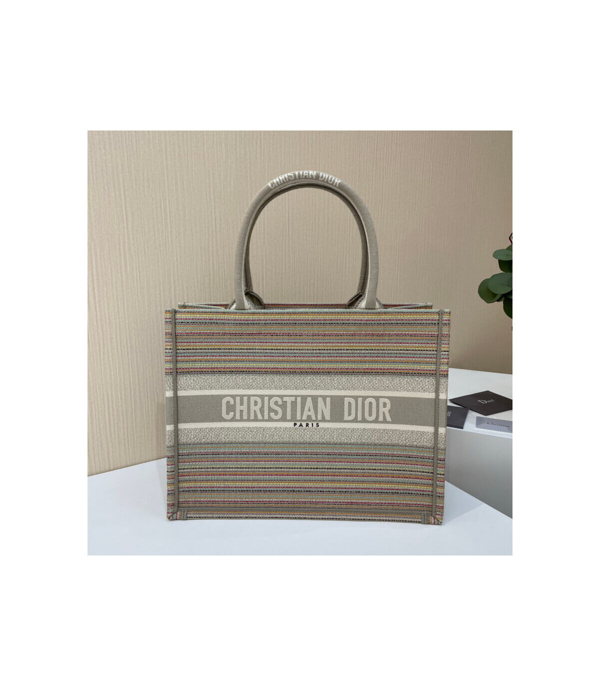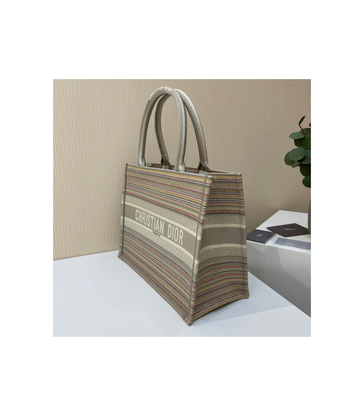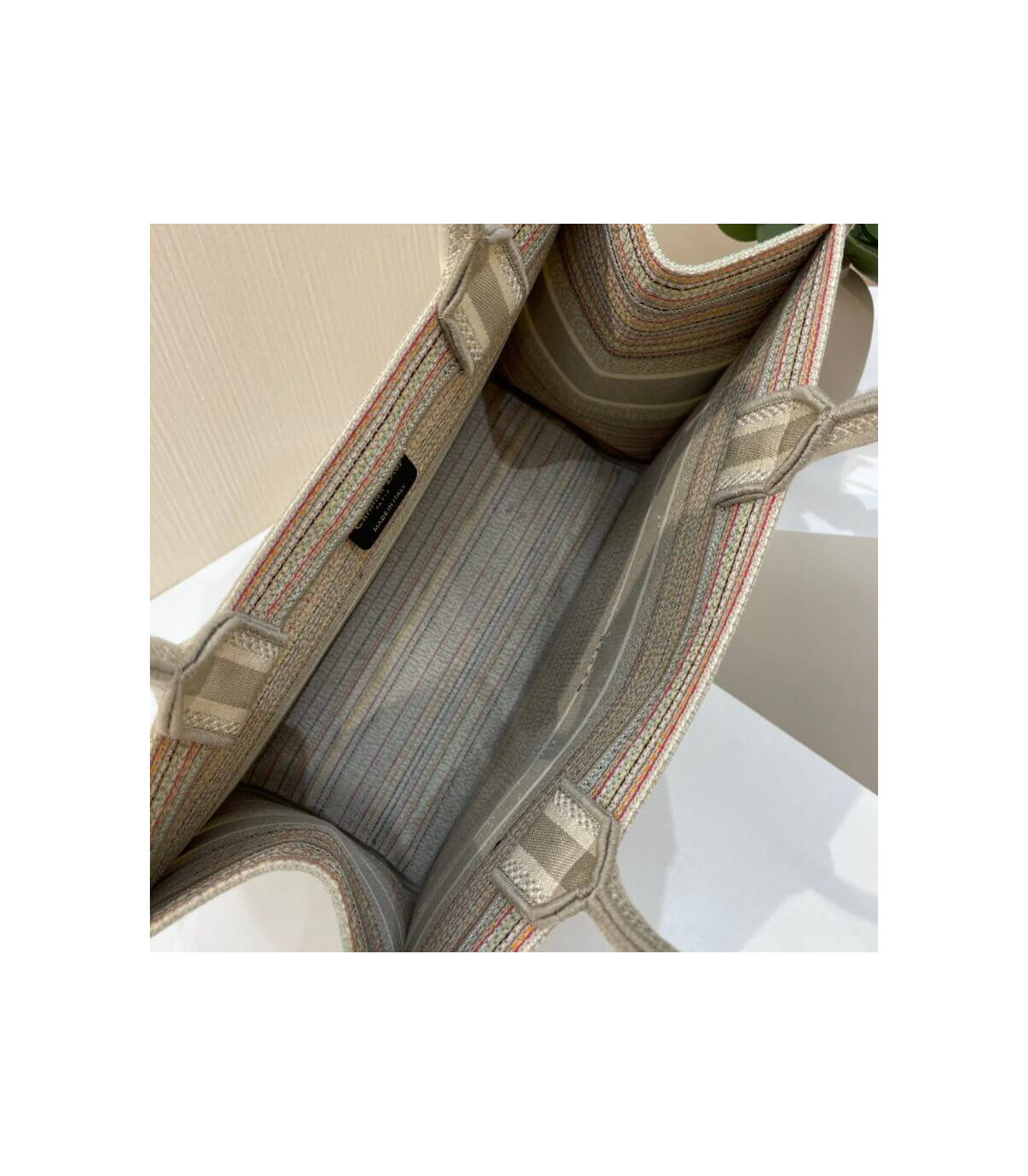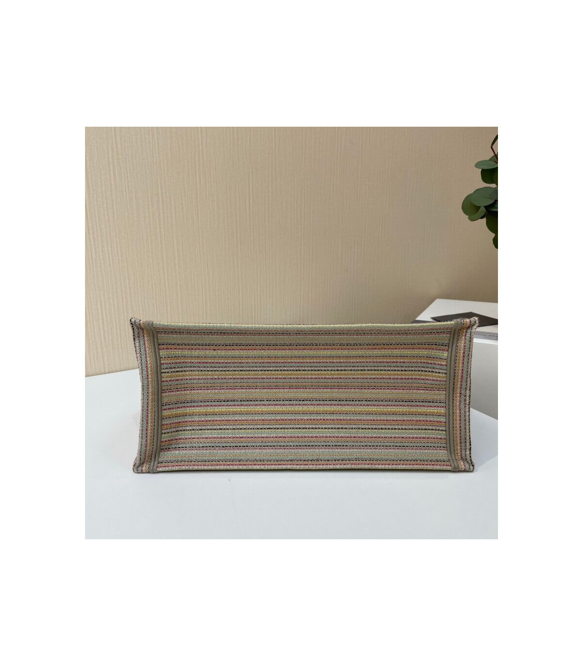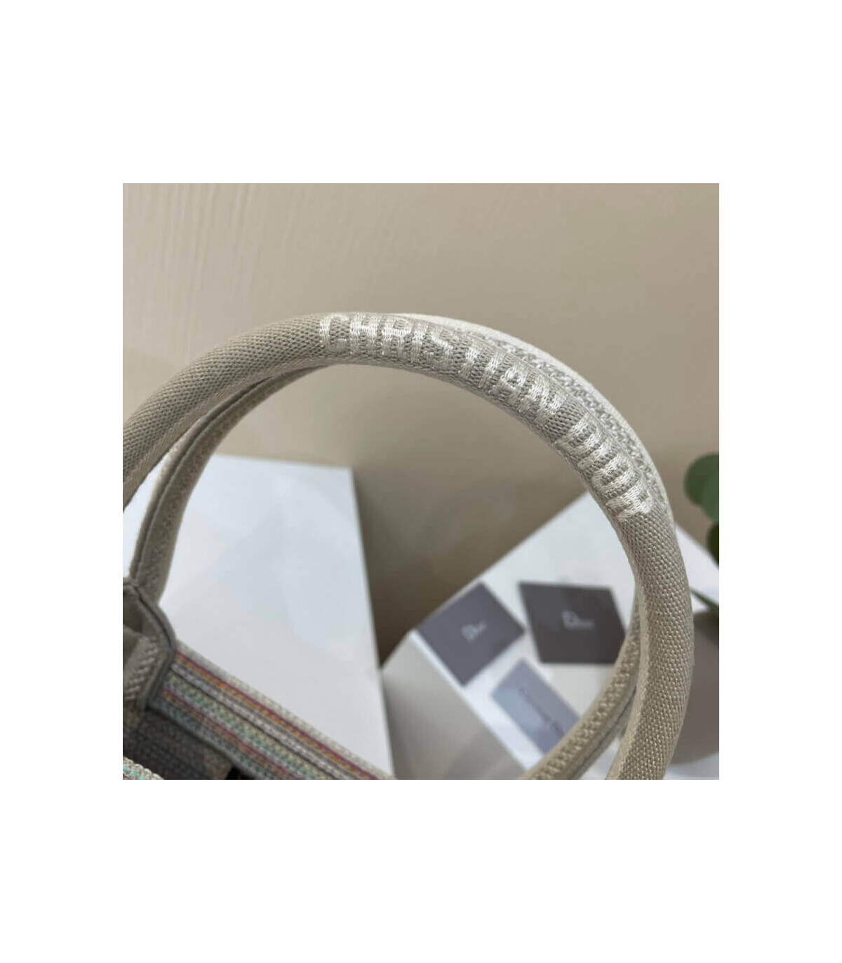 The Dior Book Tote, an original style introduced by Creative Director Maria Grazia Chiuri, has become a staple of the Dior aesthetic. This small style is part of the Dior Gold capsule collection and can hold all the daily essentials. It is fully embroidered with thin multicolor pastel stripes and enhanced with metallic thread. Adorned with the ‘Christian Dior’ signature on the front, the Dior Book Tote exemplifies the House’s signature savoir-faire and can be paired with other Dior Gold creations from the collection.