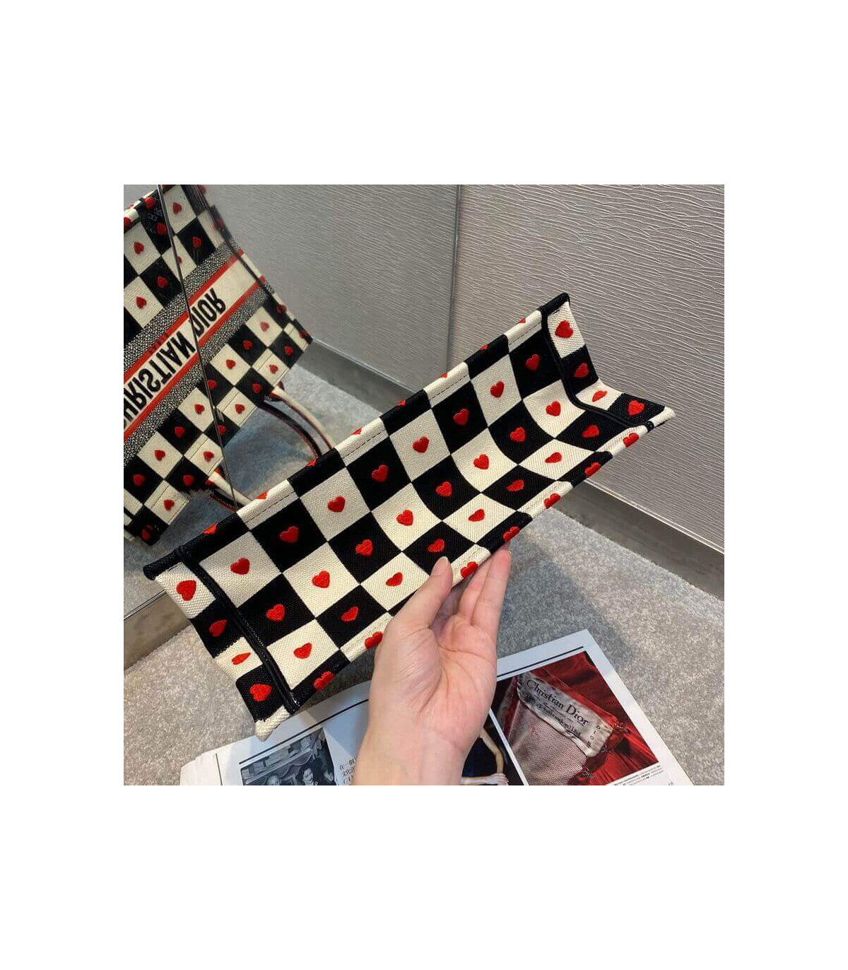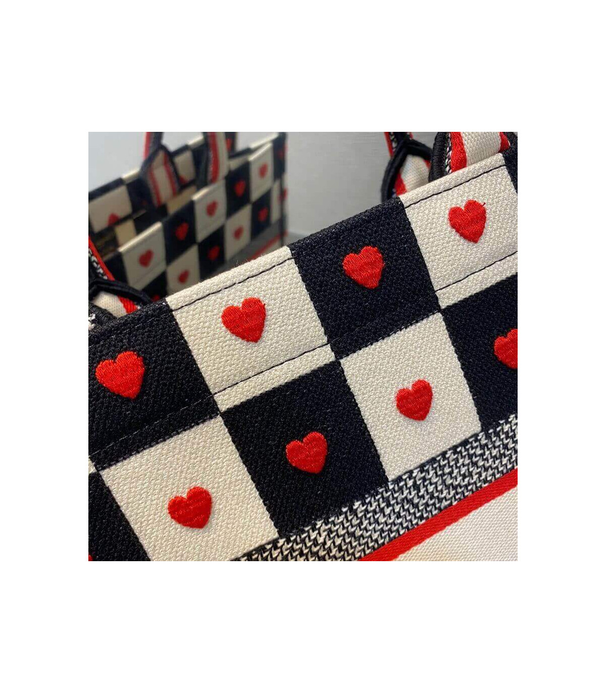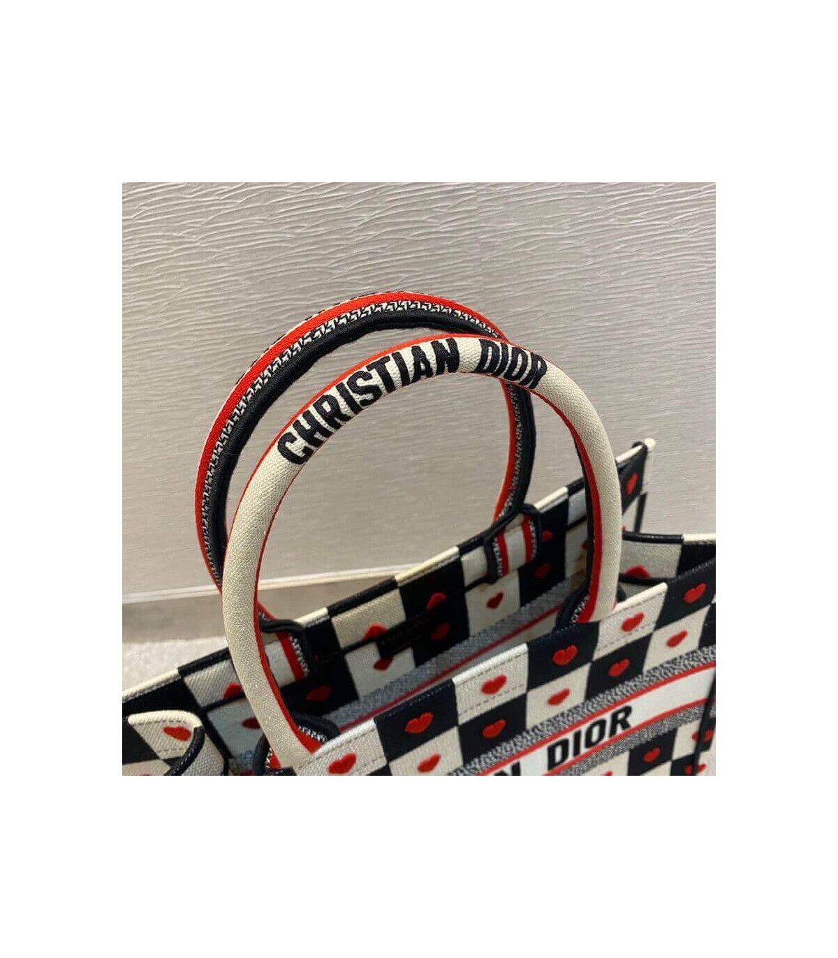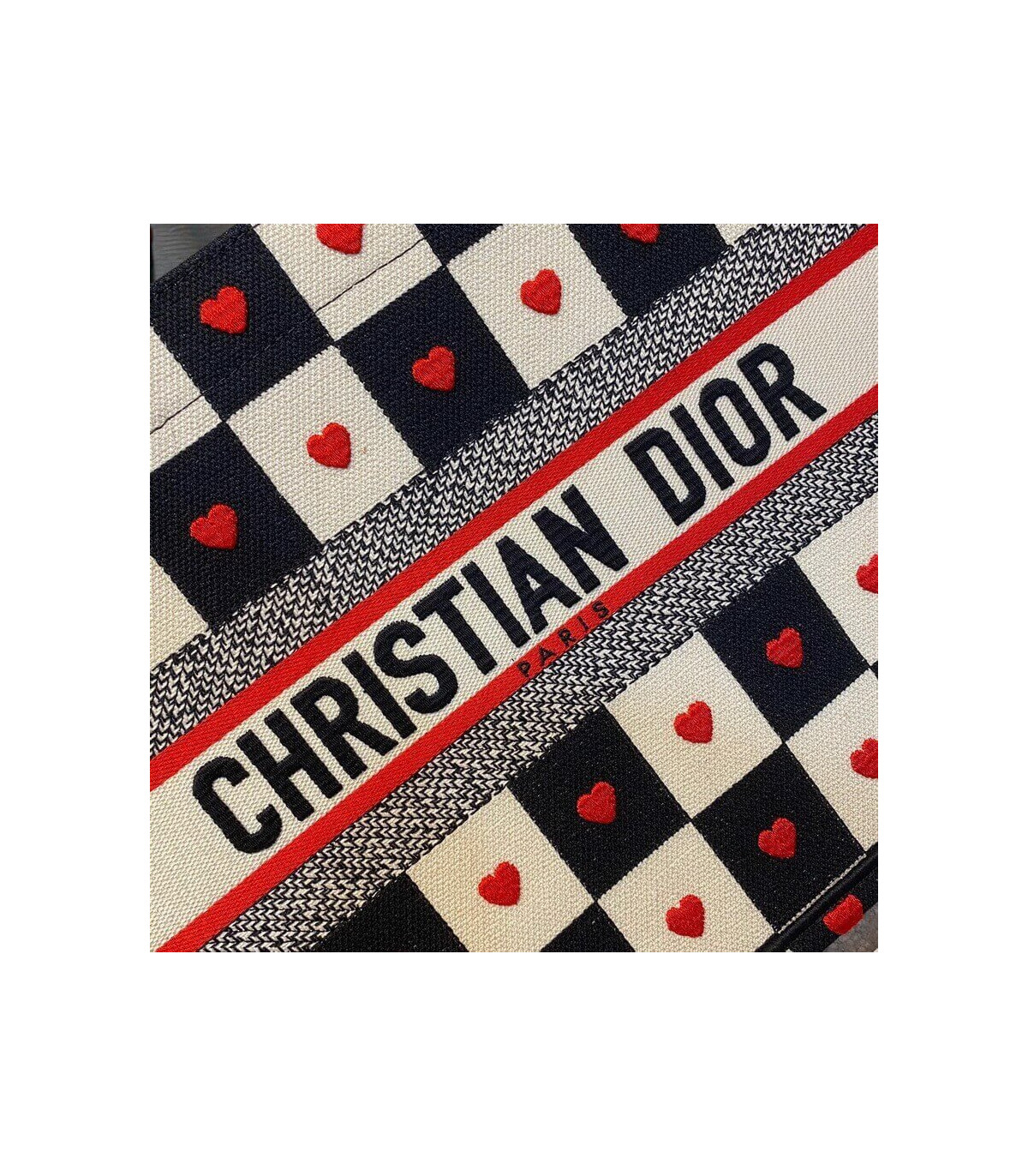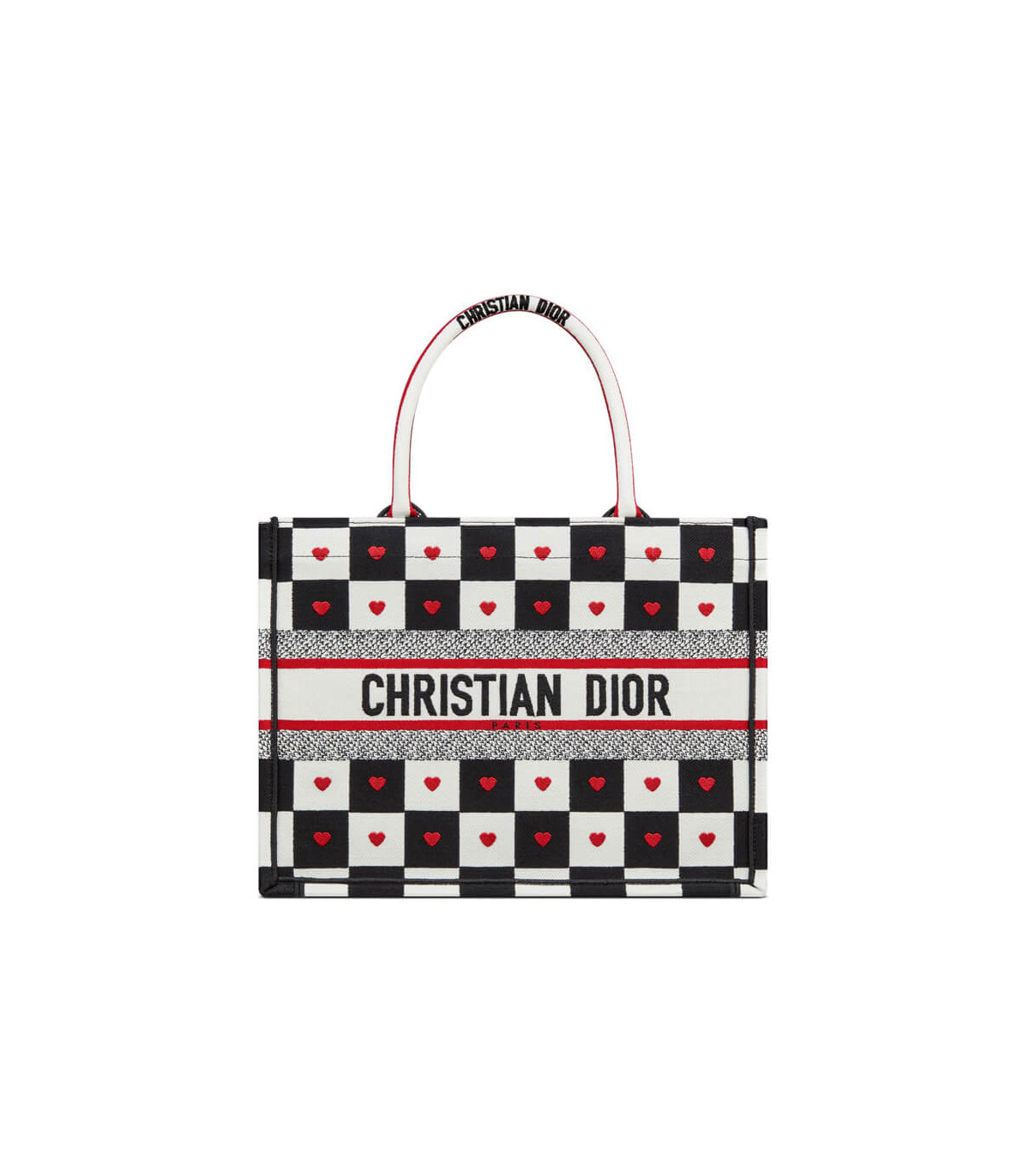 The Dior Book Tote, part of the Dioramour capsule, is an original creation introduced by Dior’s Creative Director, Maria Grazia Chiuri, and has become a staple of the Dior aesthetic. The design is part of the Dioramour capsule and is fully embroidered with the black, white and red D-Chess Heart motif, further adorned with the ‘CHRISTIAN DIOR’ signature on the front. The small tote exemplifies the House’s signature savoir-faire and may be carried by hand or worn over the shoulder.
