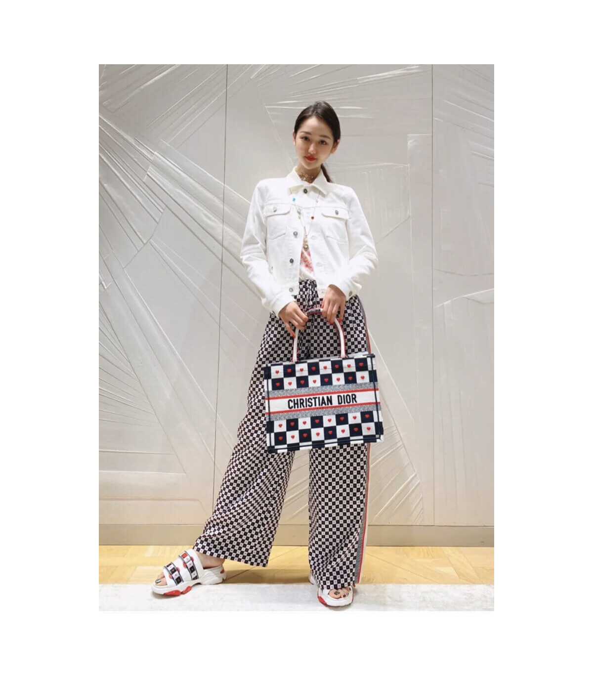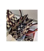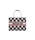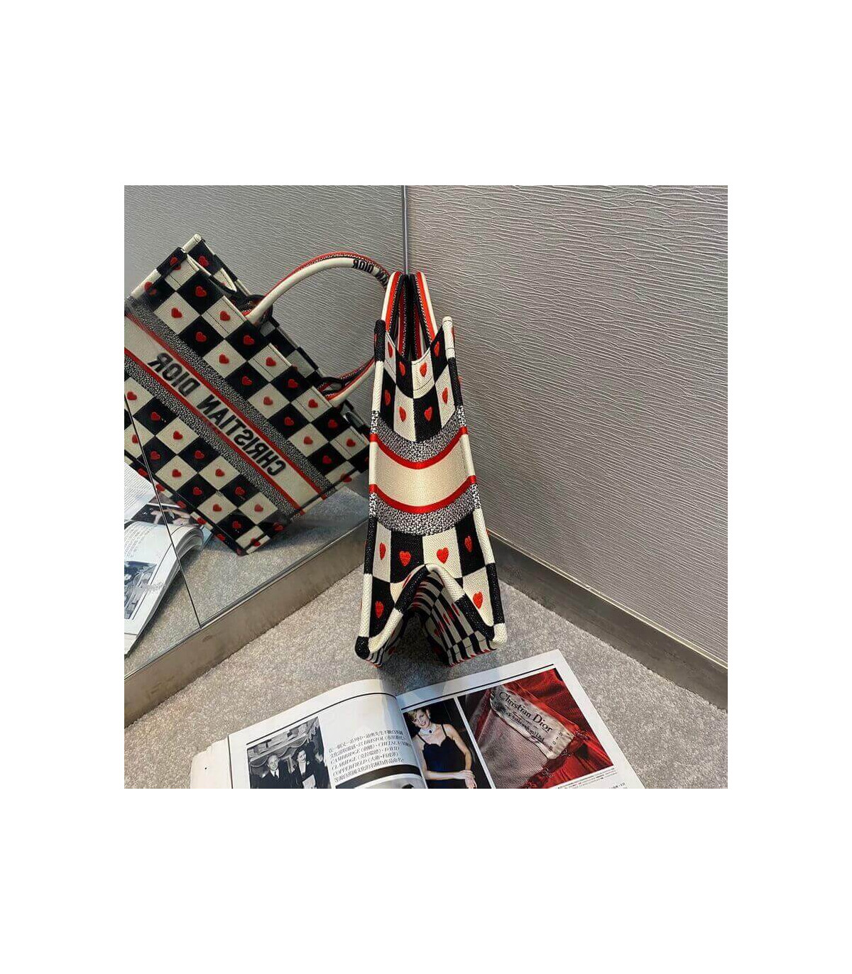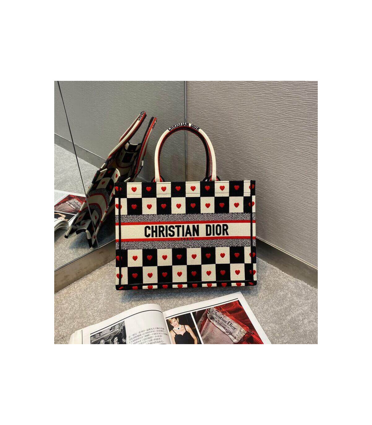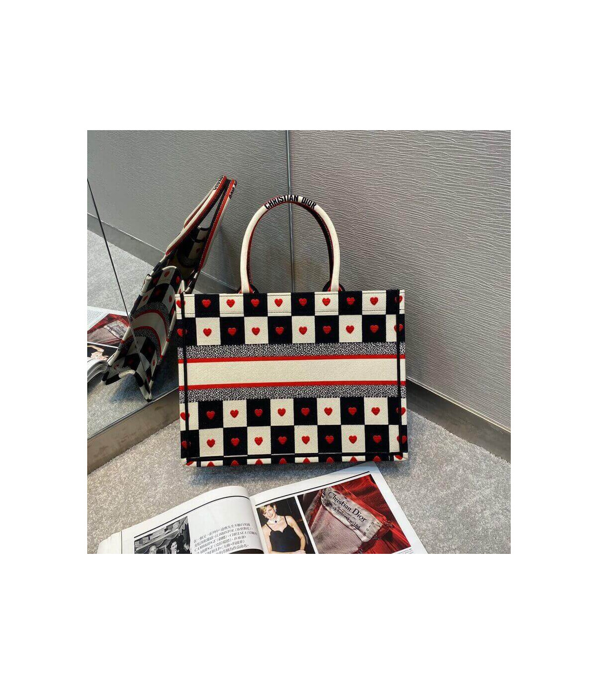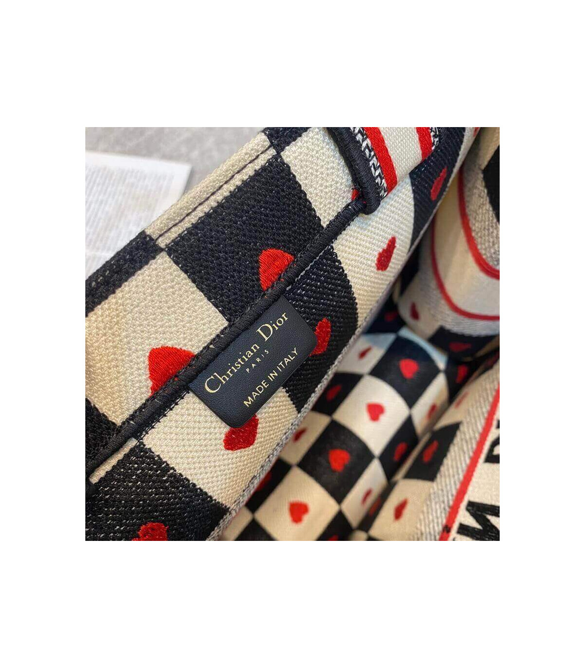 The Dior Book Tote, part of the Dioramour capsule, is an original creation introduced by Dior’s Creative Director, Maria Grazia Chiuri, and has become a staple of the Dior aesthetic. The design is part of the Dioramour capsule and is fully embroidered with the black, white and red D-Chess Heart motif, further adorned with the ‘CHRISTIAN DIOR’ signature on the front. The small tote exemplifies the House’s signature savoir-faire and may be carried by hand or worn over the shoulder.
