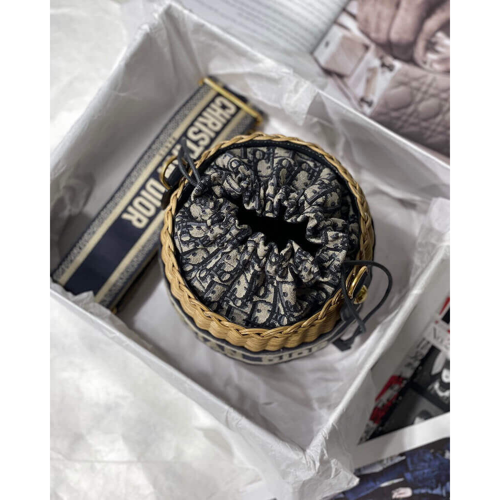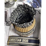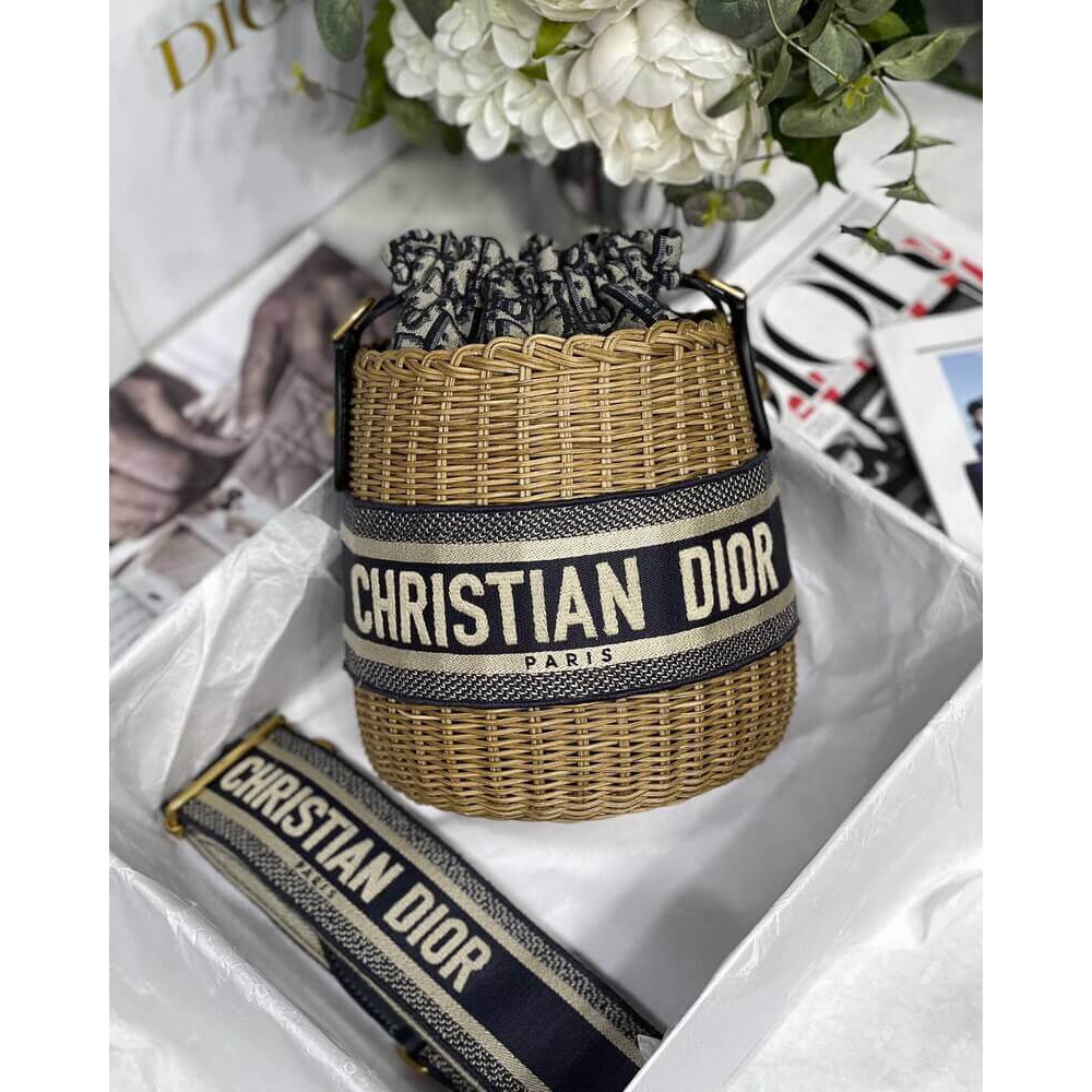 The Dior Wicker bucket bag is a timeless creation traditionally crafted in natural hand-woven wicker and exemplifies Dior’s savoir-faire. The design features a blue Dior Oblique jacquard interior pouch with a patch pocket and drawstring closure. Inspired by the hallmark Dior Book Tote, it showcases a band embroidered with the ‘CHRISTIAN DIOR’ signature, while the wide embroidered shoulder strap allows it to be worn over the shoulder or crossbody.