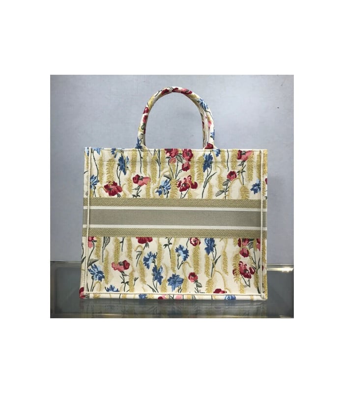 Dior Book Tote in Beige Multicolor Hibiscus Metallic Thread Embroidery