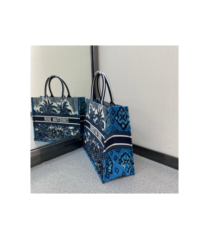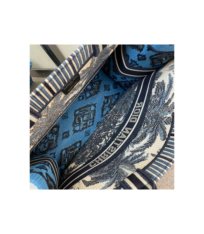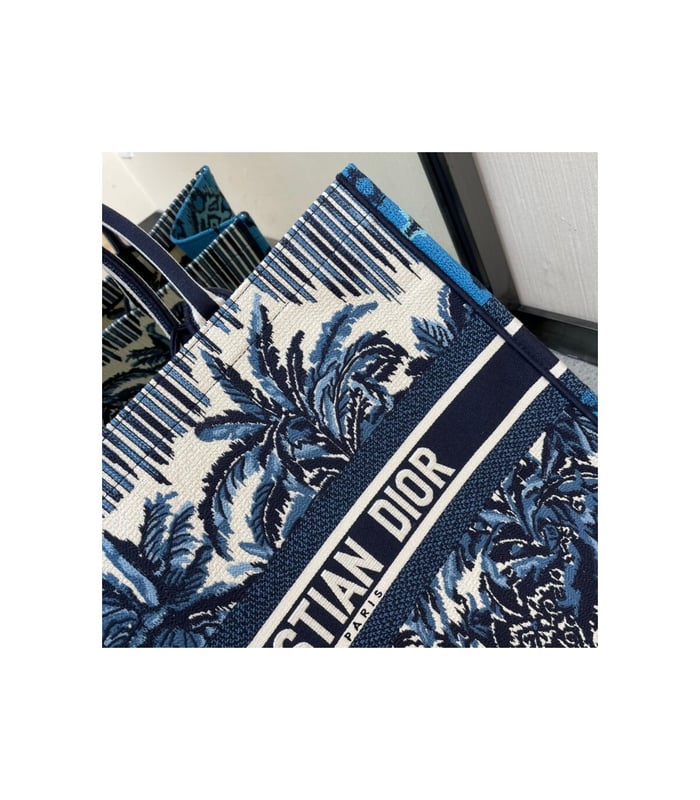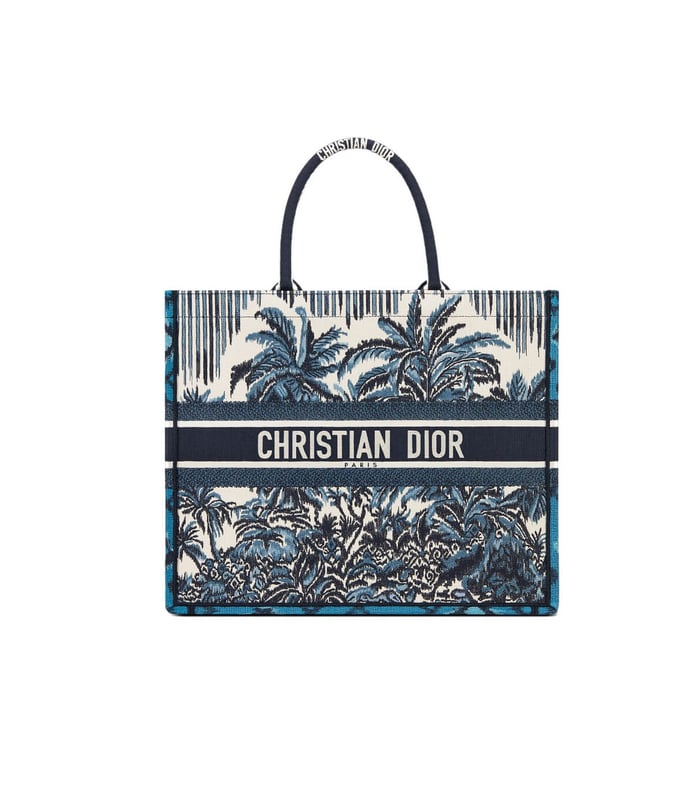 The Dior Book Tote, an original style introduced by Creative Director Maria Grazia Chiuri, has become a staple of the Dior aesthetic. Designed to carry all the daily essentials, the silhouette offers a new take on the hallmark Toile de Jouy with a fully embroidered variation with the blue Dior Palms motif. The front boasts a ‘Christian Dior’ signature while a graphic motif adorns the sides for a contrasting modern touch. The carryall is a prime example of Dior savoir-faire.