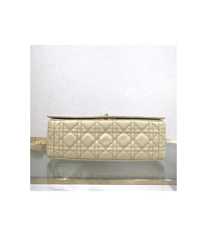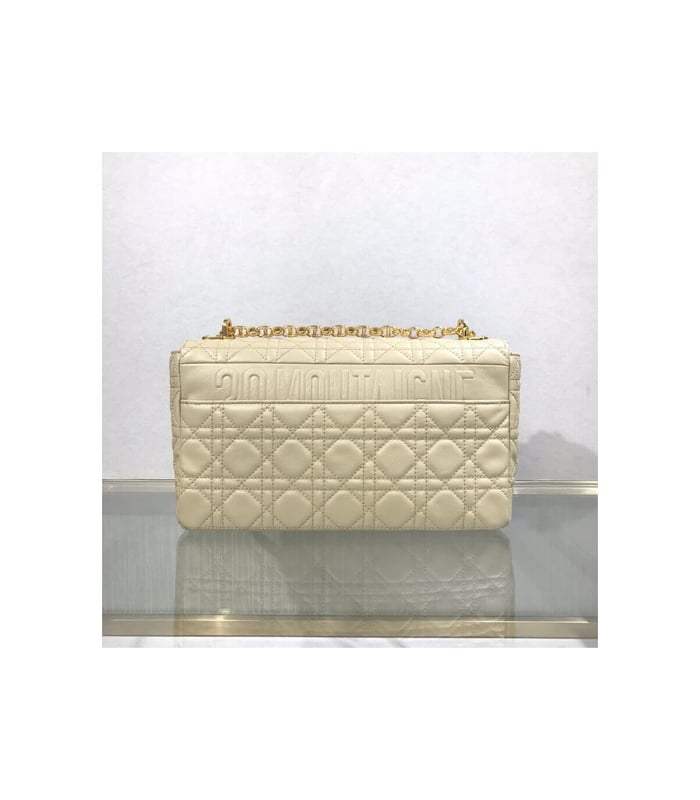 The new Dior Caro bag boasts Cannage stitching on black calfskin, showcasing the instantly recognizable quilted texture. The supple bag features a flap with the twist ‘CD’ clasp, inspired by the seal of a Christian Dior perfume bottle, styled in antique gold-finish metal. The removable signature ‘CD’ chain link shoulder strap can be replaced with a wide embroidered strap, allowing the large style to be worn during both the day and the evening for a modern, elegant look.