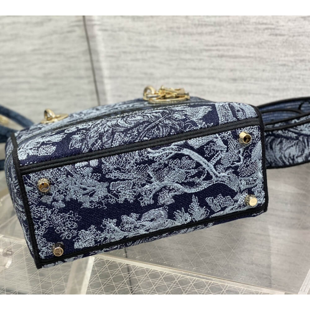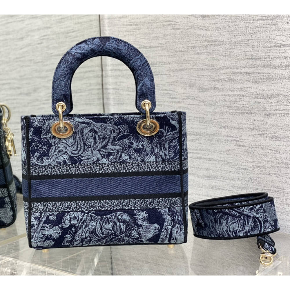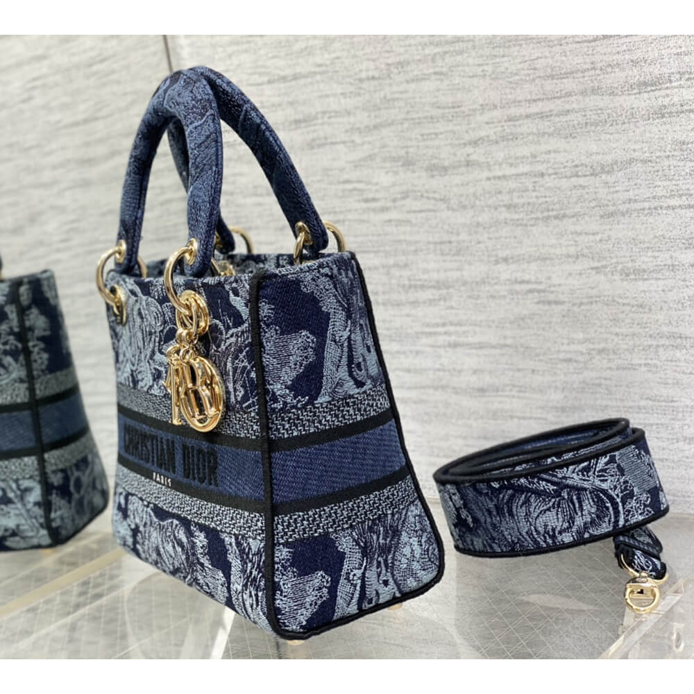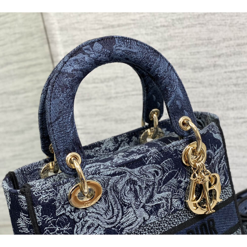 The Lady D-Lite bag embodies the House’s vision of elegance and beauty. Refined and sleek, the timeless creation is entirely embroidered with the denim blue Toile de Jouy motif. Pale gold-finish metal D.I.O.R. charms enhance and illuminate the silhouette. Equipped with a wide, reversible and removable embroidered shoulder strap, the medium Lady D-Lite bag can be carried by hand or worn crossbody.