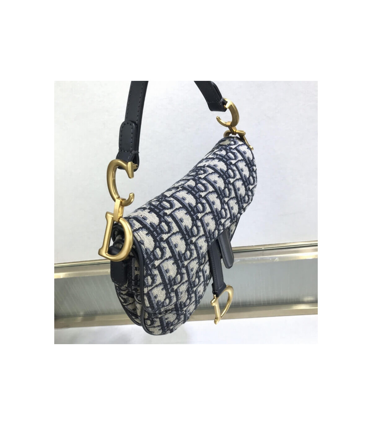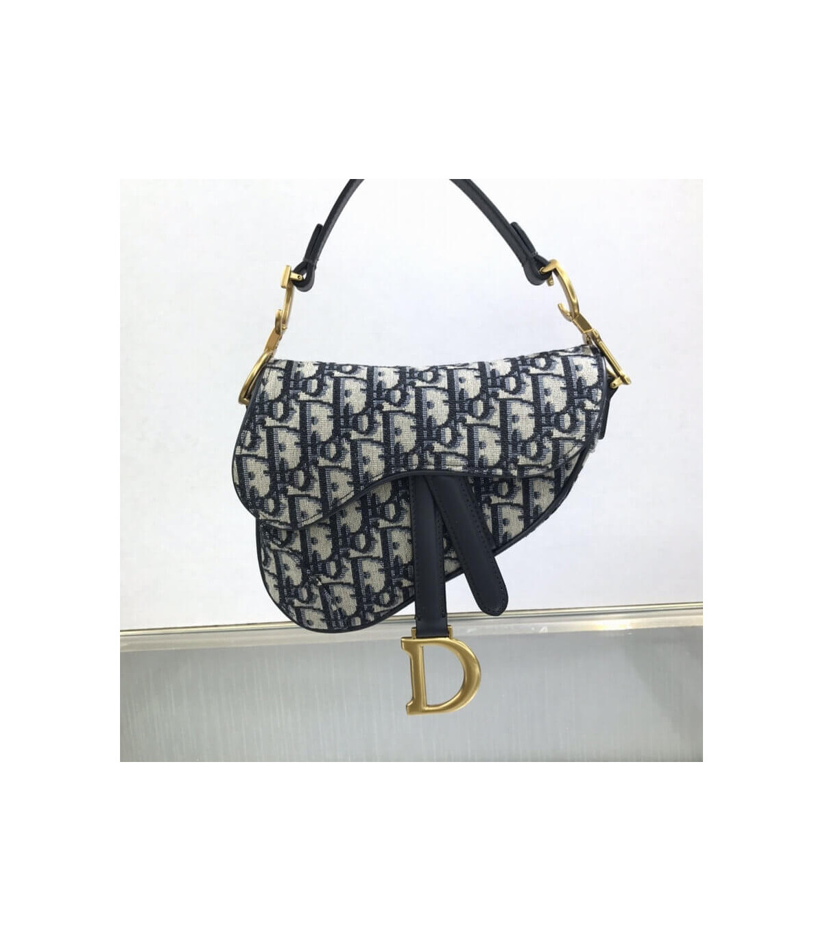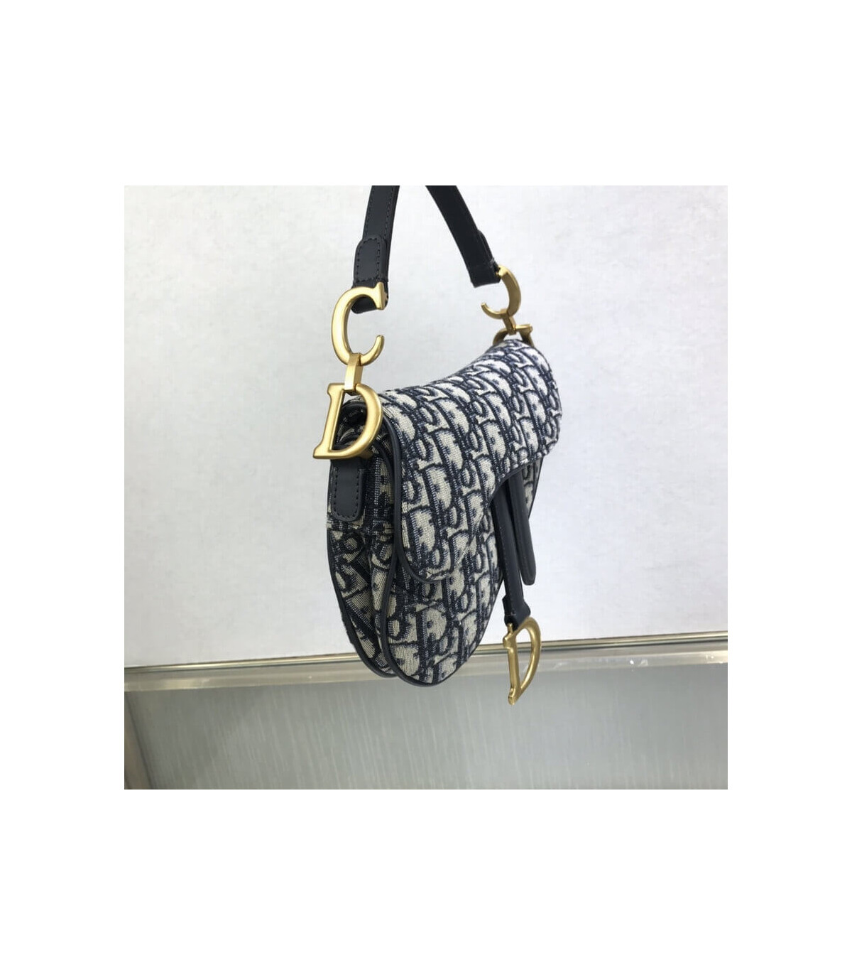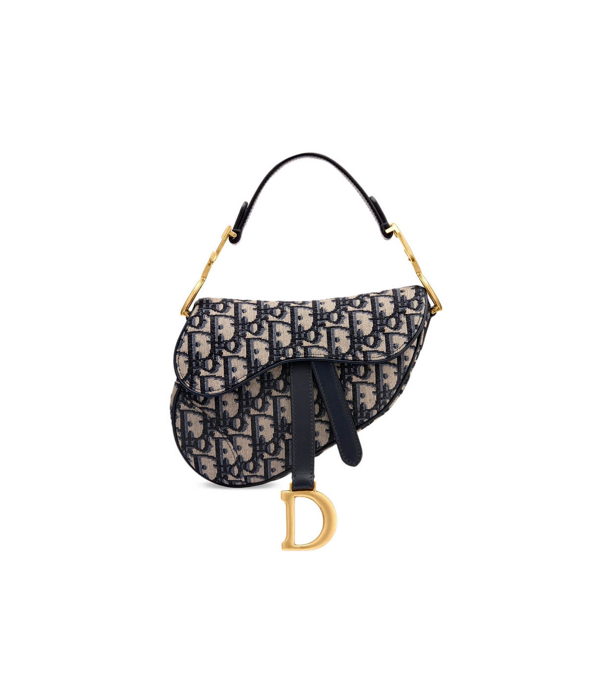 The iconic Saddle bag is reinvented once more by Maria Grazia Chiuri. Featuring a Saddle flap with a magnetic ‘D’ stirrup clasp, it boasts a ‘CD’ signature on each side of the handle. The blue Dior Oblique jacquard is embellished with antique gold-finish metal hardware. The miniature Saddle bag can be carried by hand as an ideal evening companion or customized with different shoulder straps.