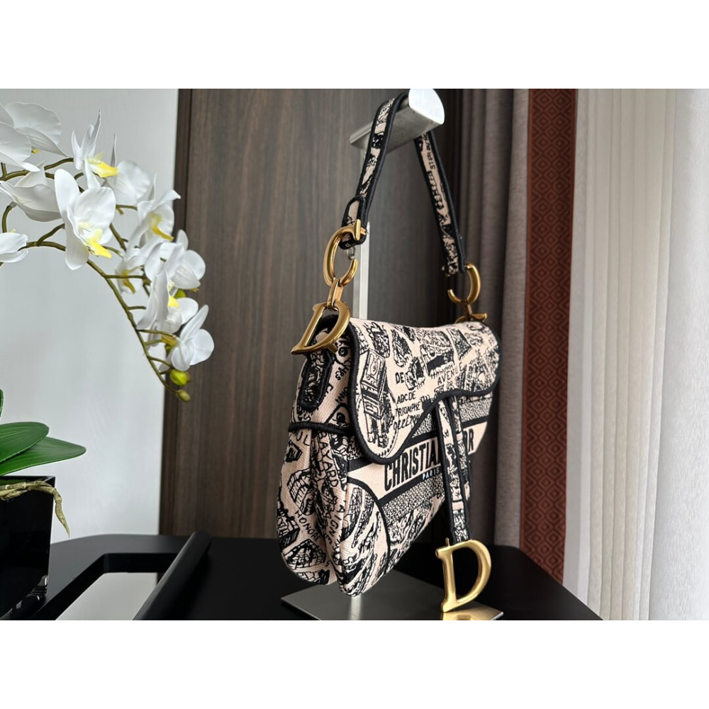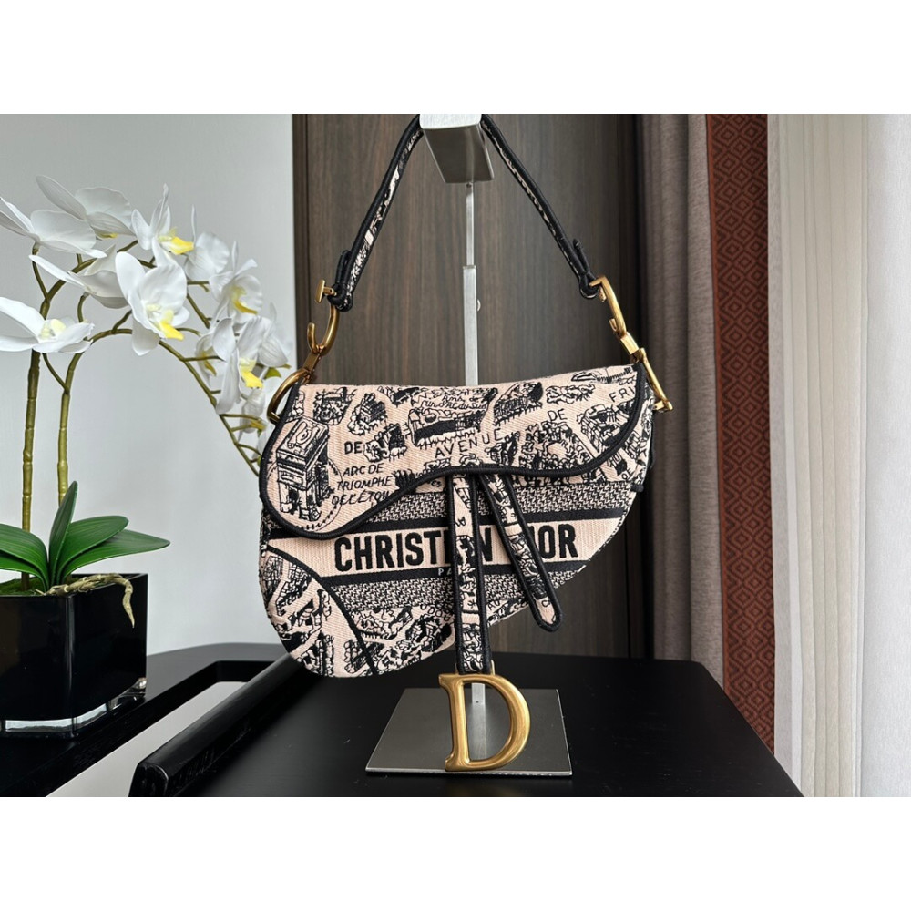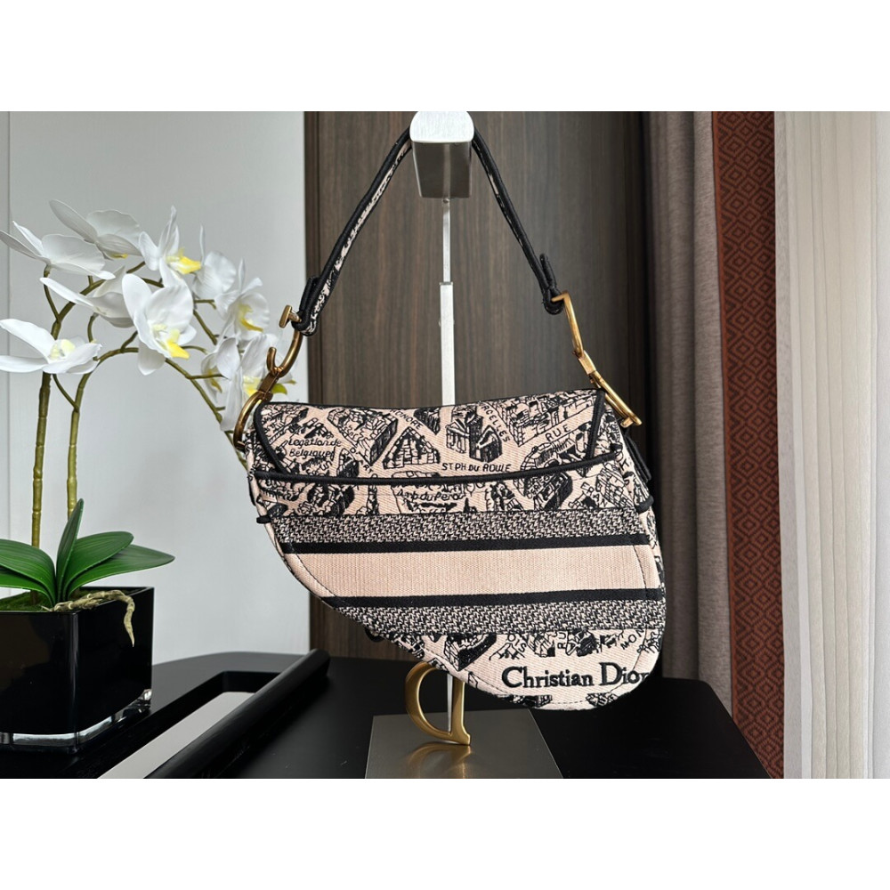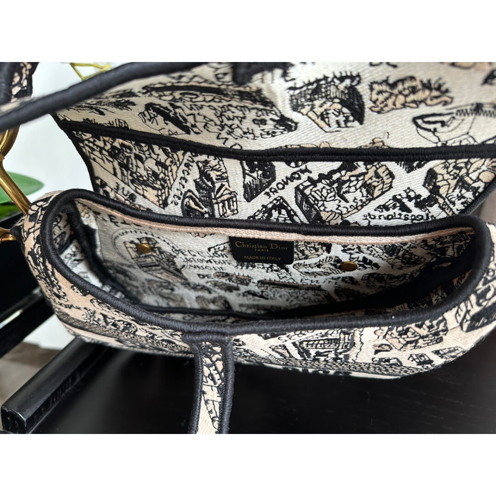 Maria Grazia Chiuri brings a fresh update to the iconic Saddle bag. The design is fully embroidered with the beige and black Plan de Paris motif, inspired by House archives and centered around Dior’s historic Avenue Montaigne address. The legendary style features a Saddle flap with a magnetic D stirrup clasp with pulls and showcases an antique gold-finish metal CD signature on each side of the handle. The bag can be carried by hand or worn over the shoulder and may be customized with different shoulder straps.