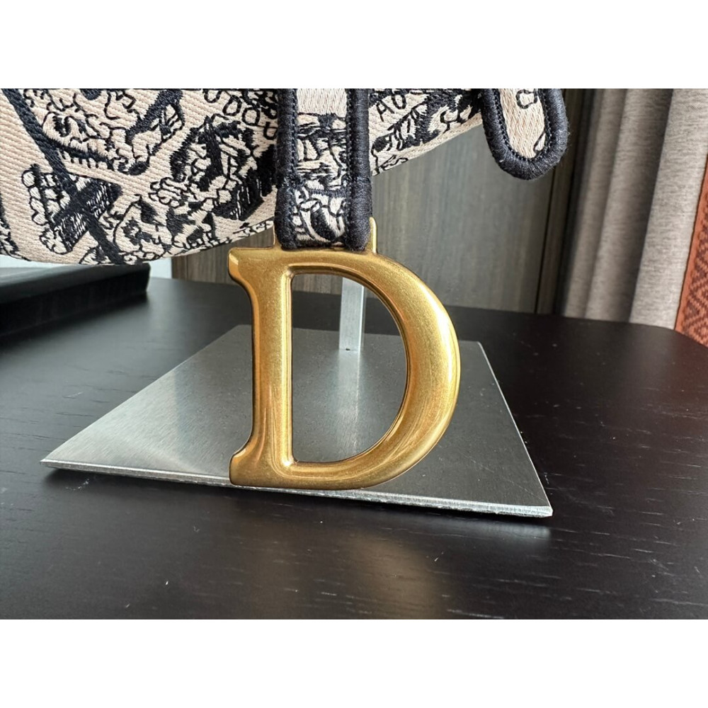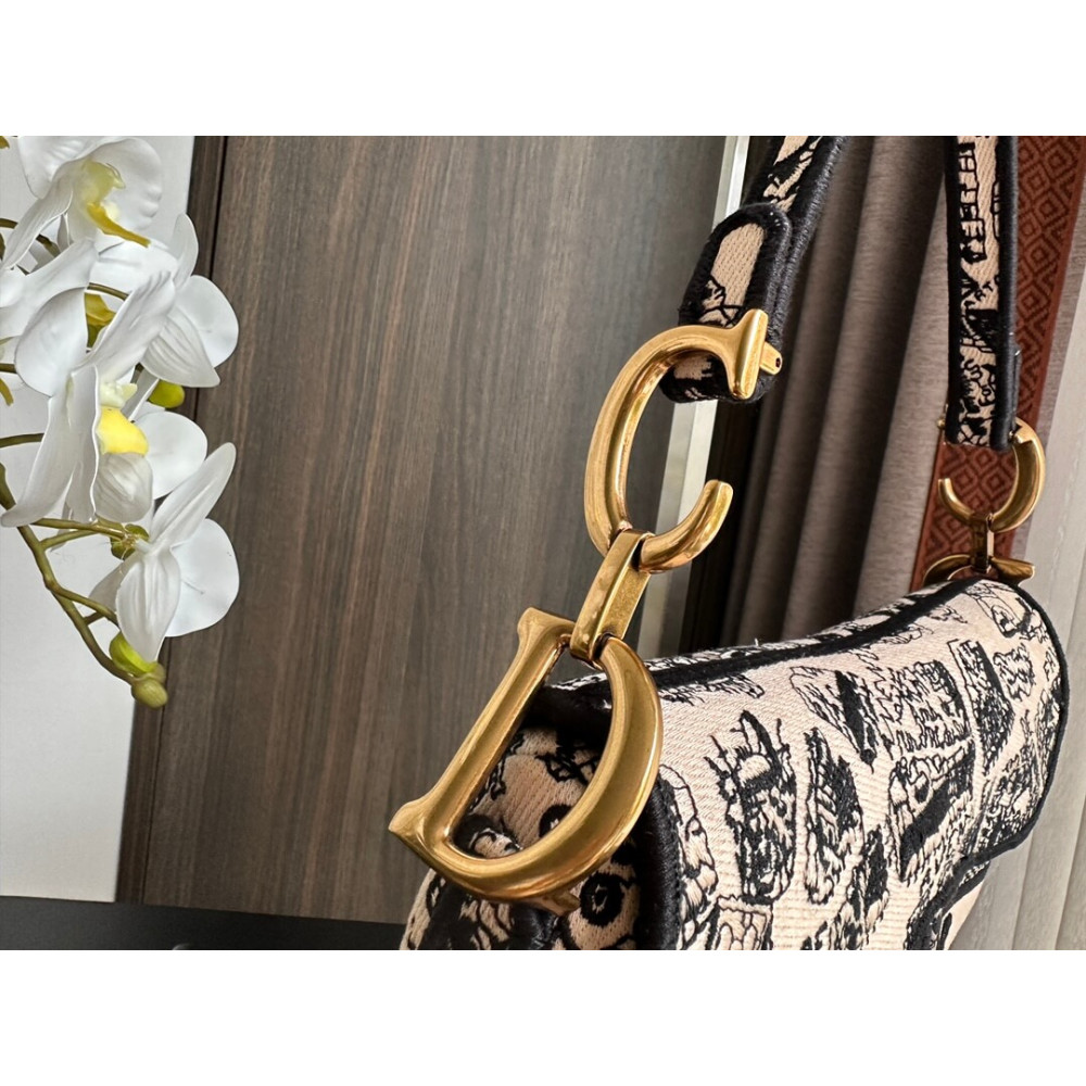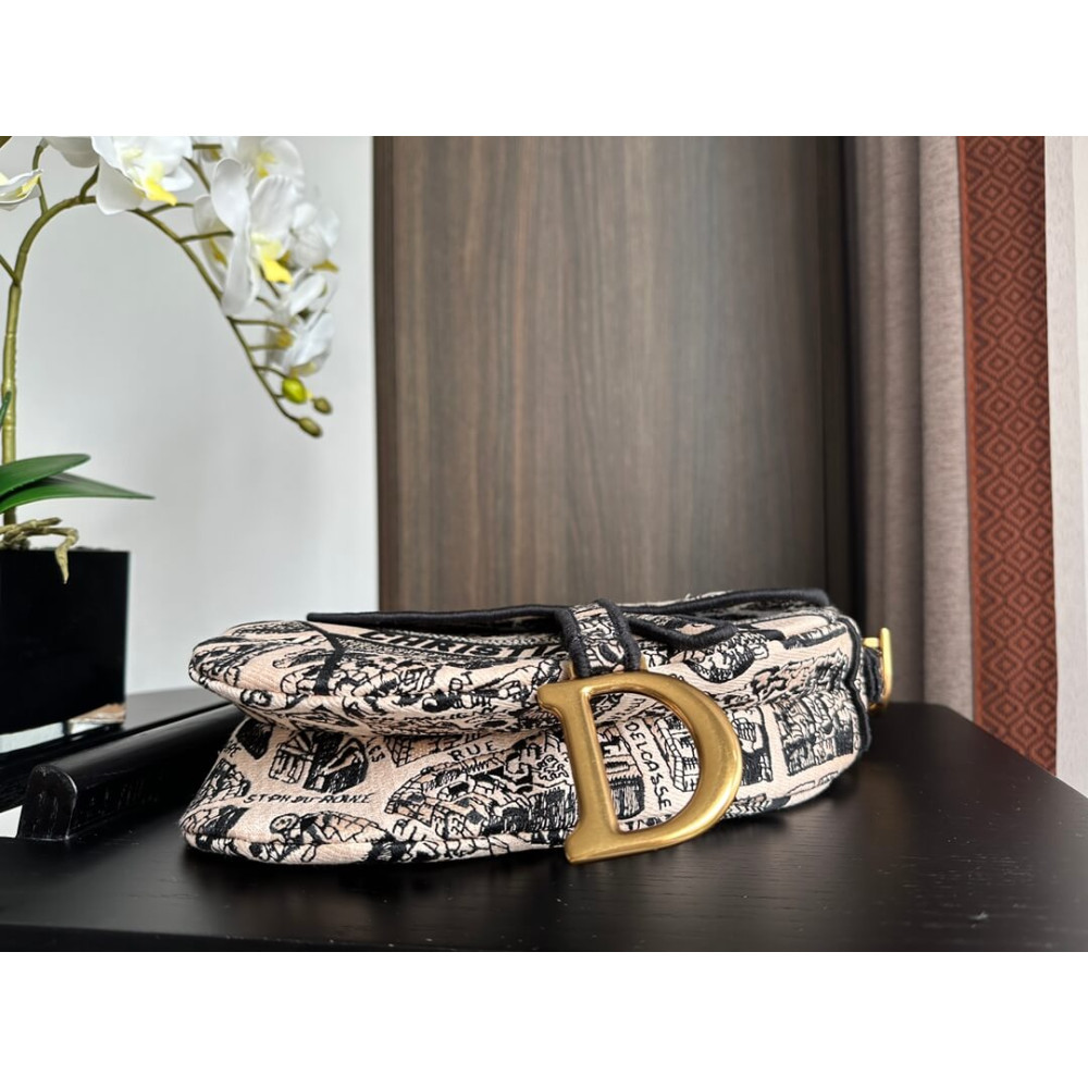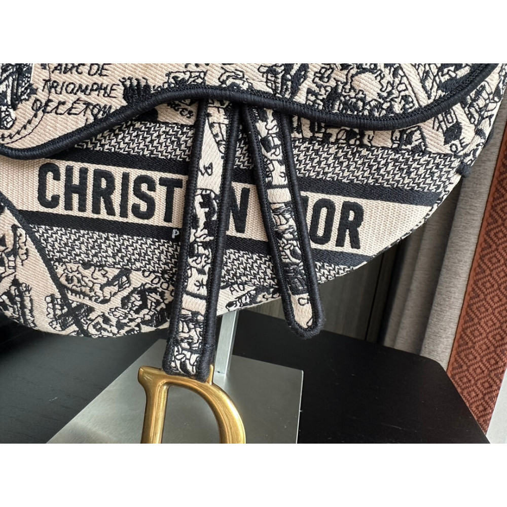 Maria Grazia Chiuri brings a fresh update to the iconic Saddle bag. The design is fully embroidered with the beige and black Plan de Paris motif, inspired by House archives and centered around Dior’s historic Avenue Montaigne address. The legendary style features a Saddle flap with a magnetic D stirrup clasp with pulls and showcases an antique gold-finish metal CD signature on each side of the handle. The bag can be carried by hand or worn over the shoulder and may be customized with different shoulder straps.