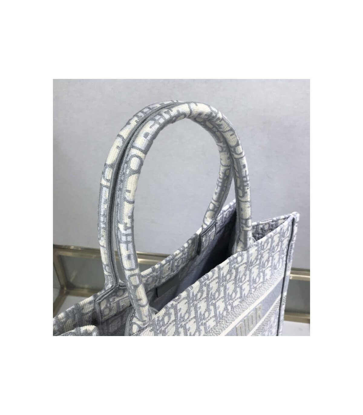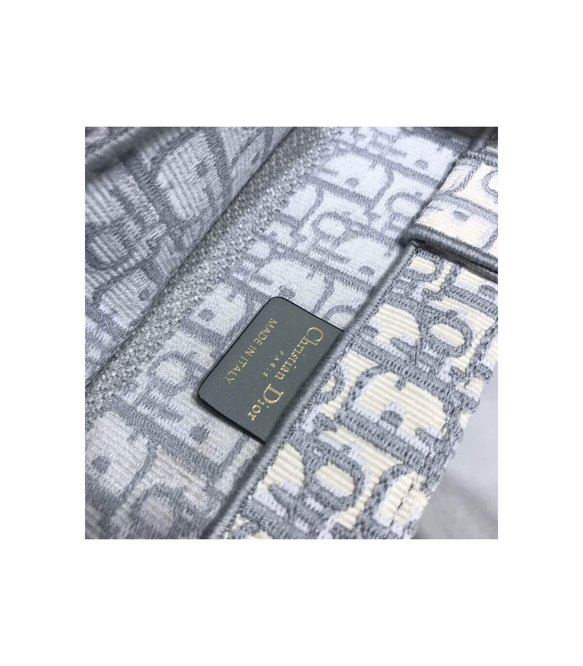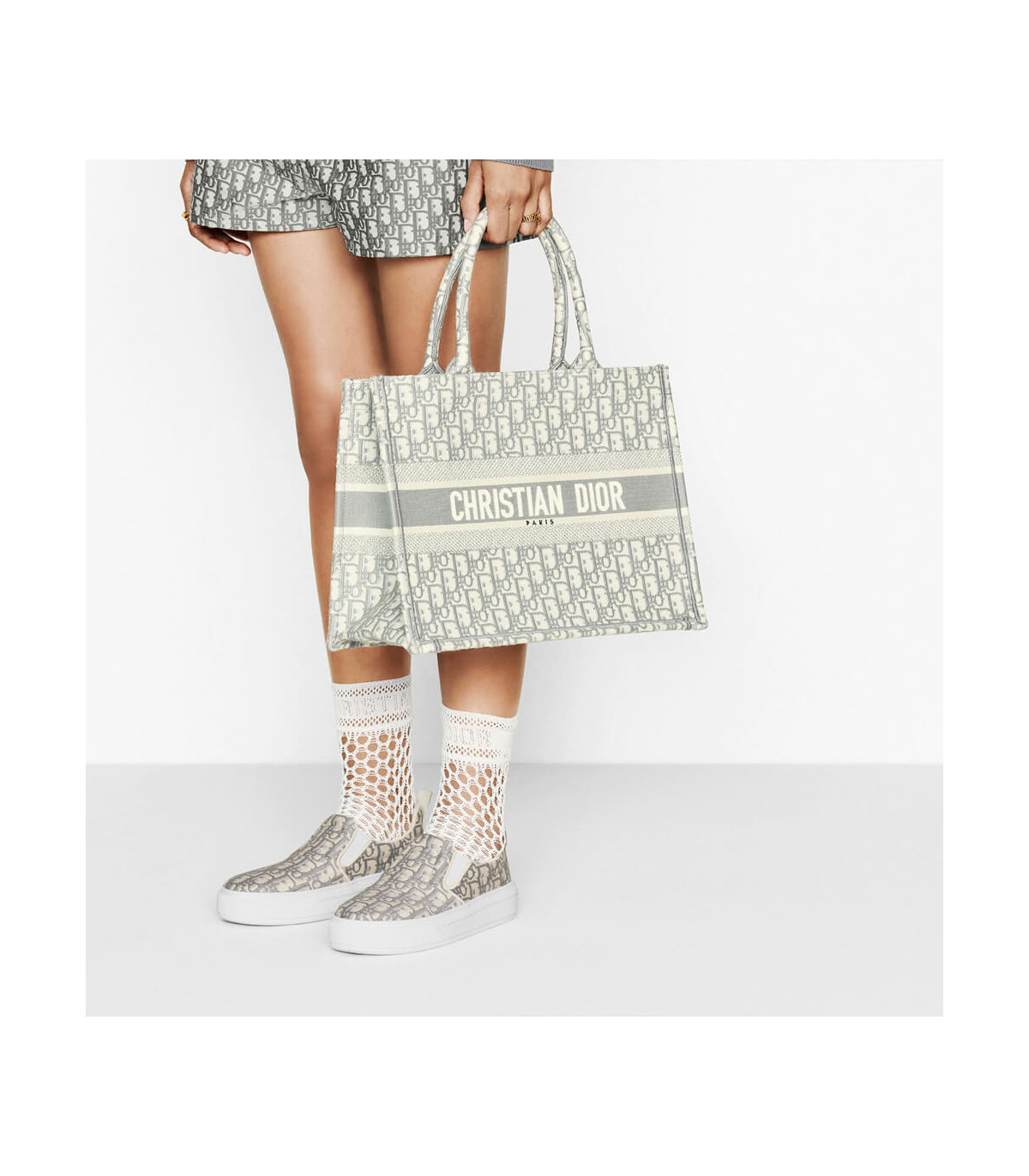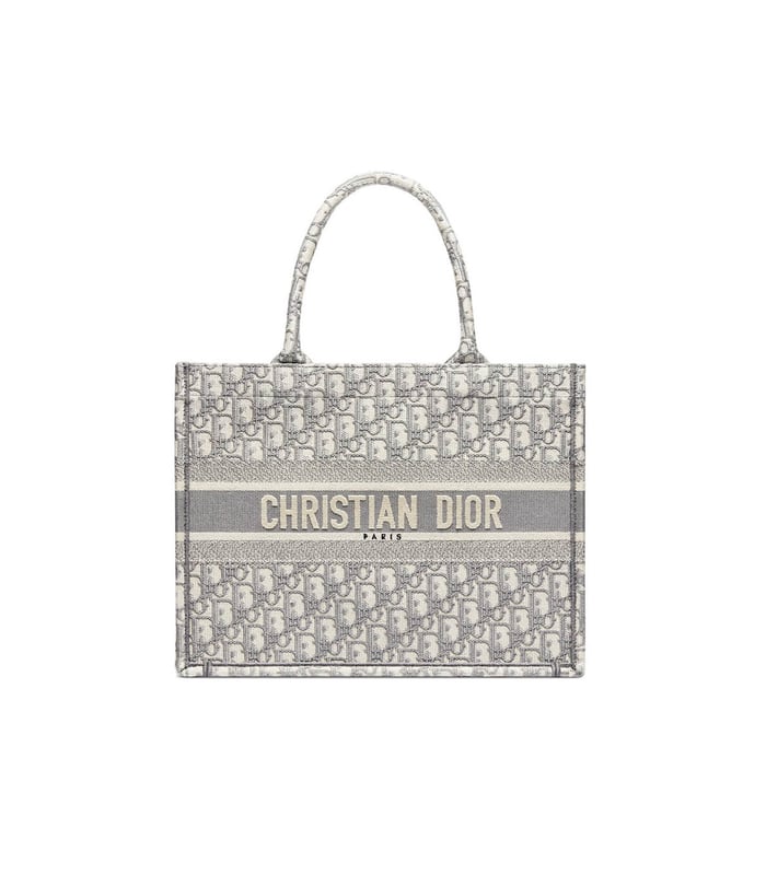The Dior Book Tote, an original style introduced by Creative Director Maria Grazia Chiuri, has become a staple of the Dior aesthetic. Ideally designed to carry all your daily essentials, the small shape is fully embroidered with a gray Dior Oblique pattern and the ‘Christian Dior’ signature on the front. This carryall is a perfect example of the Dior savoir-faire and it may be worn with other small accessories or the Mitzah scarf for a complete look.