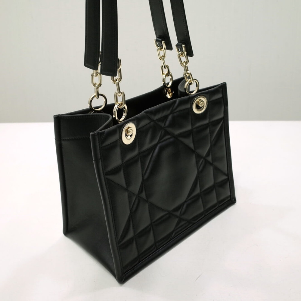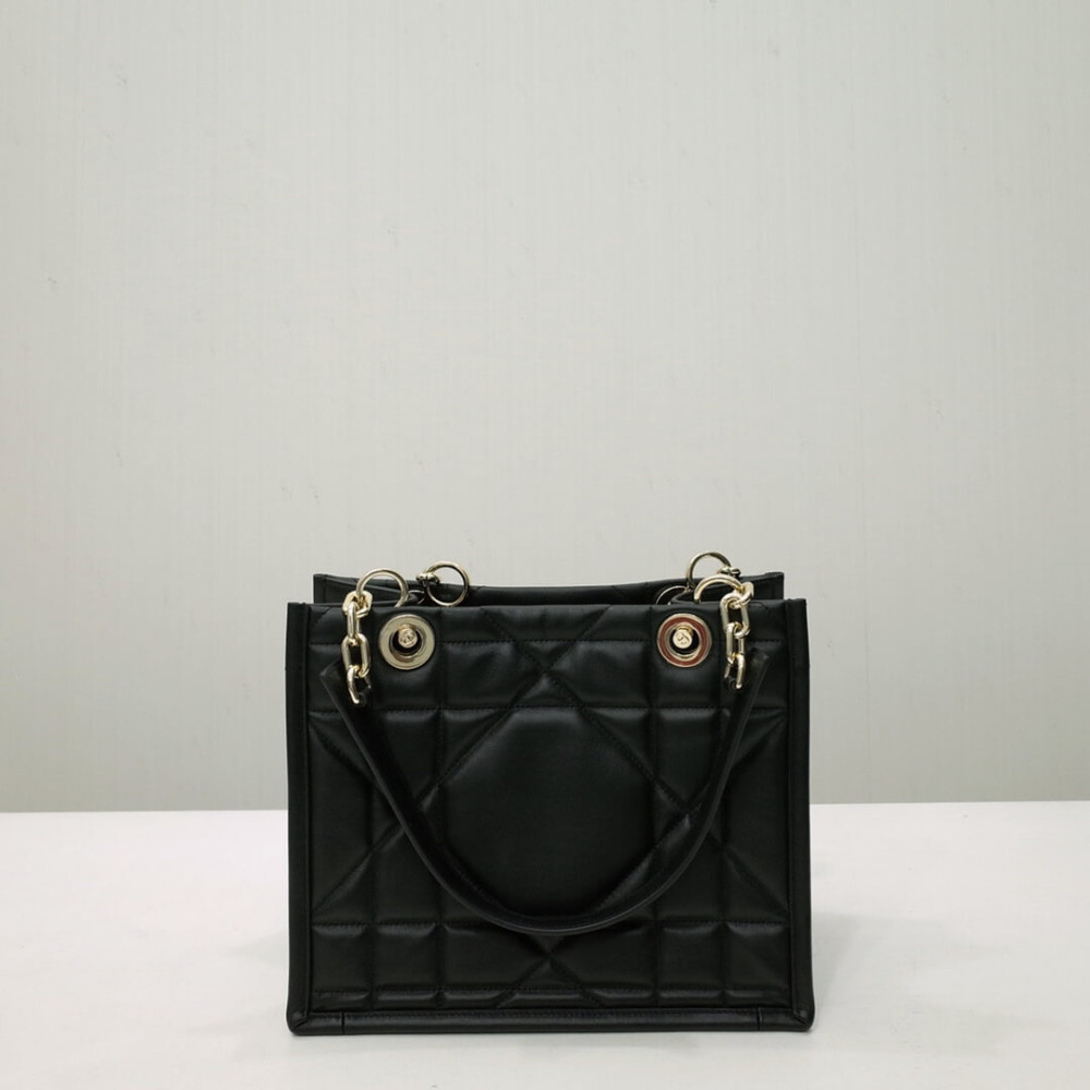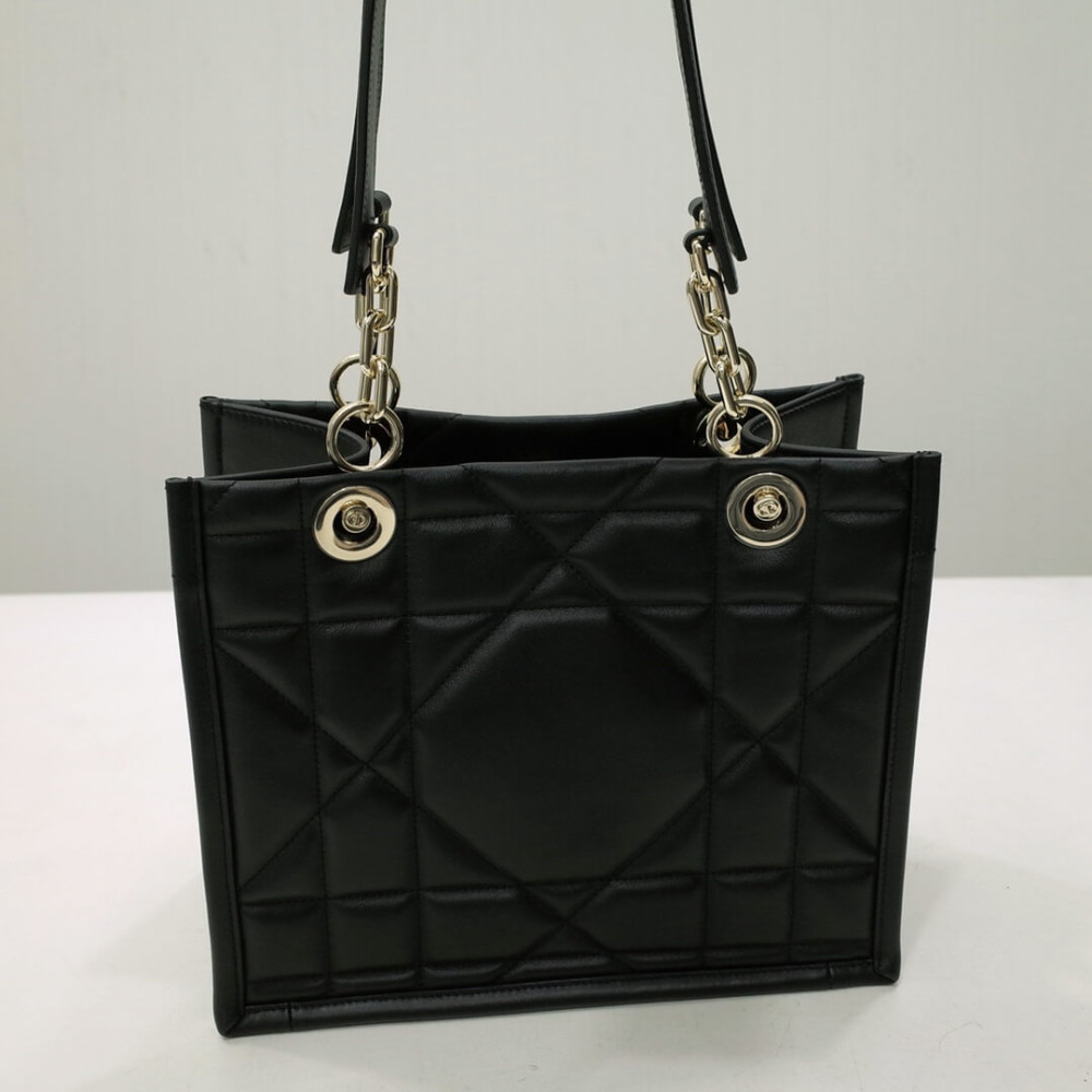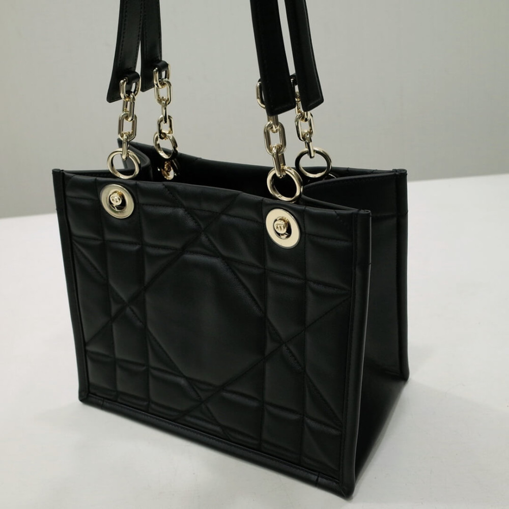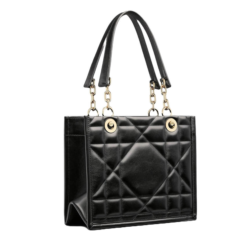 A new House staple debuted at the Fall-Winter 2022-2023 ready-to-wear fashion show, the Dior Essential tote bag presents a functional design with modern elegance. Crafted in black satin-finish calfskin, it is adorned with the Archicannage motif offering a new take on the iconic House topstitching. The spacious interior features three patch pockets and one zipped pocket to accommodate all of the essentials. Featuring leather and pale gold-finish metal chain top handles, the small tote may be worn over the shoulder or carried by hand as an ideal daily companion.