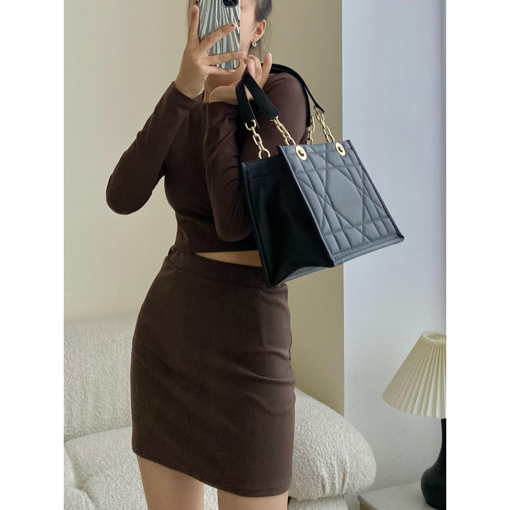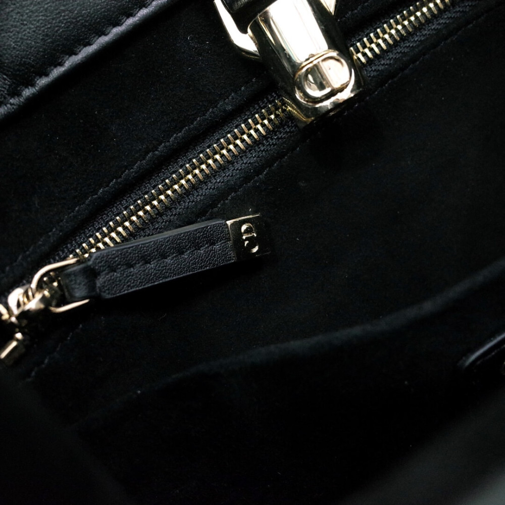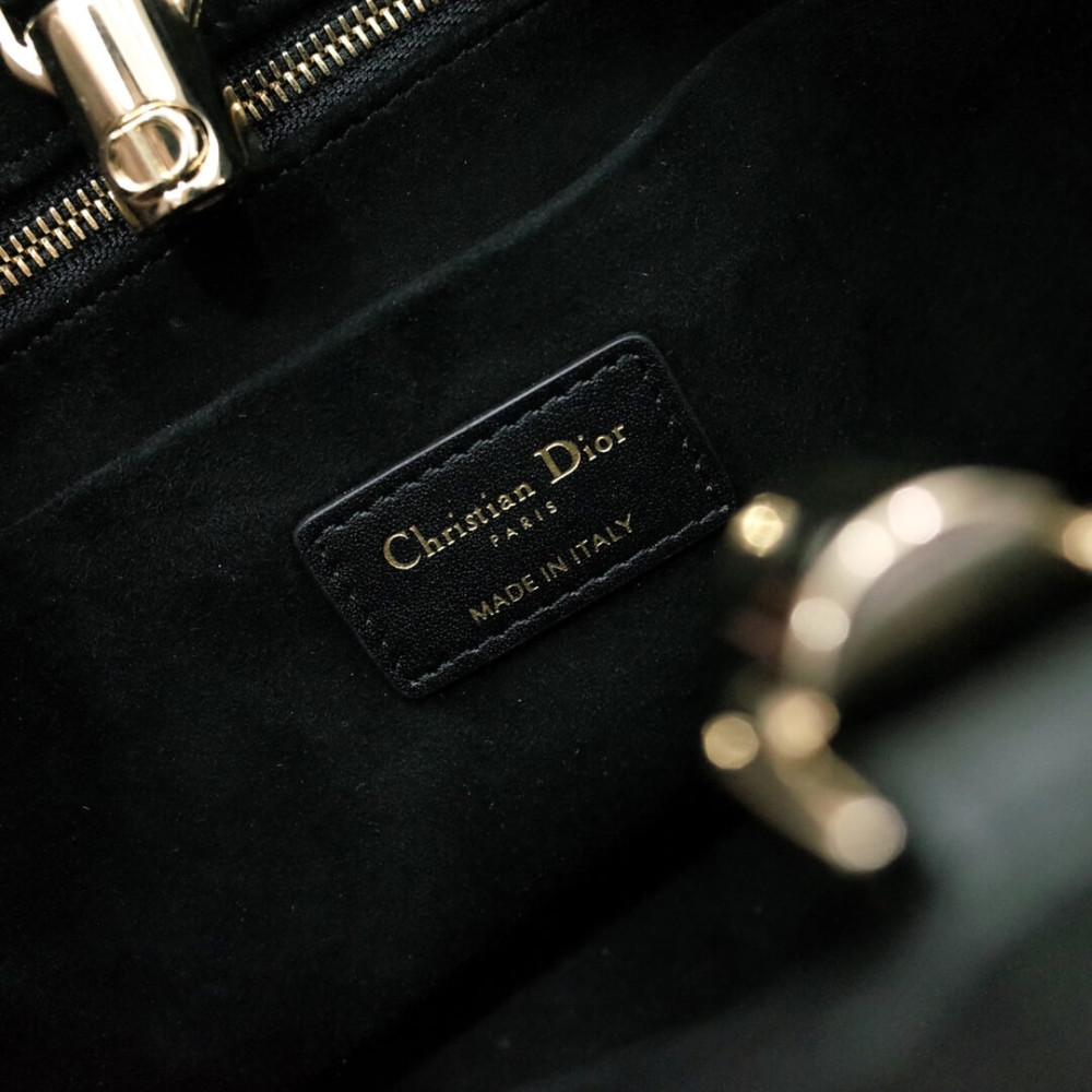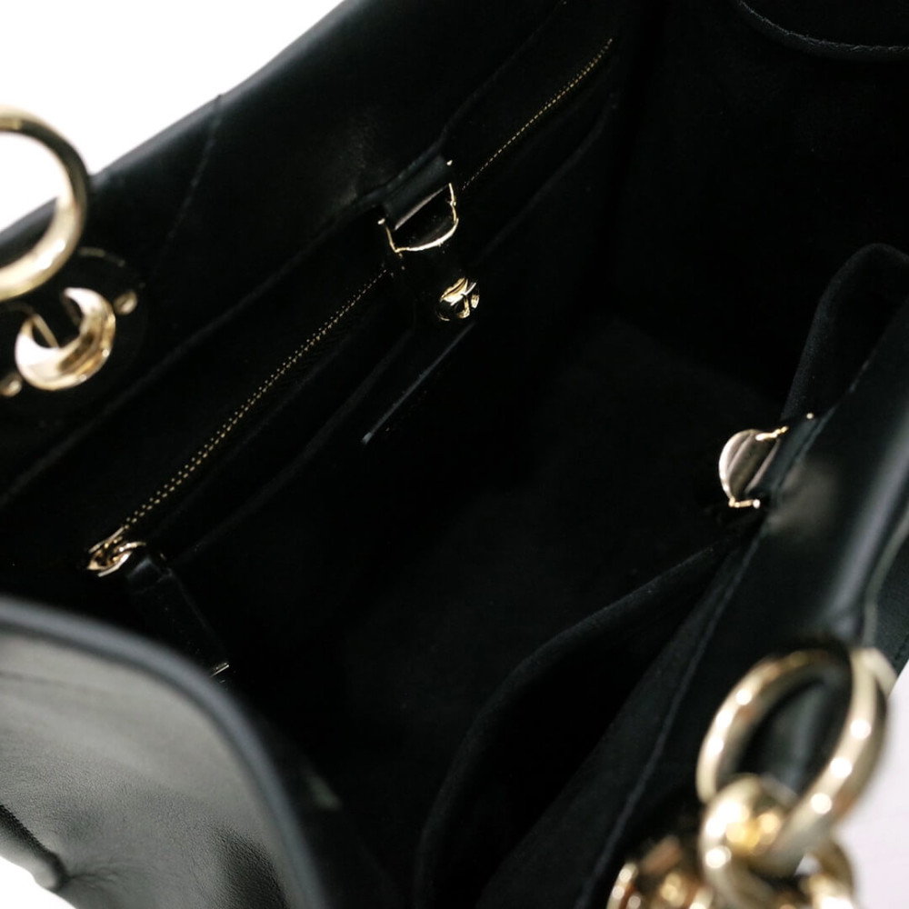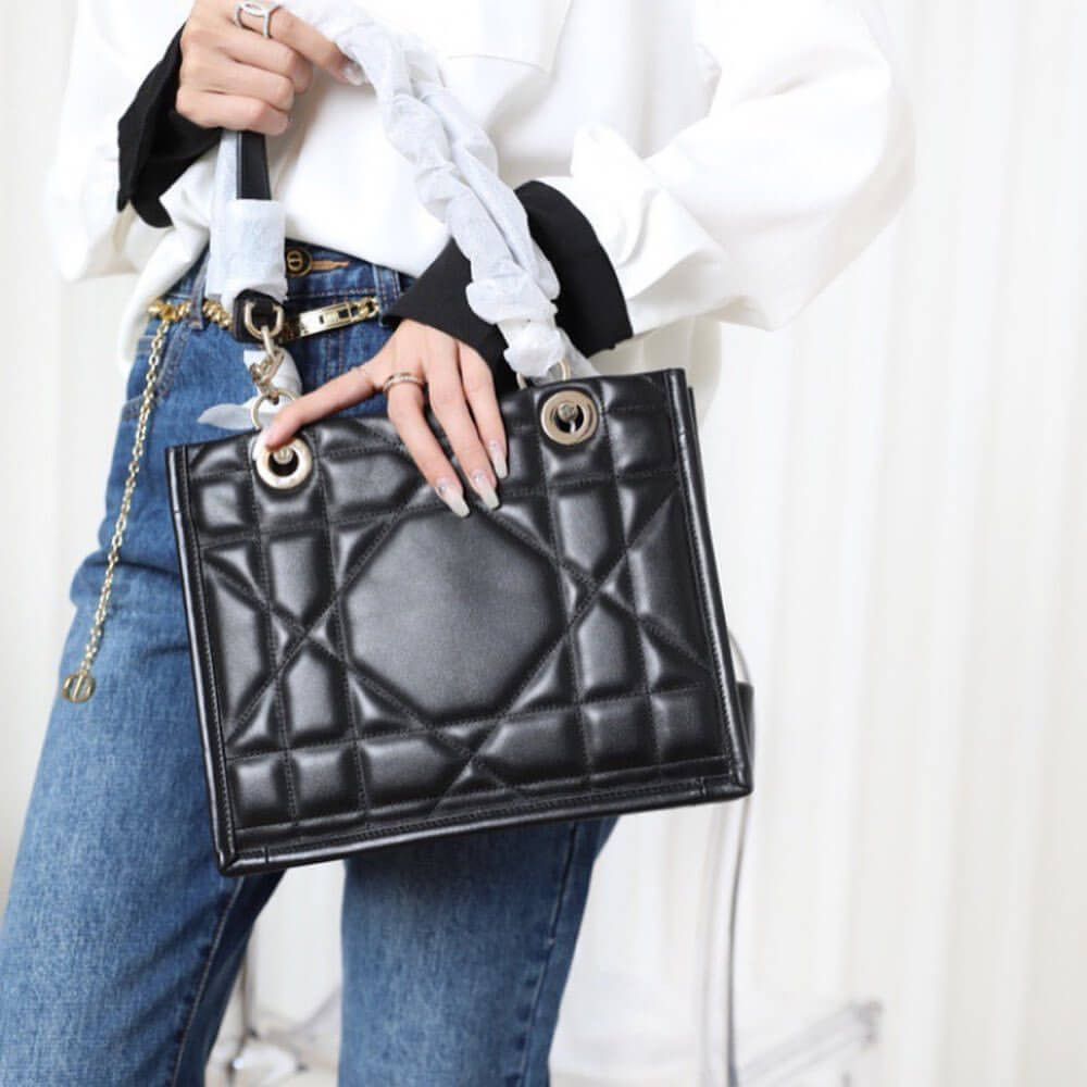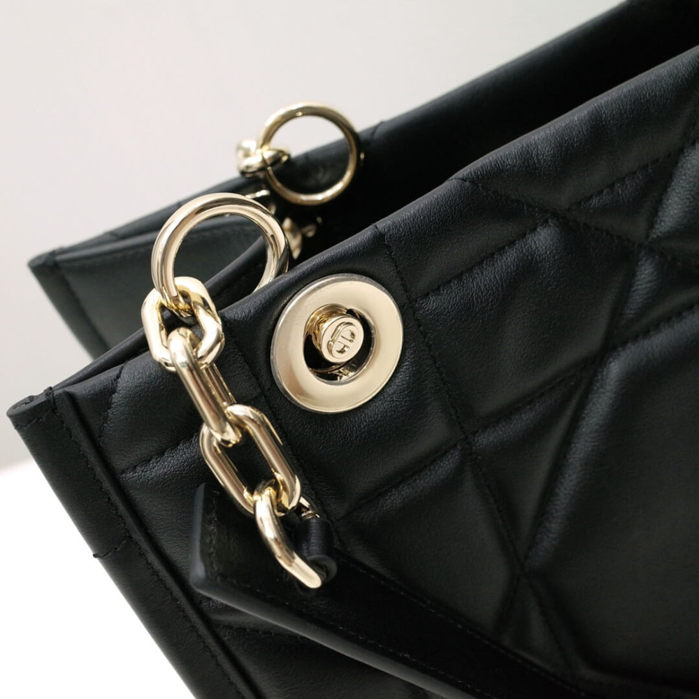A new House staple debuted at the Fall-Winter 2022-2023 ready-to-wear fashion show, the Dior Essential tote bag presents a functional design with modern elegance. Crafted in black satin-finish calfskin, it is adorned with the Archicannage motif offering a new take on the iconic House topstitching. The spacious interior features three patch pockets and one zipped pocket to accommodate all of the essentials. Featuring leather and pale gold-finish metal chain top handles, the small tote may be worn over the shoulder or carried by hand as an ideal daily companion.