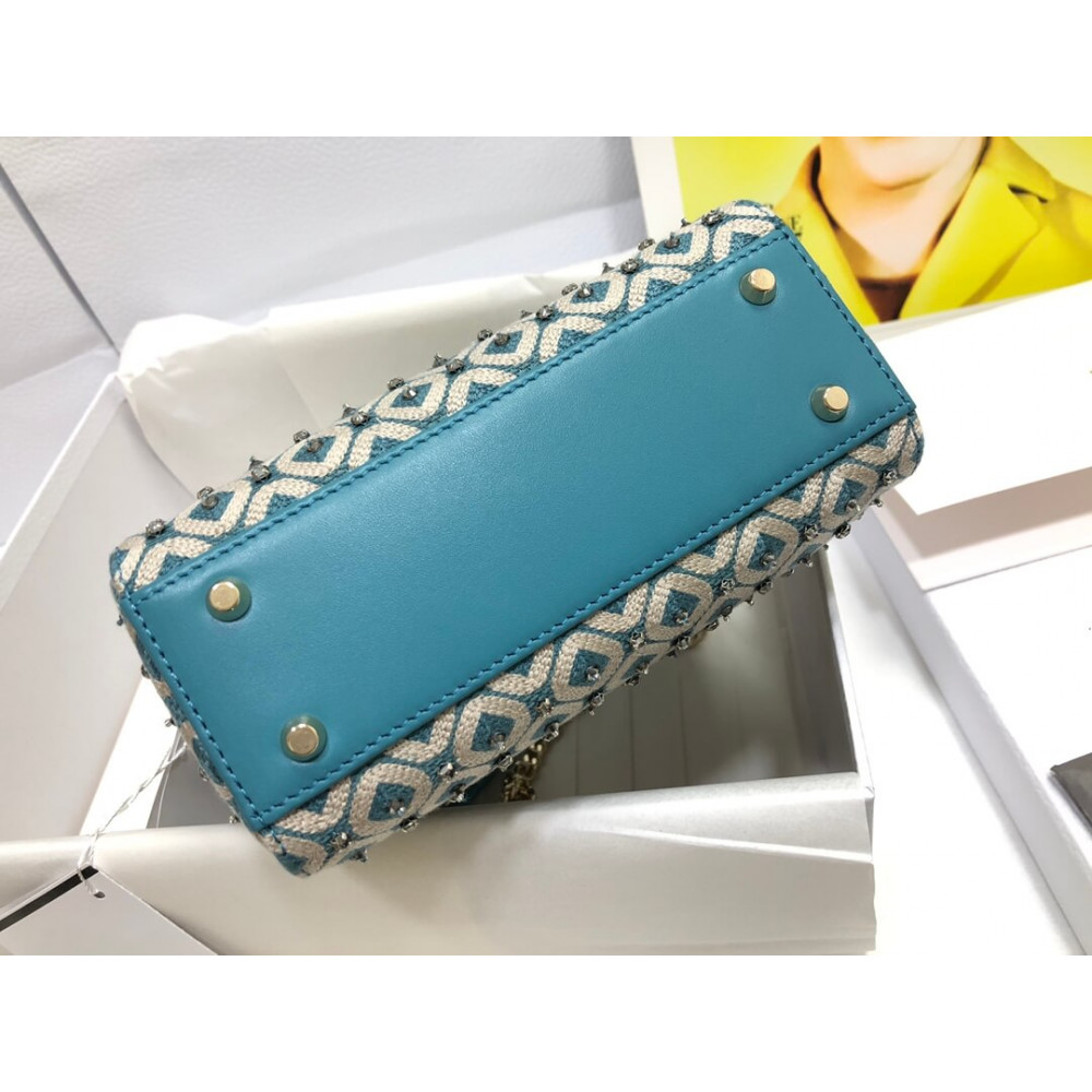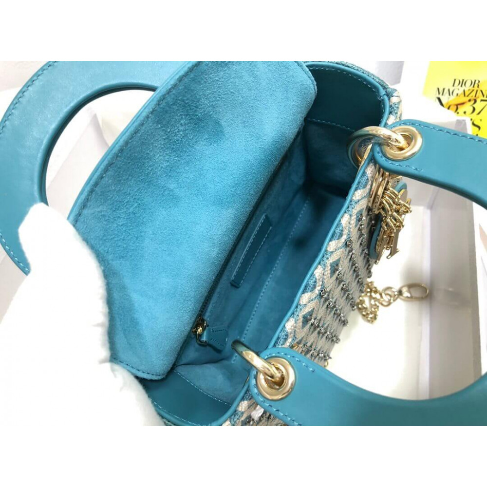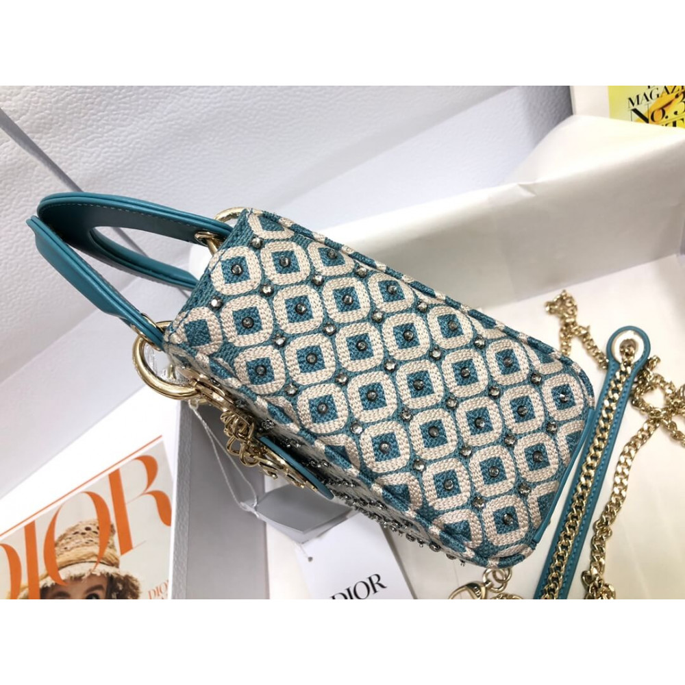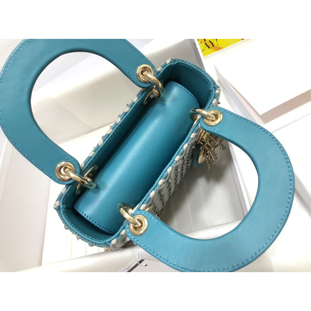 Lady Dior Mini Azure Blue Honeycomb Embroidery Bag With Two-Tone Thread And Rhinestones