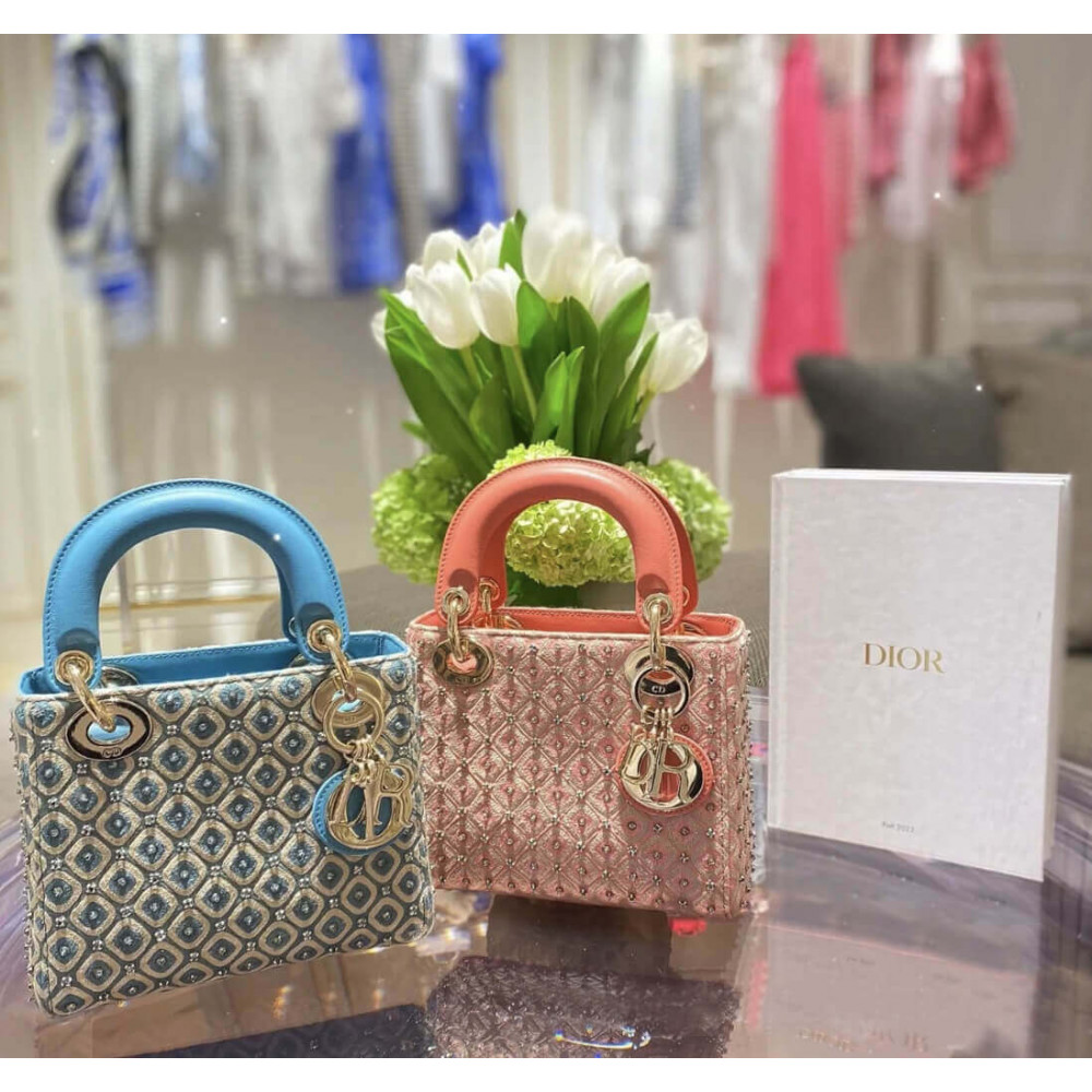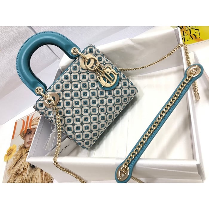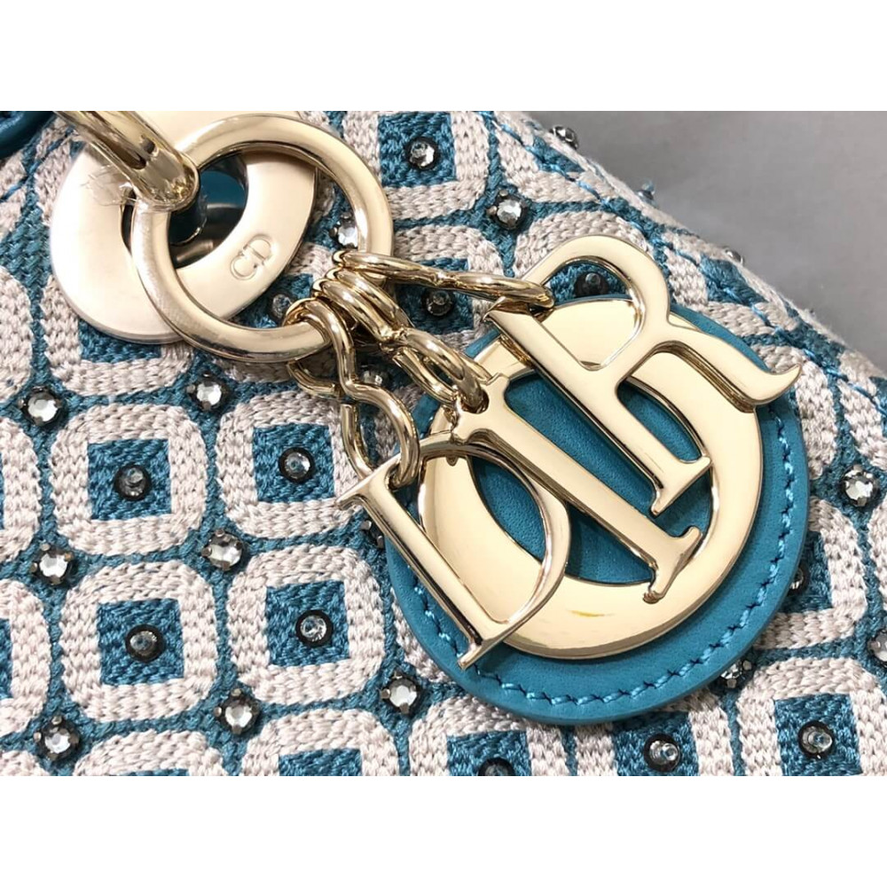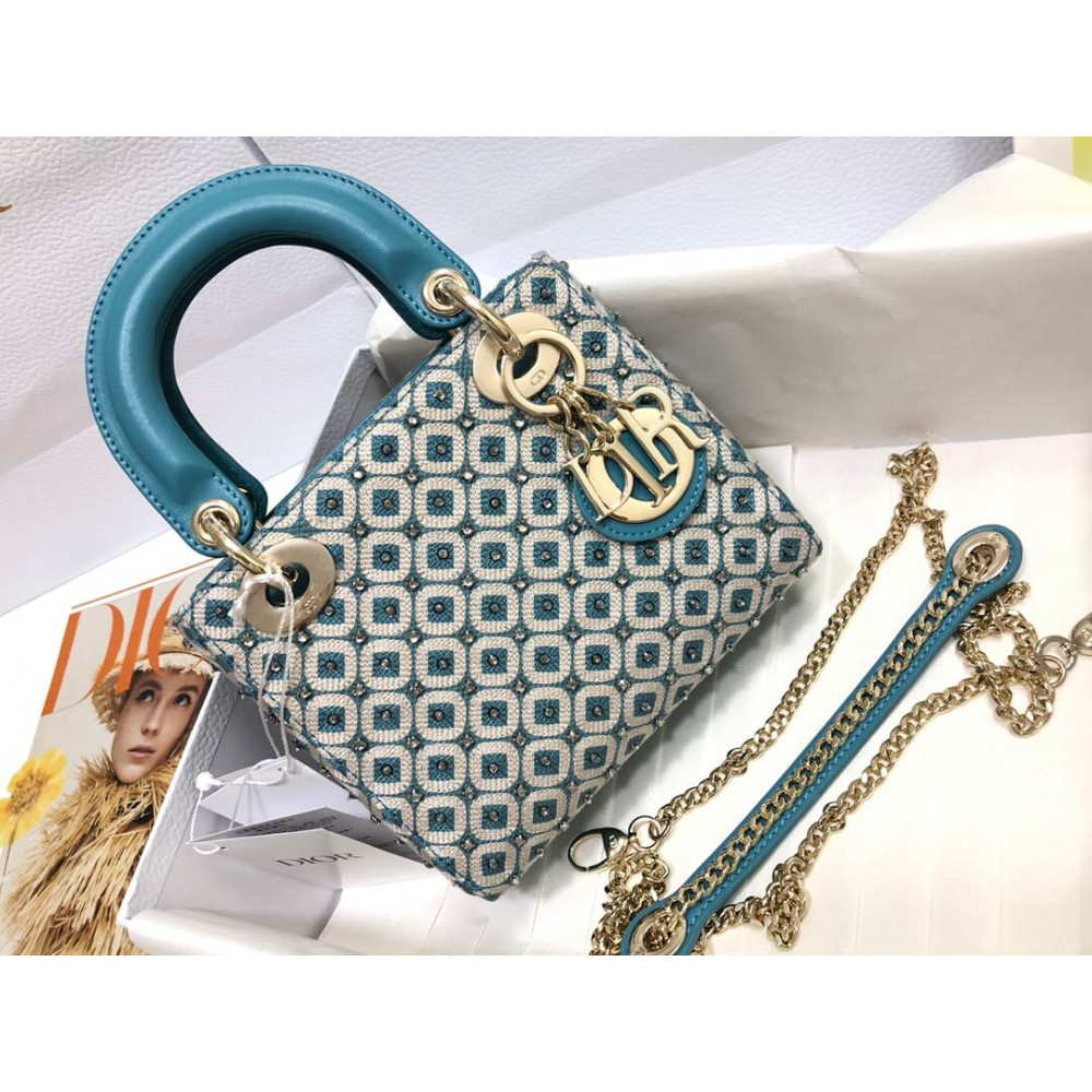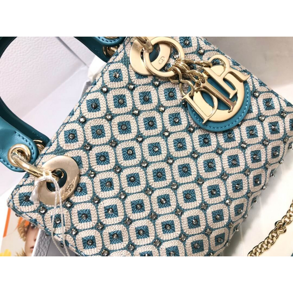 Lady Dior Mini Azure Blue Honeycomb Embroidery Bag With Two-Tone Thread And Rhinestones