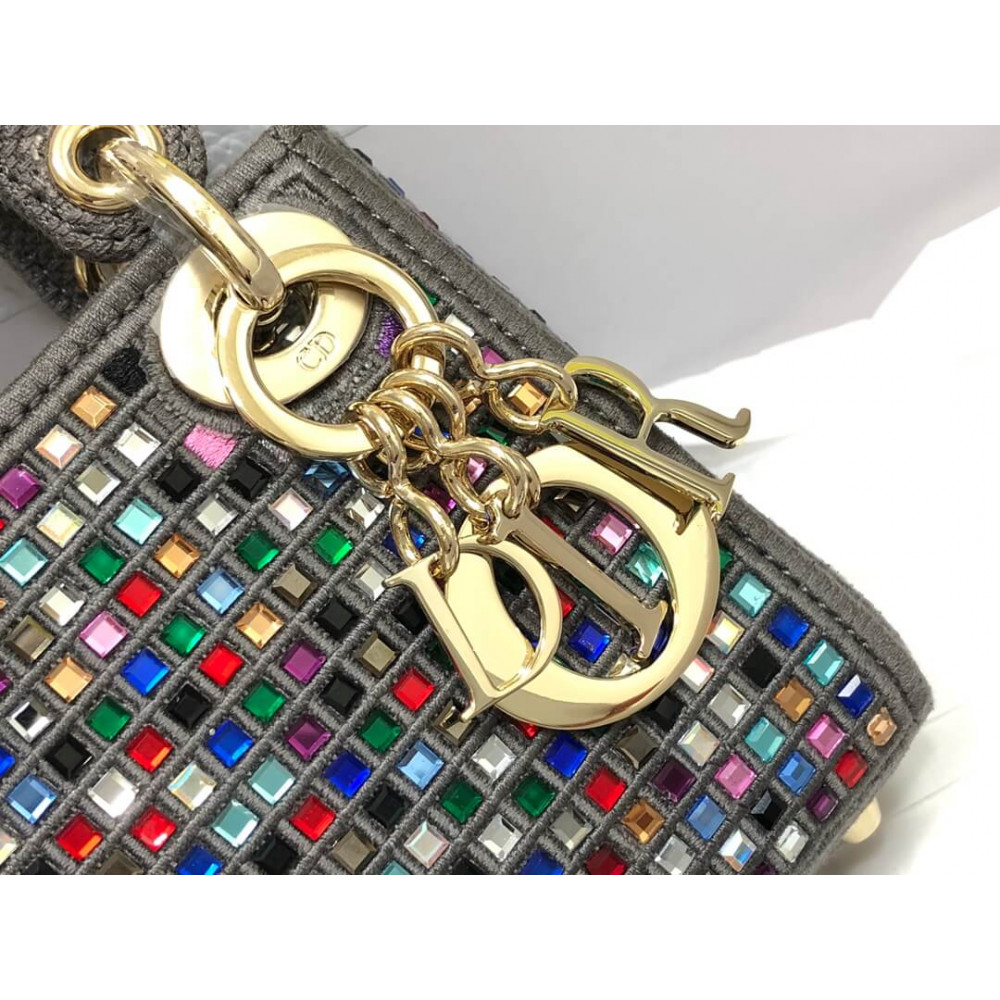 Micro Lady Dior Bag Dark Grey Metallic Canvas Embroidered with Multicolor Crystals