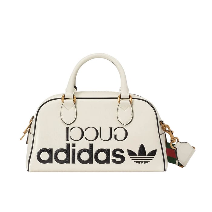 Part of the adidas x Gucci collection, this mini duffle bag features the ‘Gucci adidas’ and Trefoil print. adidas and Gucci venture into a collection, where the Web juxtaposes with the three white stripes, and the GG monogram combines with the trefoil. Pulling inspiration from the Creative Director’s memories of the ’80s and ’90s, emblematic House’s motifs mix with those of the historic sportswear brand adidas resulting in a series of hybrid looks.