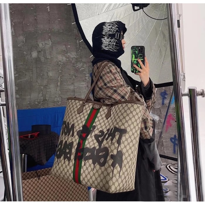 Hacker Graffiti Large Tote Bag in beige and brown coated canvas with aged gold hardware is from The Hacker Project.